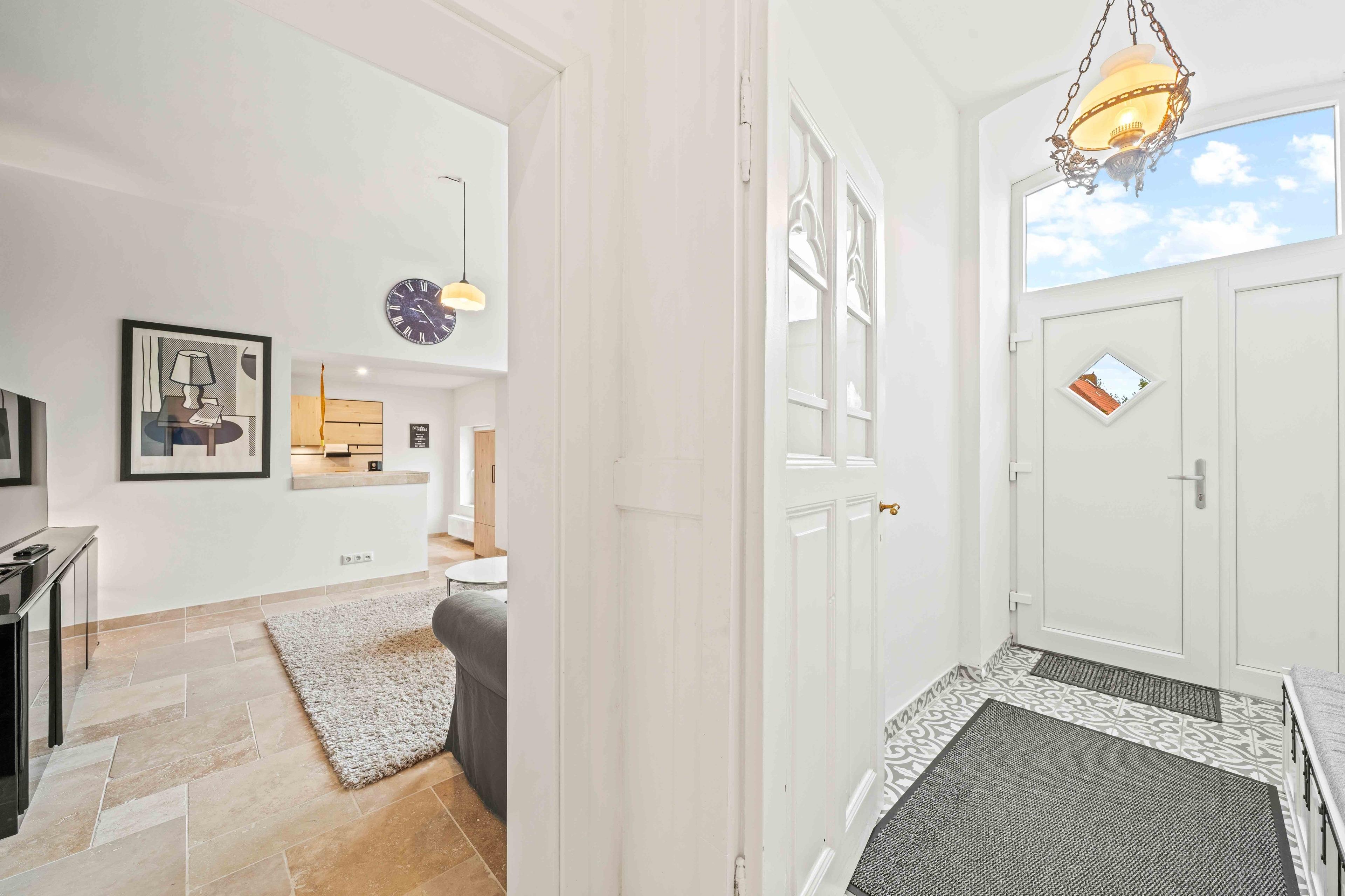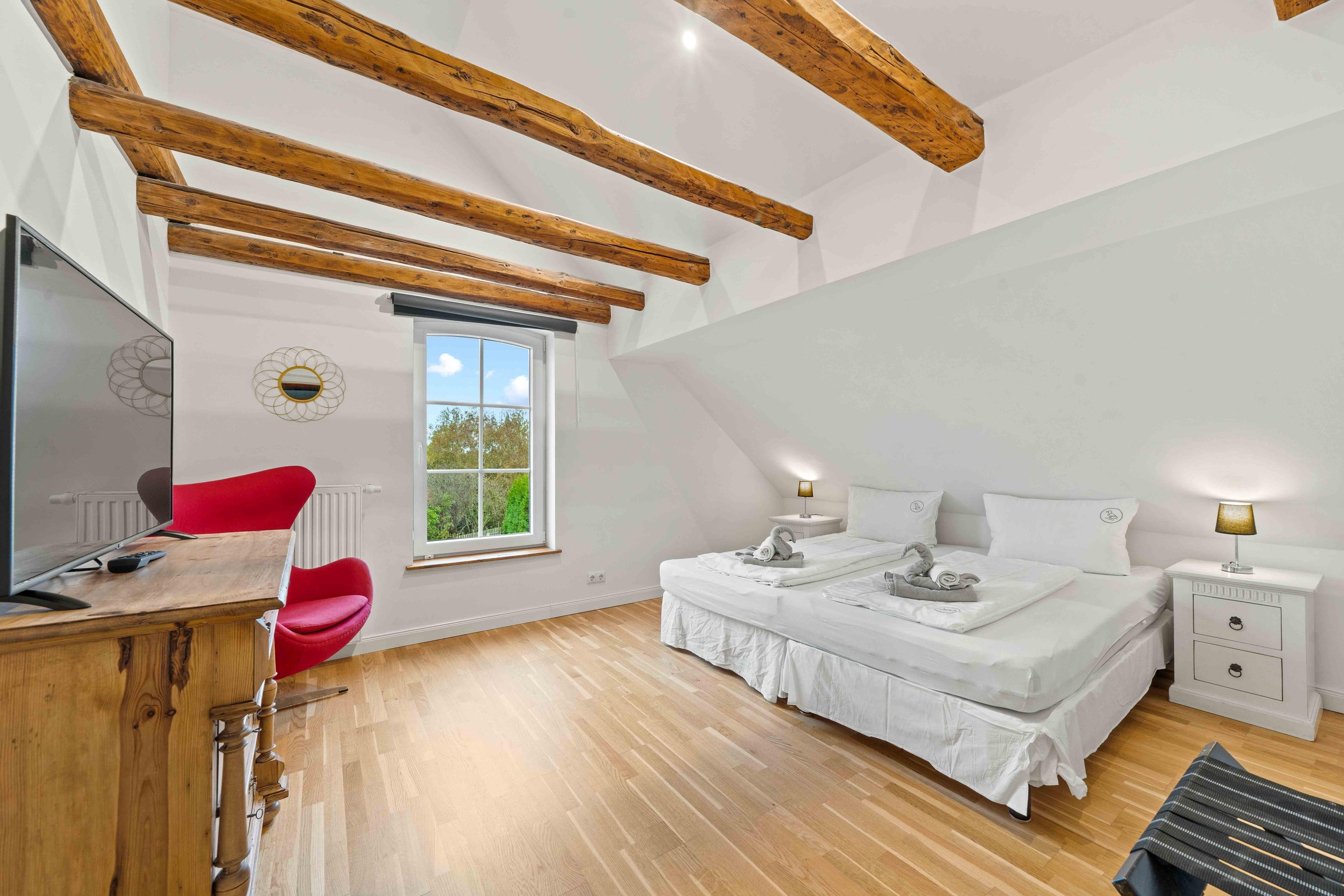 Inmitten der malerischen ostfriesischen Landschaft, im ruhigen Warfendorf Loquard, erwartet Sie das „Schmuckstück an der Nordsee“ – ein stilvolles Ferienhaus, das historische Atmosphäre mit modernem Wohnkomfort verbindet. Das großzügige Domizil befindet sich in einem ehemaligen Gulfhof, der mit viel Liebe zum Detail aufwändig saniert wurde. Hier treffen traditionelle Architektur und modernes Interieur aufeinander, wobei alte Holzbalken erhalten wurden, die das Ferienhaus besonders wohnlich und gemütlich machen. Auf 140qm Wohnfläche finden Familien und Freundesgruppen reichlich Platz zum Entspannen, denn das Haus verfügt über vier einladende Schlafzimmer, jedes davon mit einem komfortablen Doppelbett und TV ausgestattet. Zwei moderne Badezimmer sorgen für ausreichend Privatsphäre: Während eines der Bäder neben einer ebenerdigen Dusche auch eine freistehende Badewanne bietet, überzeugt das zweite Bad ebenfalls mit einer ebenerdigen Dusche und hochwertiger Ausstattung. Das Herzstück der Ferienwohnung ist der große Wohnbereich mit gemütlicher Sofaecke. Etwas abgetrennt finden Sie die voll ausgestattete, hochwertige Küche mit geräumigem Esstisch. Im Außenbereich erwartet Sie vor dem Haus eine möbilierte Terrasse, sowie eine Grün- und Steinfläche, auf der getobt oder gespielt werden kann. Auch vierbeinige Familienmitglieder sind hier herzlich willkommen.