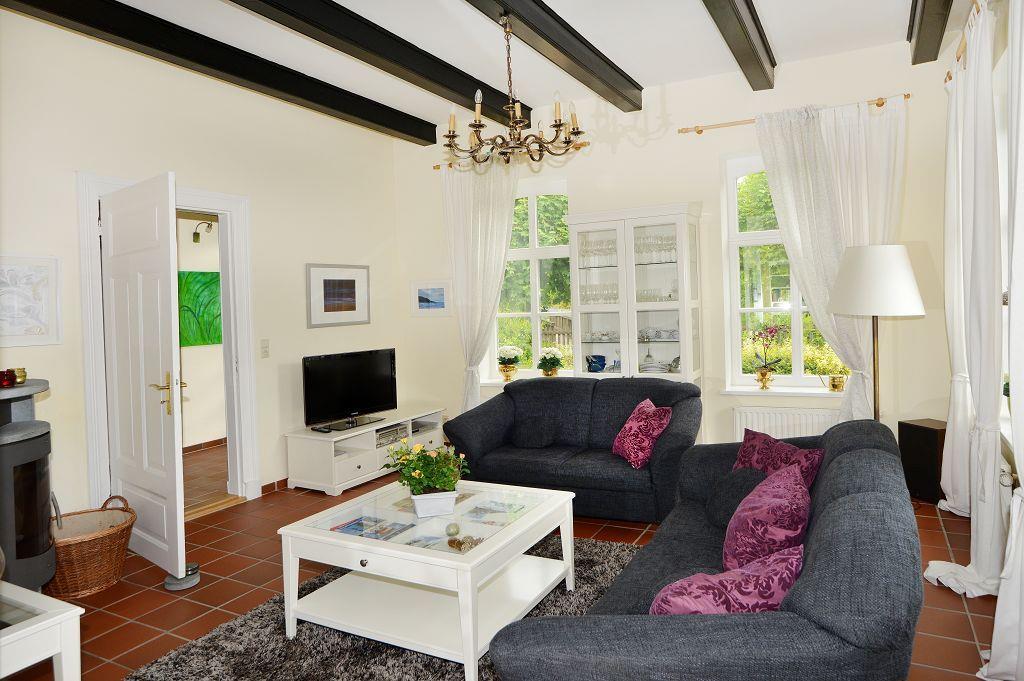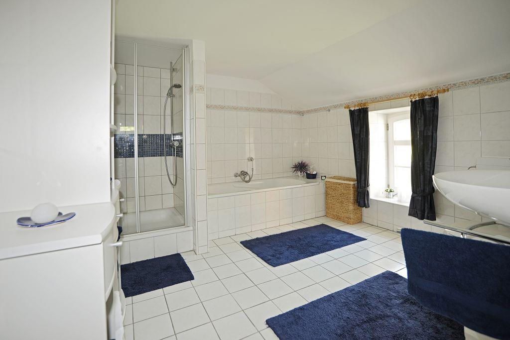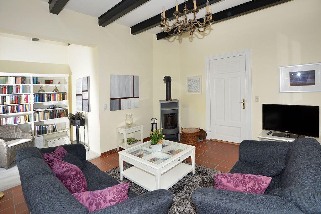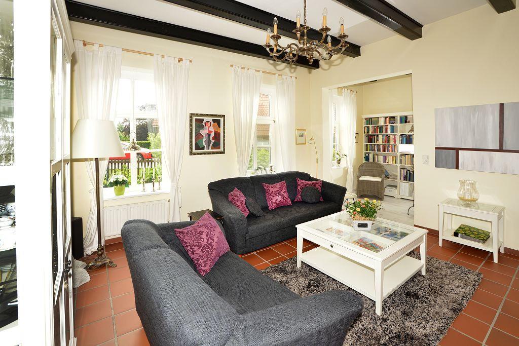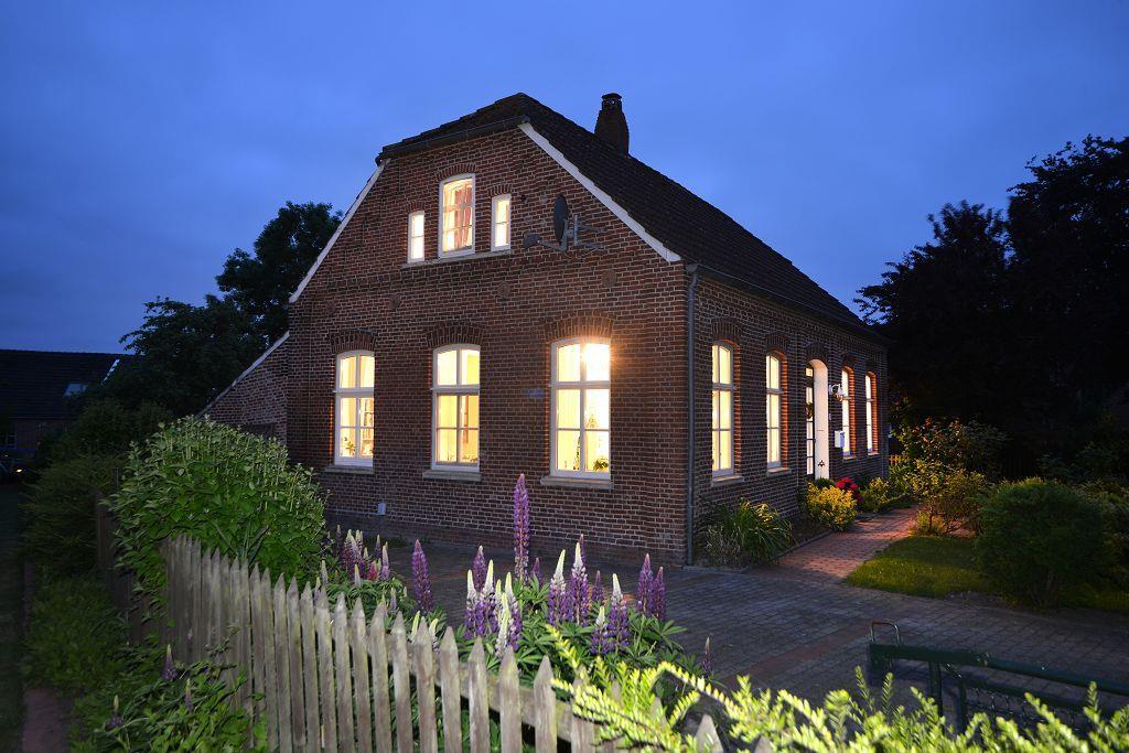 Das komfortable restaurierte Ferienhaus von 1882 befindet sich im historischen Ortskern von Loquard. mit Saunahütte und Strandkorb im gepflegten, schönen Garten. Jeder Raum ein Wohntraum! Durch den großzügigen Flur gelangen Sie zu den zwei herrschaftlichen Wohnräumen mit jeweils fünf großen Fenstern. Die „Upkammer“, der Nebenraum des westlichen Wohnzimmers, wurde wie nach alter Überlieferung wieder als separates Schlafzimmer im Erdgeschoss hergerichtet. Das gemütliche westliche Wohnzimmer verfügt über einen schönen Kaminofen, einen Fernseher mit DVD-Player, eine Stereo-Anlage und eine Leseecke. Im Süden des Ferienhauses liegen ein großes Badezimmer, ein zusätzliches Duschbad, der Hauswirtschaftsraum und die Küche. Der große Esstisch in der modern ausgestatteten Wohnküche lädt zum gemeinsamen Essen, Klönen und Spielen ein. Von hier erreichen Sie auch die Südterrasse mit Blick auf den liebevoll bepflanzten ruhigen Garten.