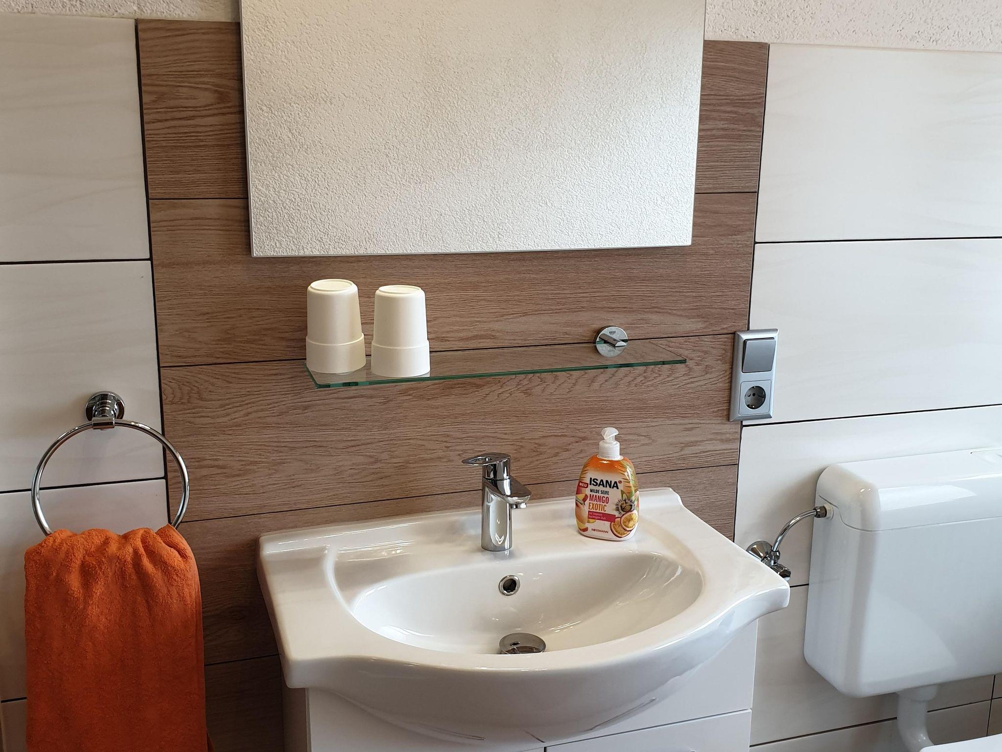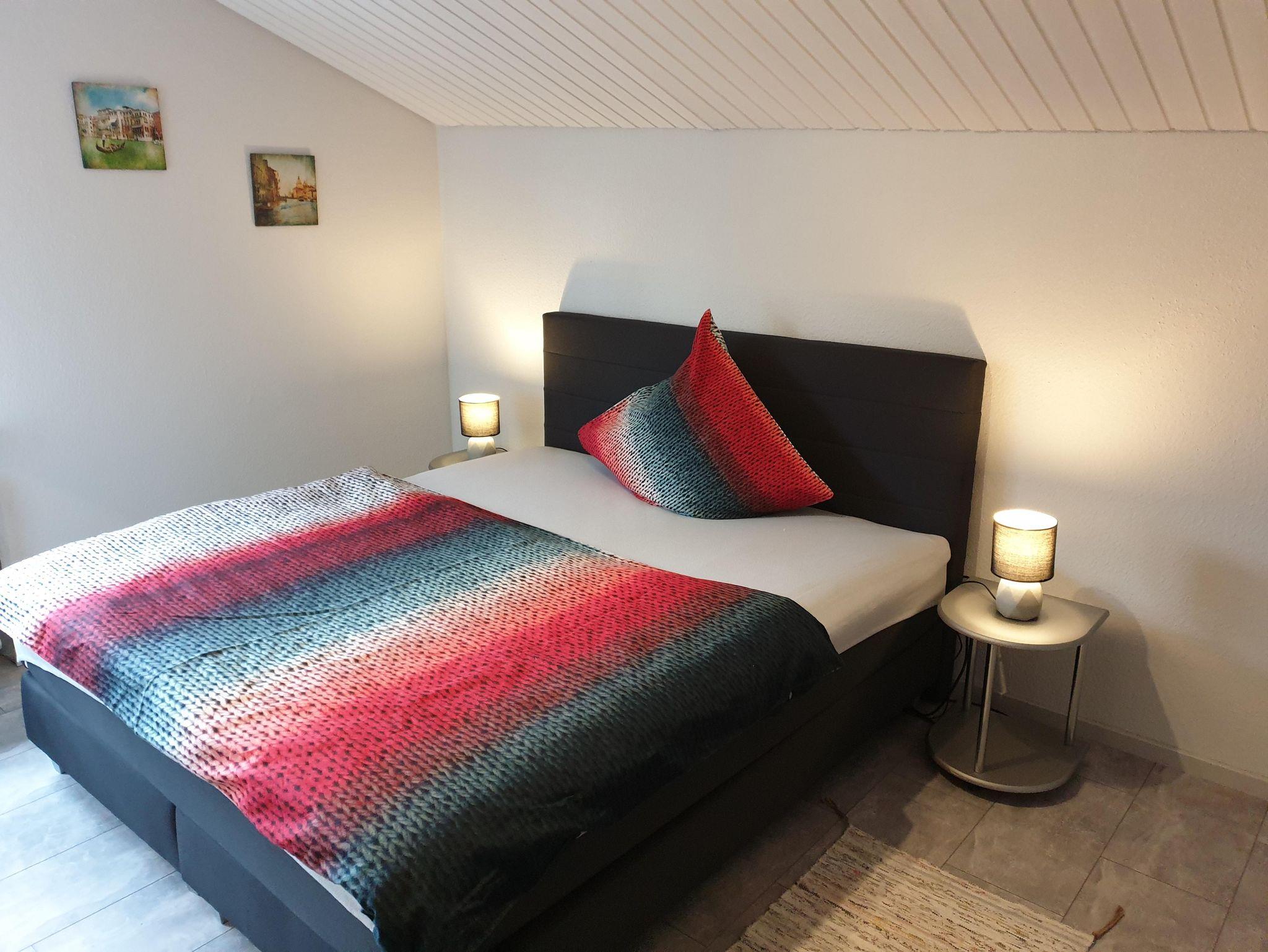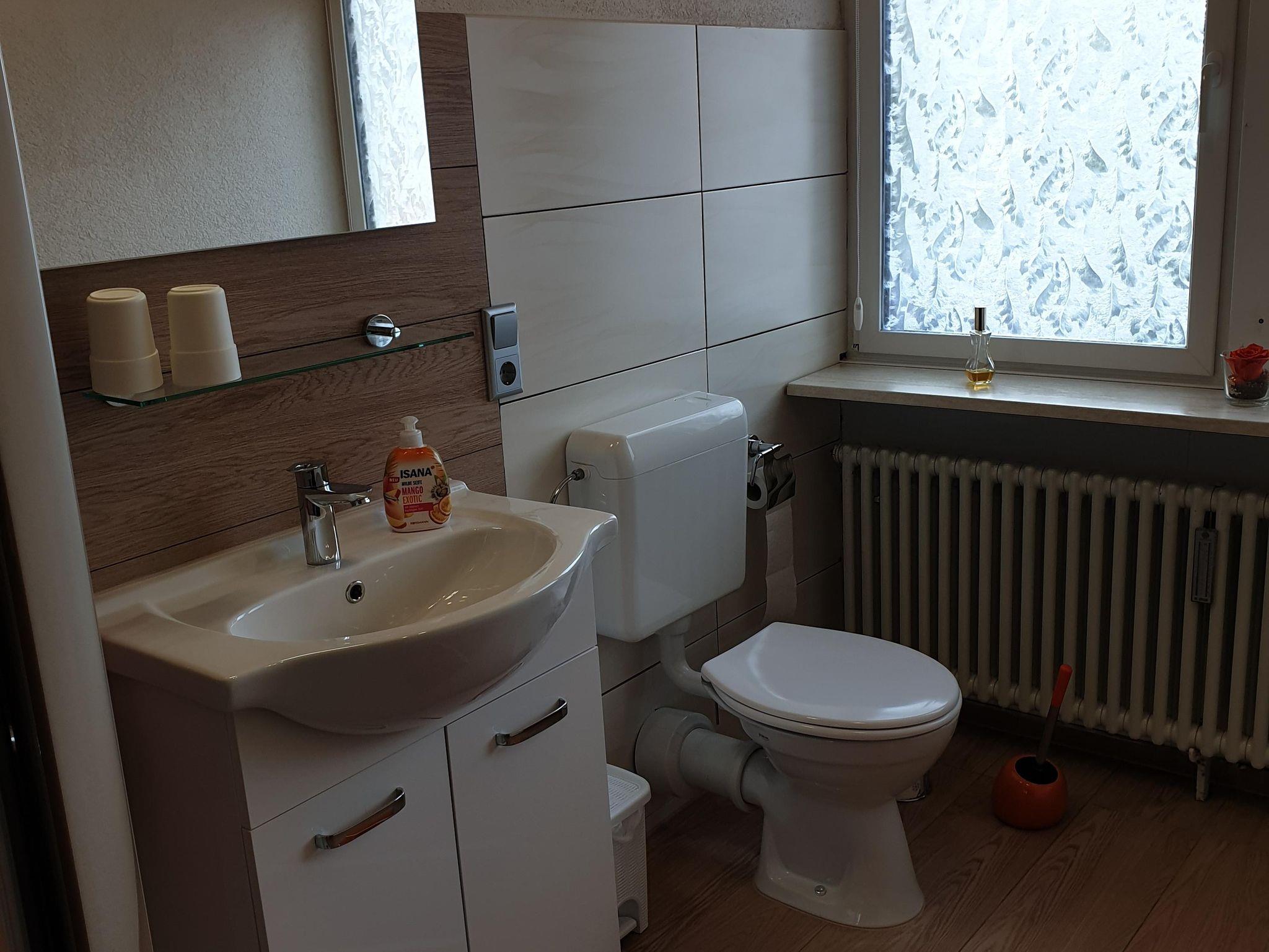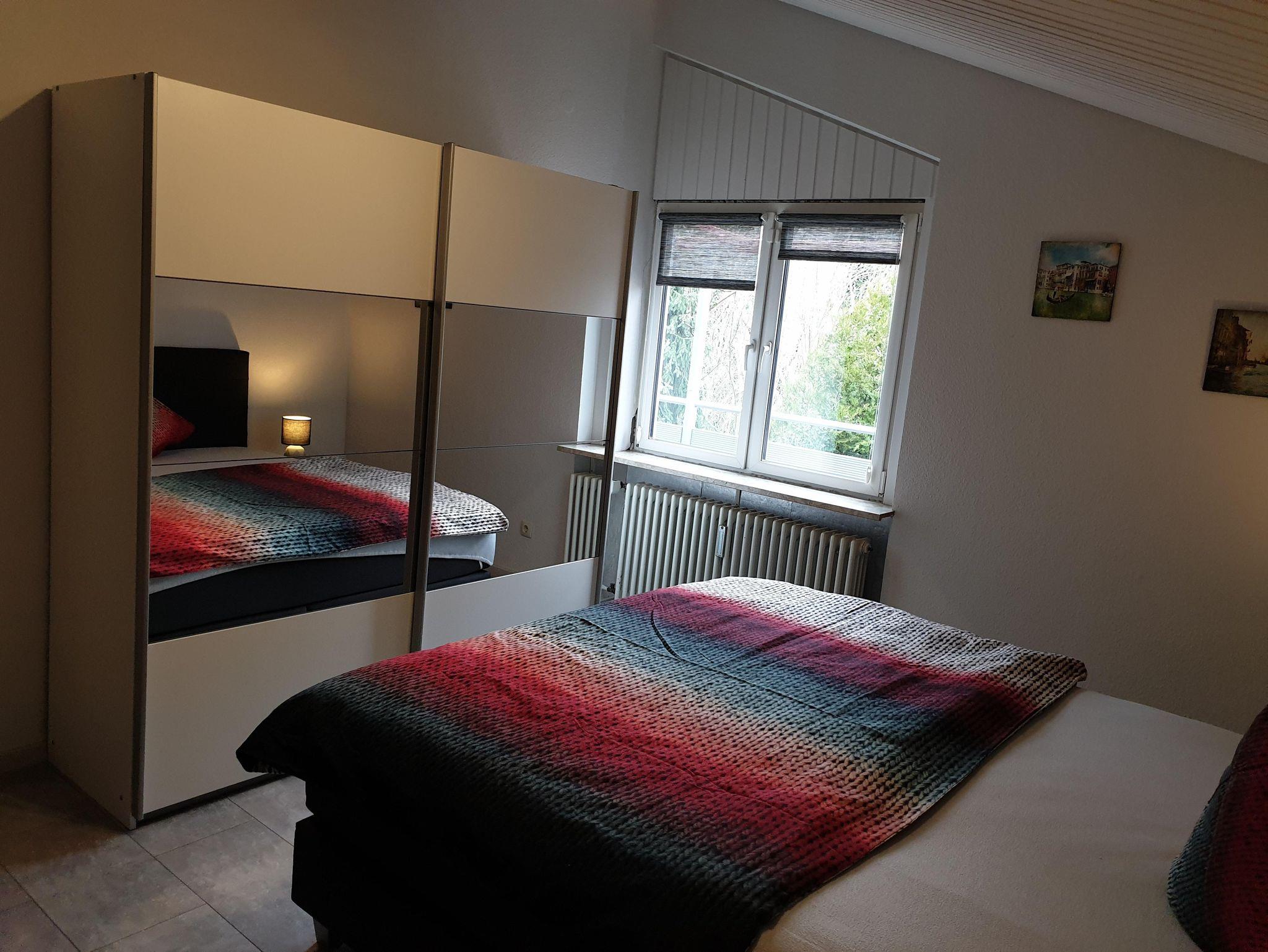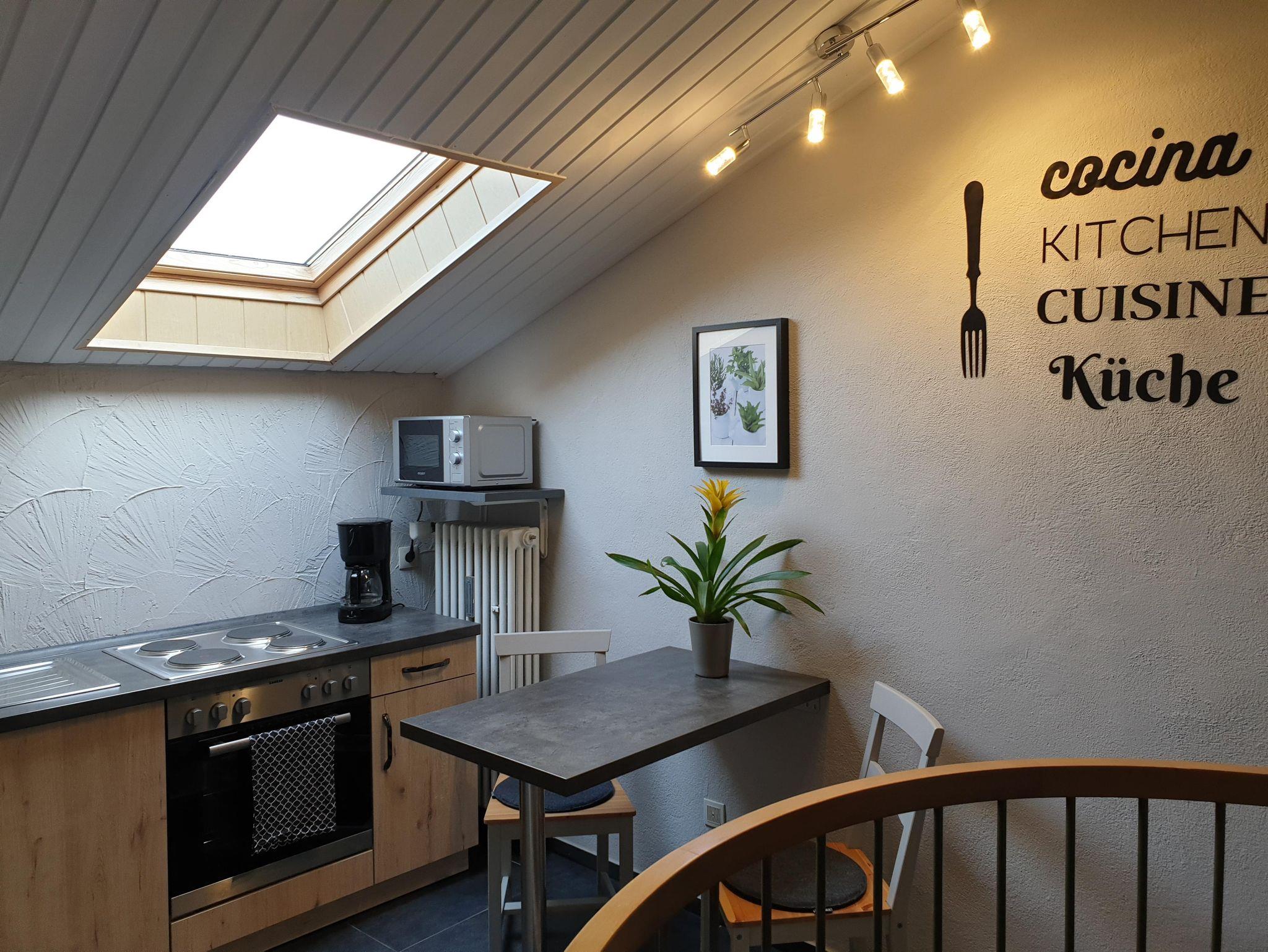Die Ferienwohnung mit separatem Eingang befindet sich im Dachgeschoss eines Ein- bis Zweifamilienhauses. Das gemütliche Appartement verfügt über ein Schlafzimmer mit Doppelbett, ein Wohnzimmer sowie eine voll ausgestattete Einbauküche mit Elektroherd und Backofen, Toaster, Mikrowelle, Kühlschrank mit Gefrierfach und Kaffeemaschine. Auf Anfrage kann ein zusätzliches Kind auf der Couch im Wohnzimmer übernachten. Das Badezimmer ist mit einer Dusche und einem WC ausgestattet. Der großzügige Balkon lädt zum Verweilen ein. Ein PKW-Stellplatz steht direkt vor dem Haus zur Verfügung.