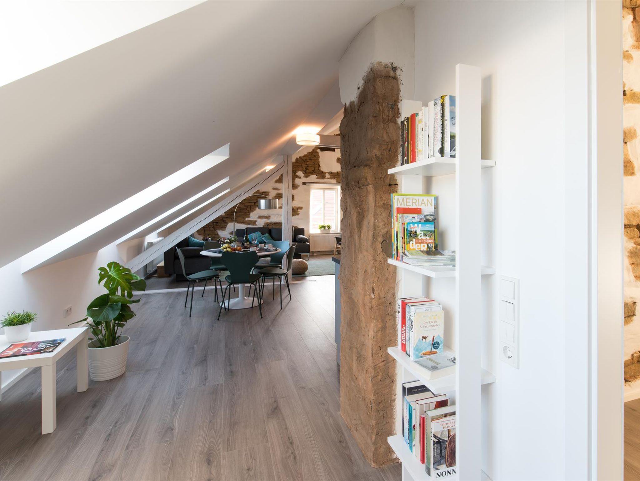 Unser Bücherloft ist eine neurenovierte und neumöbilierte schöne helle und freundliche Dachwohnung. Es ist die gesamte Fläche unseres Hauses mit offener Dachspitze. Alle Fenster der Wohnung sind verdunkelbar. Ein Schlafzimmer mit Doppelbett, Sitzecke und Schrank, Platz für Babyreisebett. Das große Wohnzimmer ist mit zwei Schlafcouchen (1,40 x 2,00 Meter) ausgestattet und WLAN, LAN, TV (55 Zoll Bildschirm), Bluetooth Audiosystem. Einbauküche mit Essecke, Leseecke mit Schreibtisch, Badezimmer mit Dusche/WC. Auch ein kleiner Abstellraum ist vorhanden.