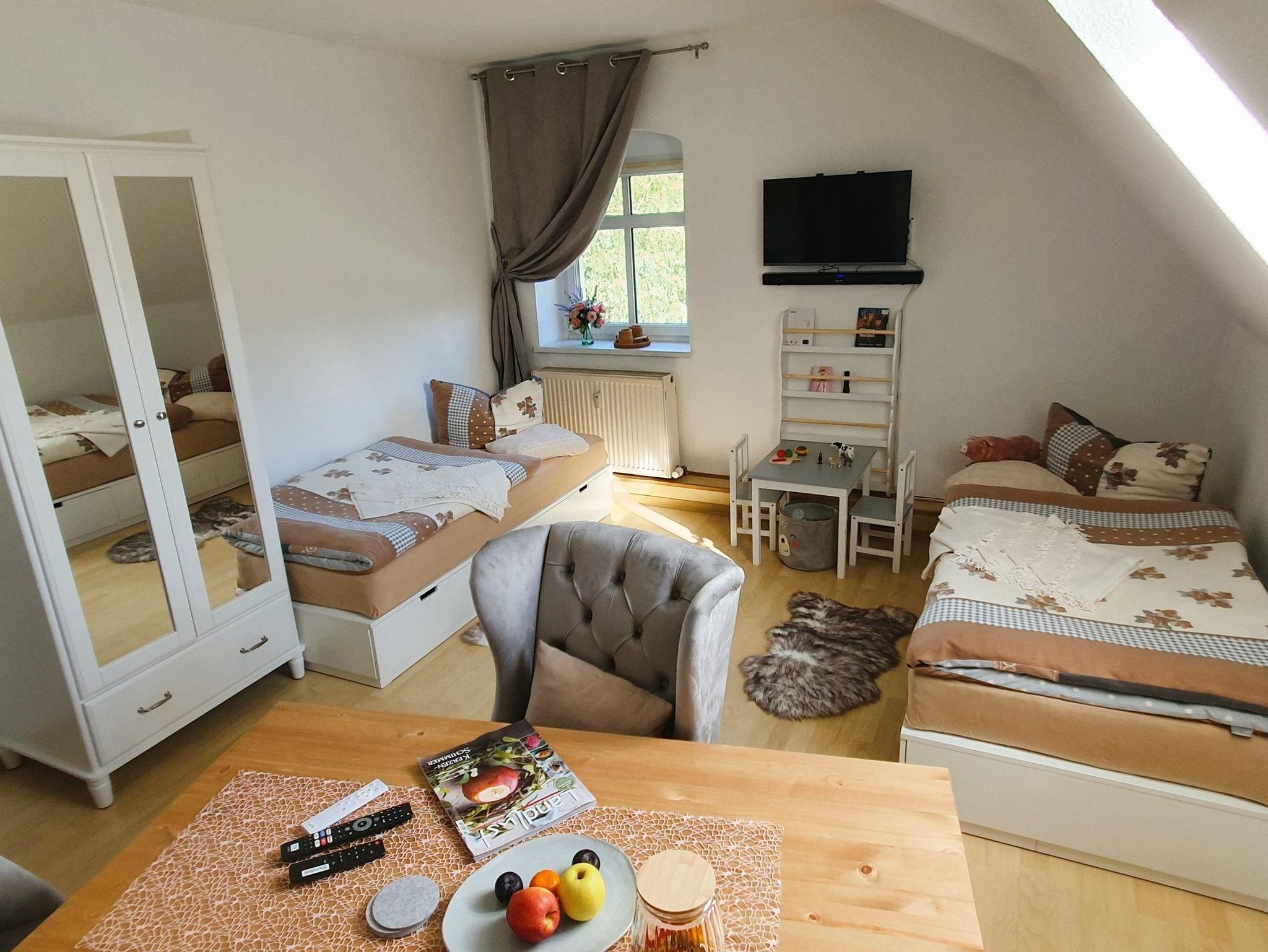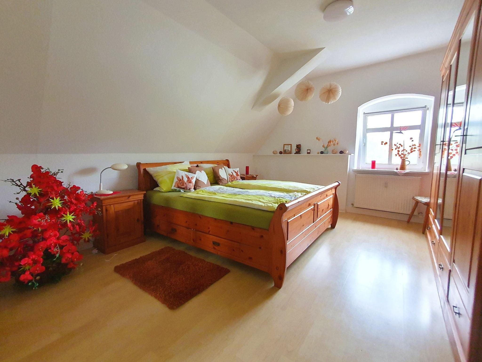 Im Dachgeschoss befindet sich die gemütliche 2-Zimmer-Wohnung mit Küche, zwei Schlafzimmern und Bad. Sie verfügt über ein Doppelbett im ersten Schlafzimmer und zwei Einzelbetten im zweiten Schlafzimmer.