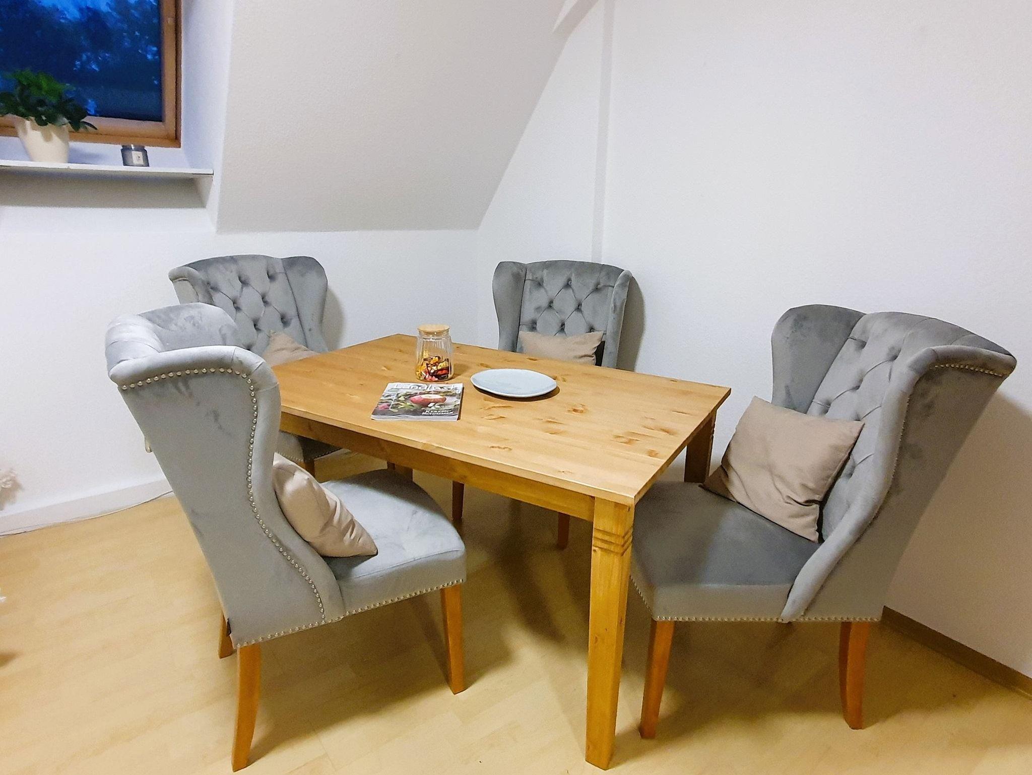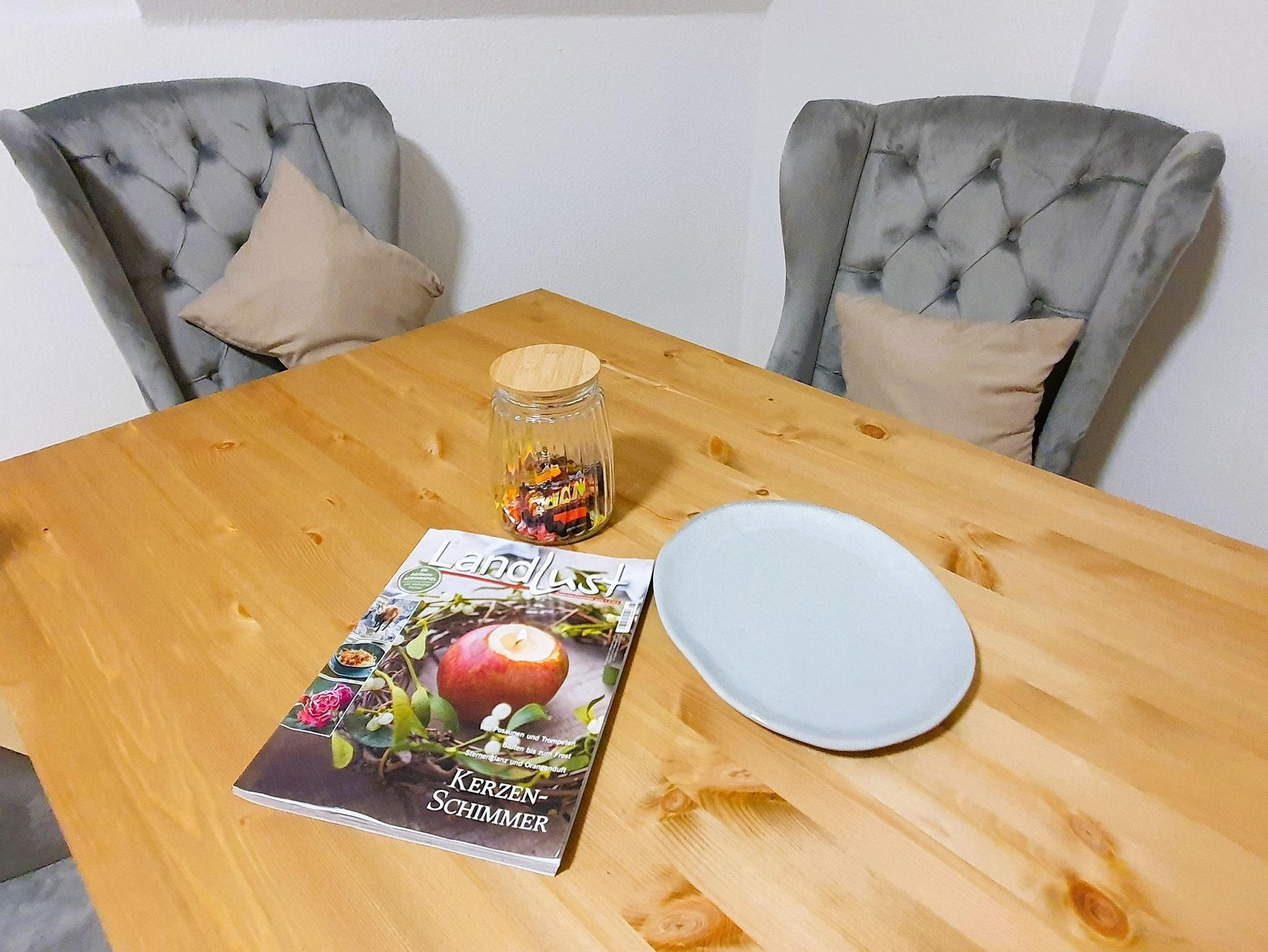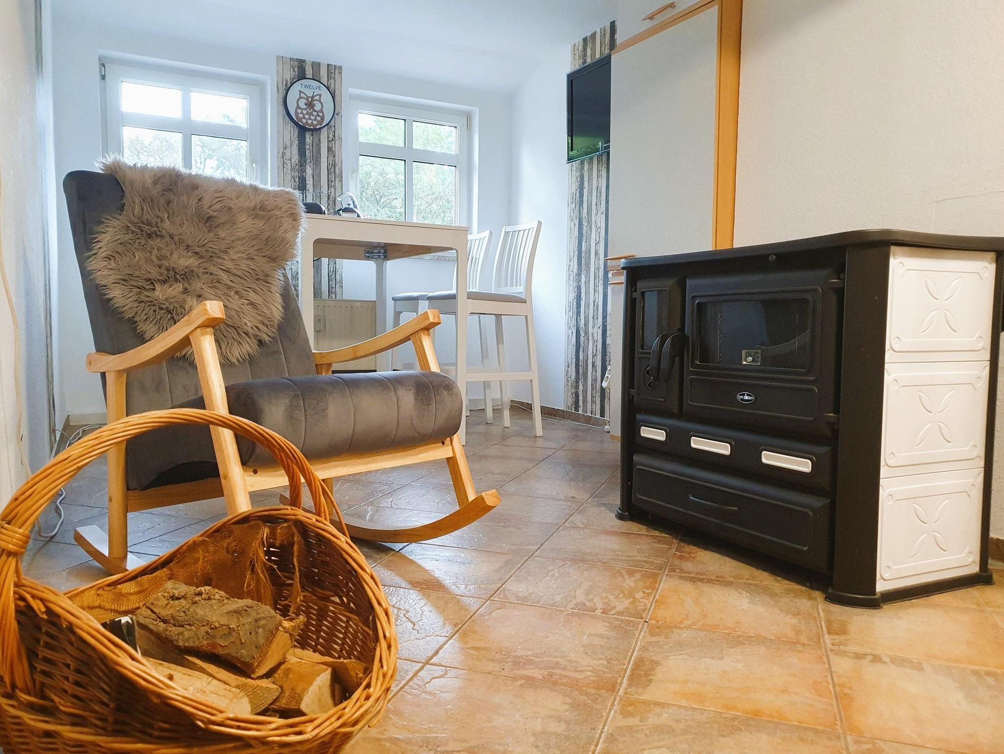 Die Küche ist ausgestattet mit einem Bartisch mit vier Stühlen, einem Kühlschrank mit Gefrierfach, einer Senseo-Kaffeemaschine (und ein paar Kaffee-Pads), einem Wasserkocher (verschiedene Teesorten vorrätig), einem Toaster, einem Standherd mit Glaskeramikkochfeld und Backofen, einer Wasseraufbereitungsanlage (gefiltertes Trinkwasser), einem Holzherd/Kamin (Holz gegen Aufpreis erhältlich) sowie einem Schaukelstuhl.