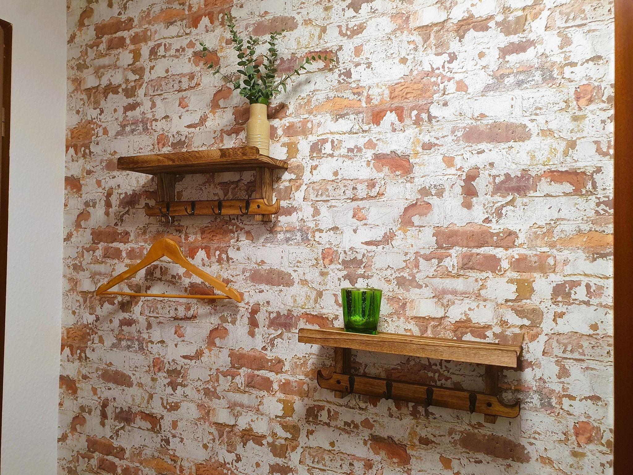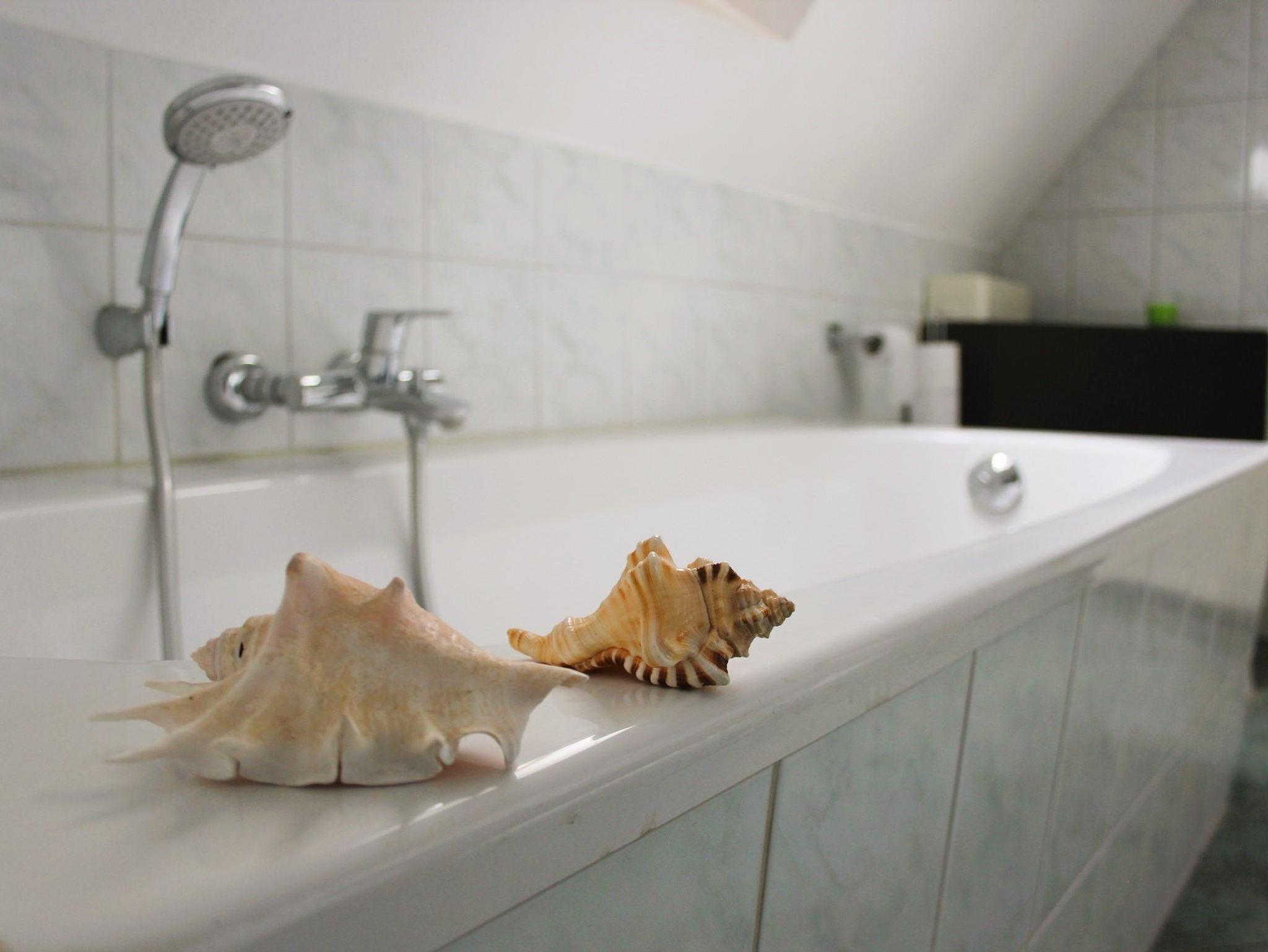Im Badezimmer sind eine Duschkabine, eine Badewanne, das WC und ein ausziehbarer Wandtrockner verbaut. Handtücher und Bettwäsche sind im Mietpreis inbegriffen.
