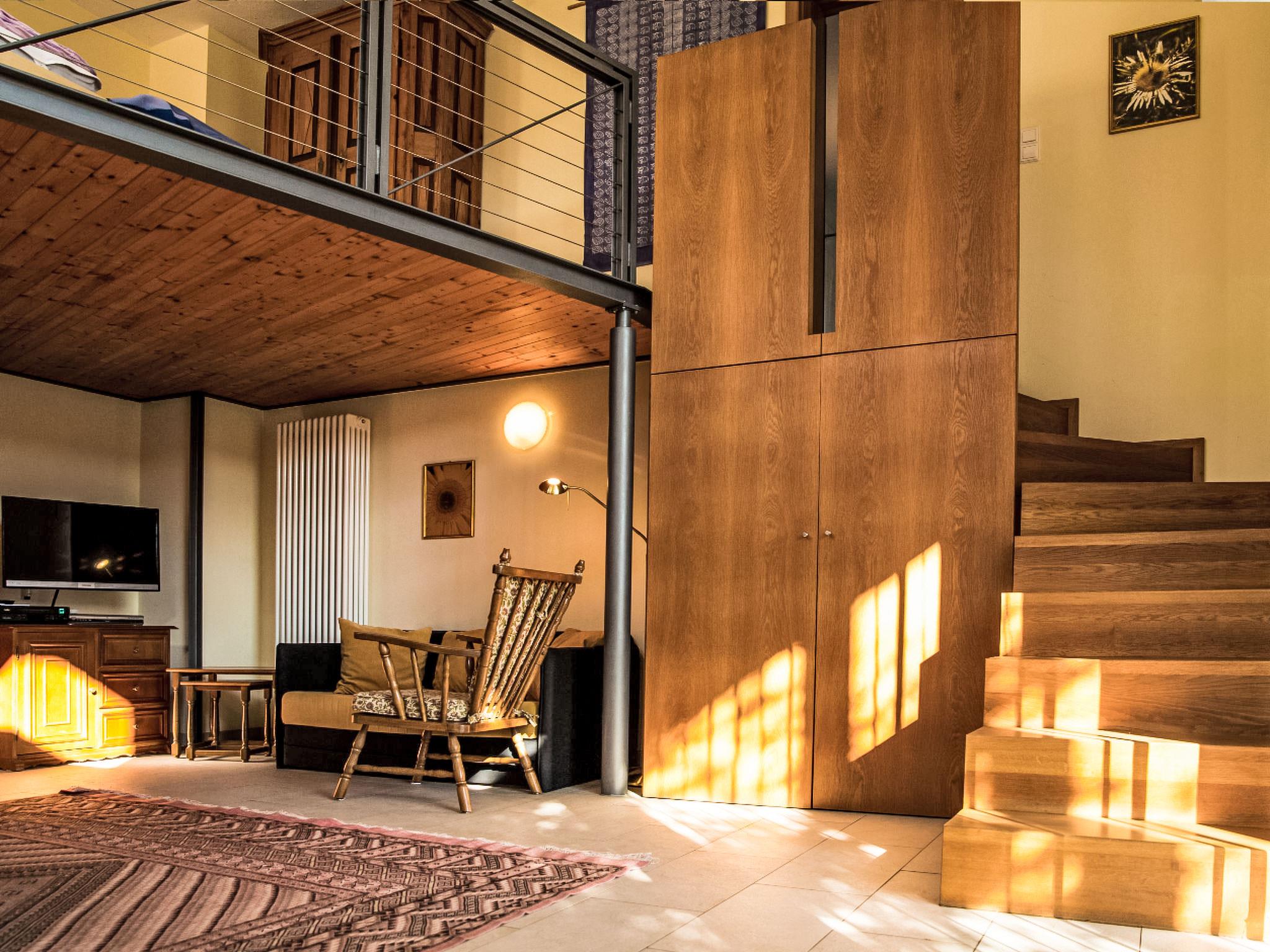 "Rosengarten", 1-room granny flat 62 m2 on 2 levels, on the ground floor. Modern and tasteful furnishings: living/dining room with satellite TV (flat screen), video, radio and DVD. Exit to the garden, to the terrace. Kitchenette (mini-oven, dishwasher, 4 ceramic glass hob hotplates, toaster, kettle, microwave, freezer, electric coffee machine). Shower, sep. WC. Floor heating. Upper floor: open gallery with 1 double bed. Terrace. Terrace furniture. Facilities: sauna (extra). Internet (WiFi, free). Please note: non-smokers only. Maximum 1 pet/ dog allowed. Private entrance. Spacious shower with exit to a private outdoor seating area. Large wildrose garden. Instead of an enclosed bedroom, some sleeping areas are located in an open-plan area (gallery, alcove, etc.).