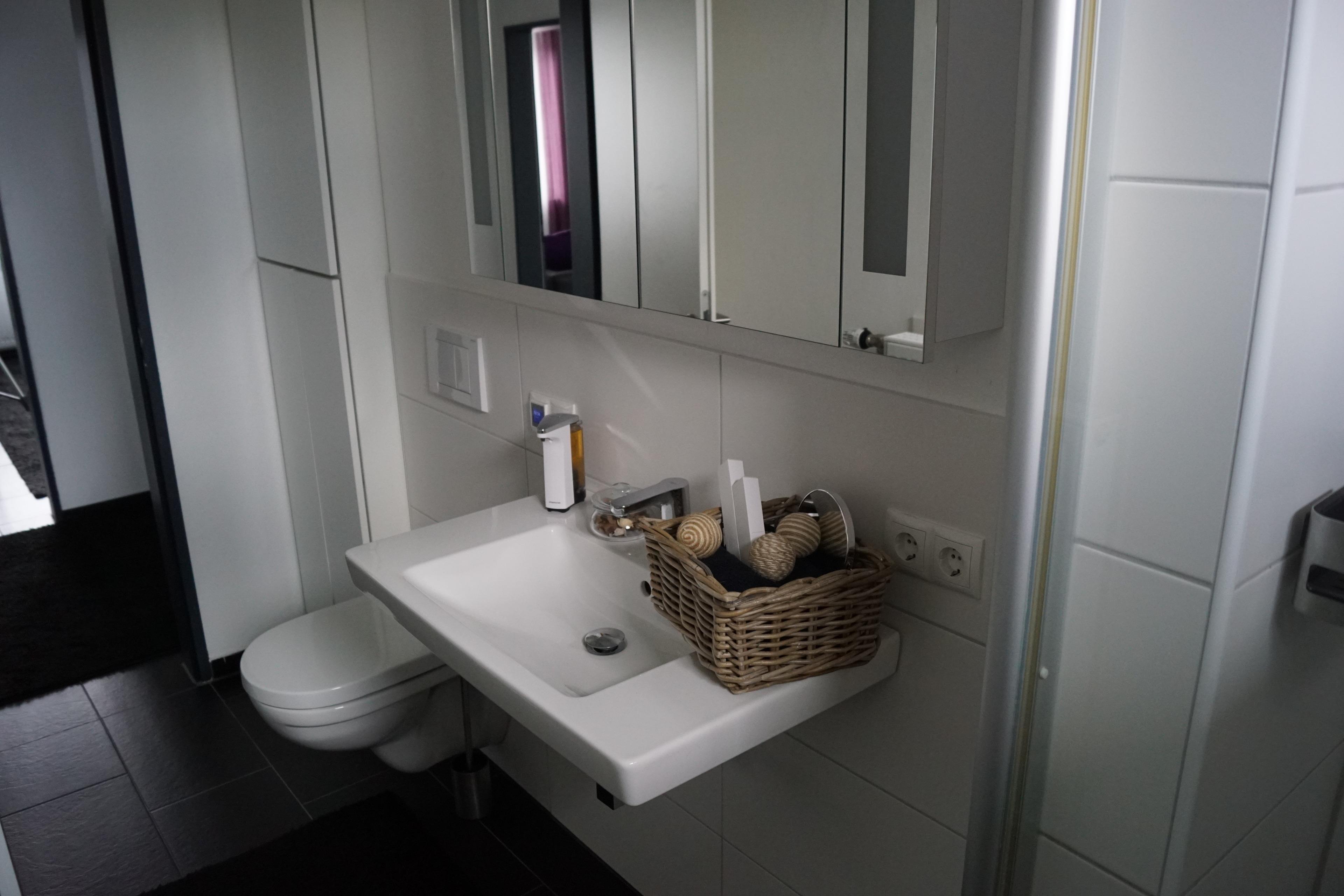 Das Bad bietet Ihnen auf 6 qm eine besonders hochwertige Ausstattung. Neben einem WC inkl. Softclose, sensorgesteuerte Waschtischarmatur sowie Seifenspender ist ein Softclose-Spiegelschrank mit intergrierter Beleuchtung vorhanden.