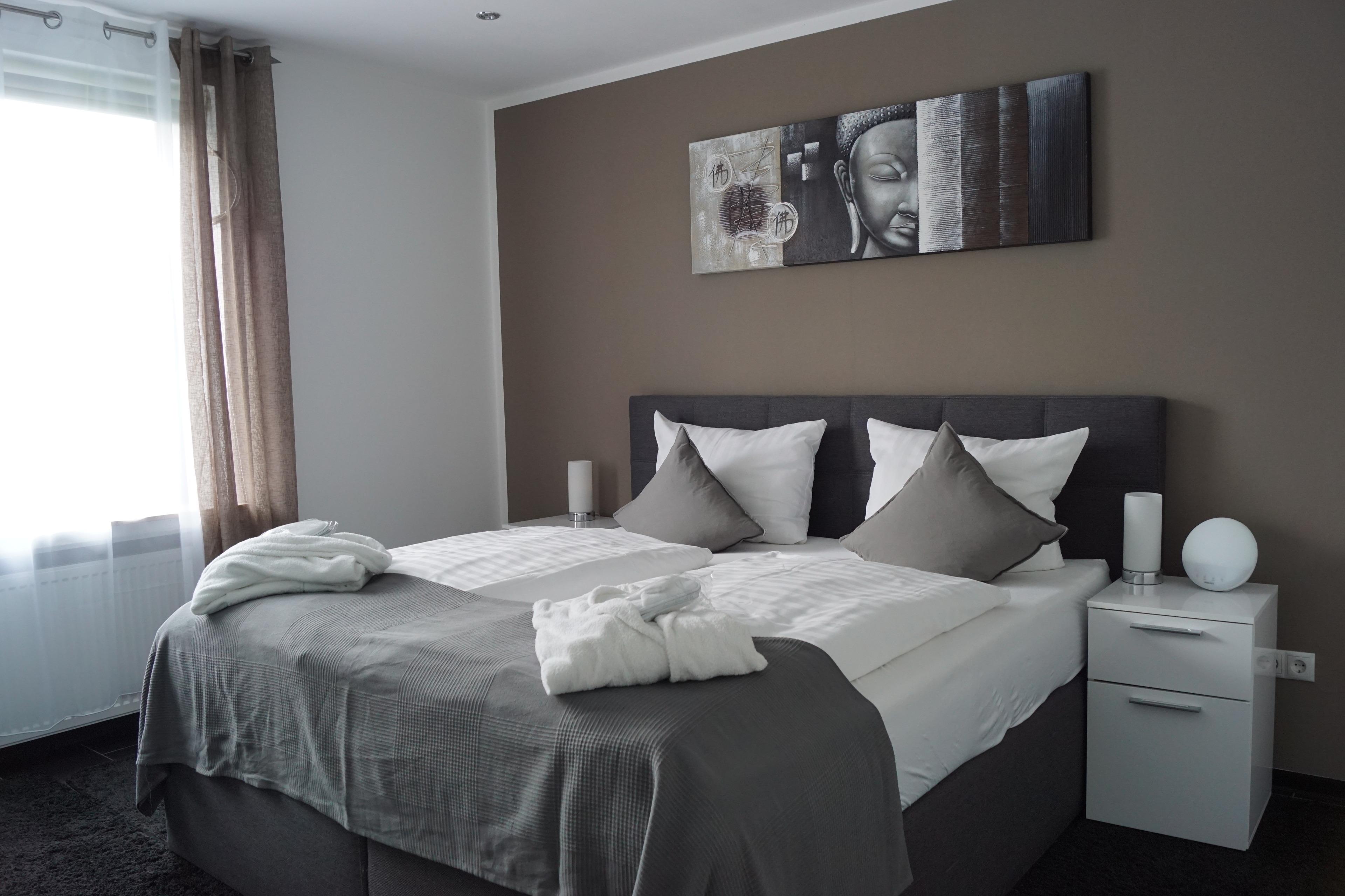 Auf knapp 18 qm erwartet Sie ein gemütliches Kingsize Boxspringbett (1.800 x 2.000 mm), das auch als Einzelbetten (2x 900 x 2.000 mm) nutzbar ist, sowie ein 2.800 mm Schwebetürenschrank, der Ihnen ausreichend Stauraum bietet.