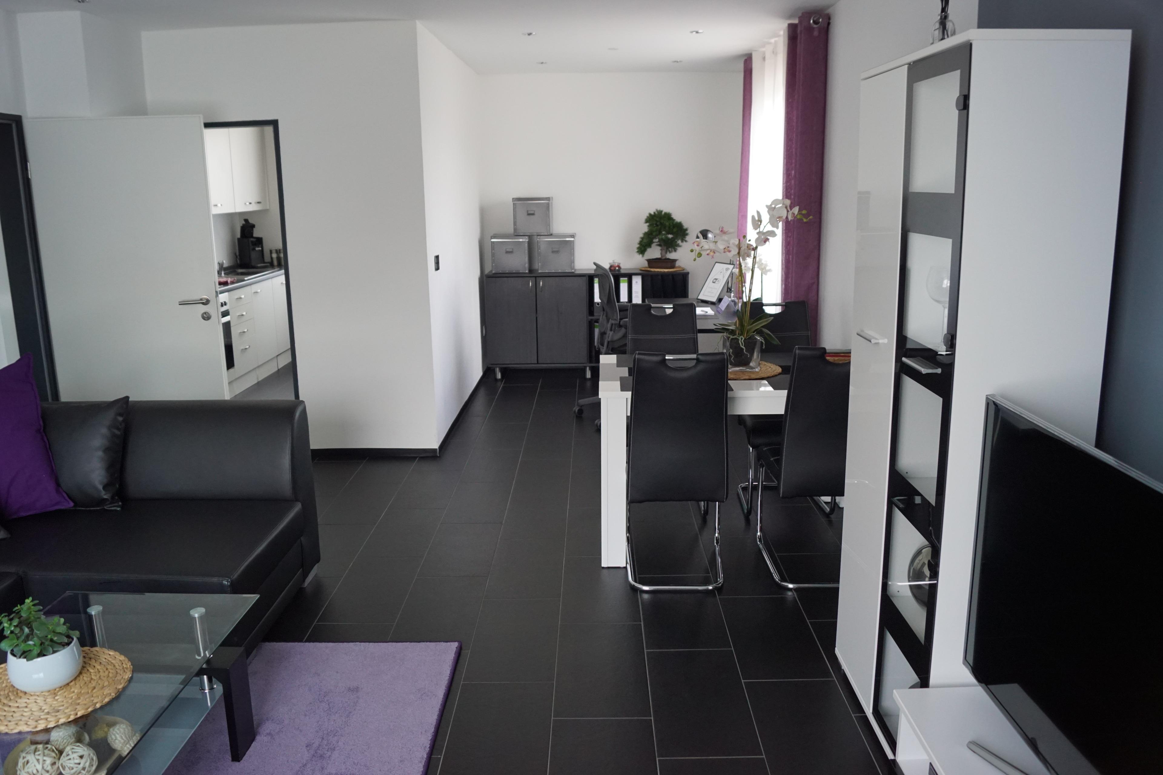 Der 6 qm Büro-/Arbeitsbereich ist als offene Nische konzipiert und somit ein dezenter Bestandteil des Wohnzimmers. Hier steht Ihnen ein ca. 1.600 mm langes Sideboard für Ihre Unterlagen zur Verfügung.