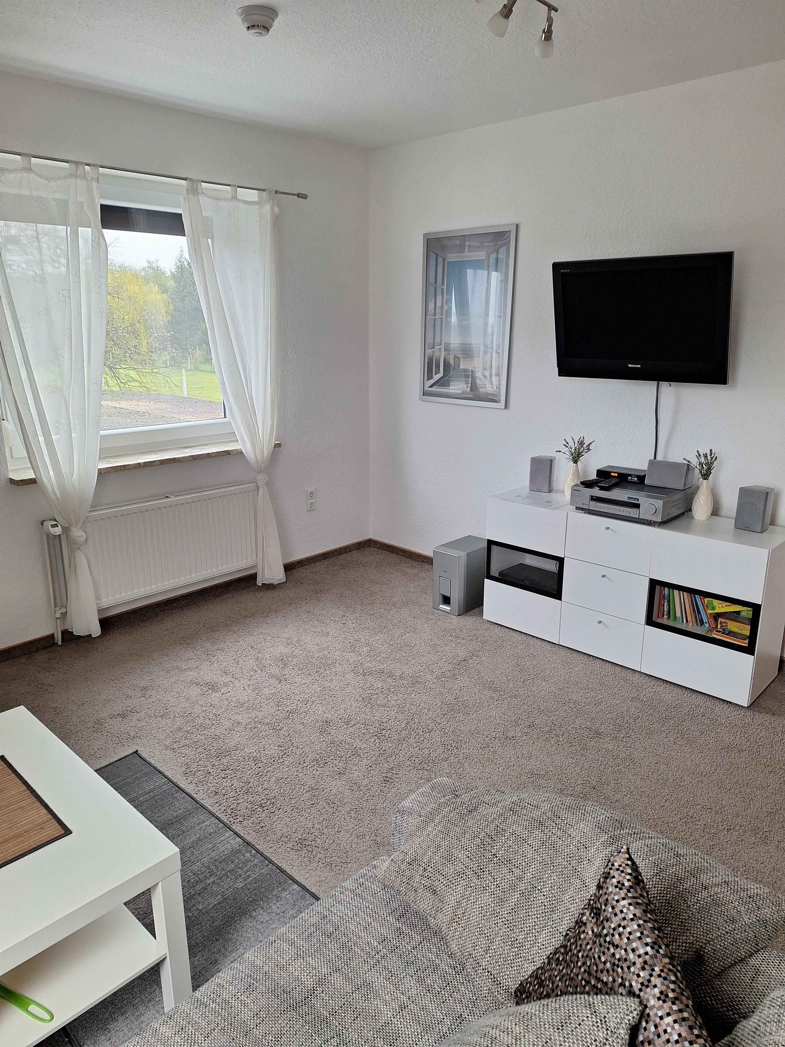 Wohnzimmer mit großer Couch und Sat-Fernsehen.