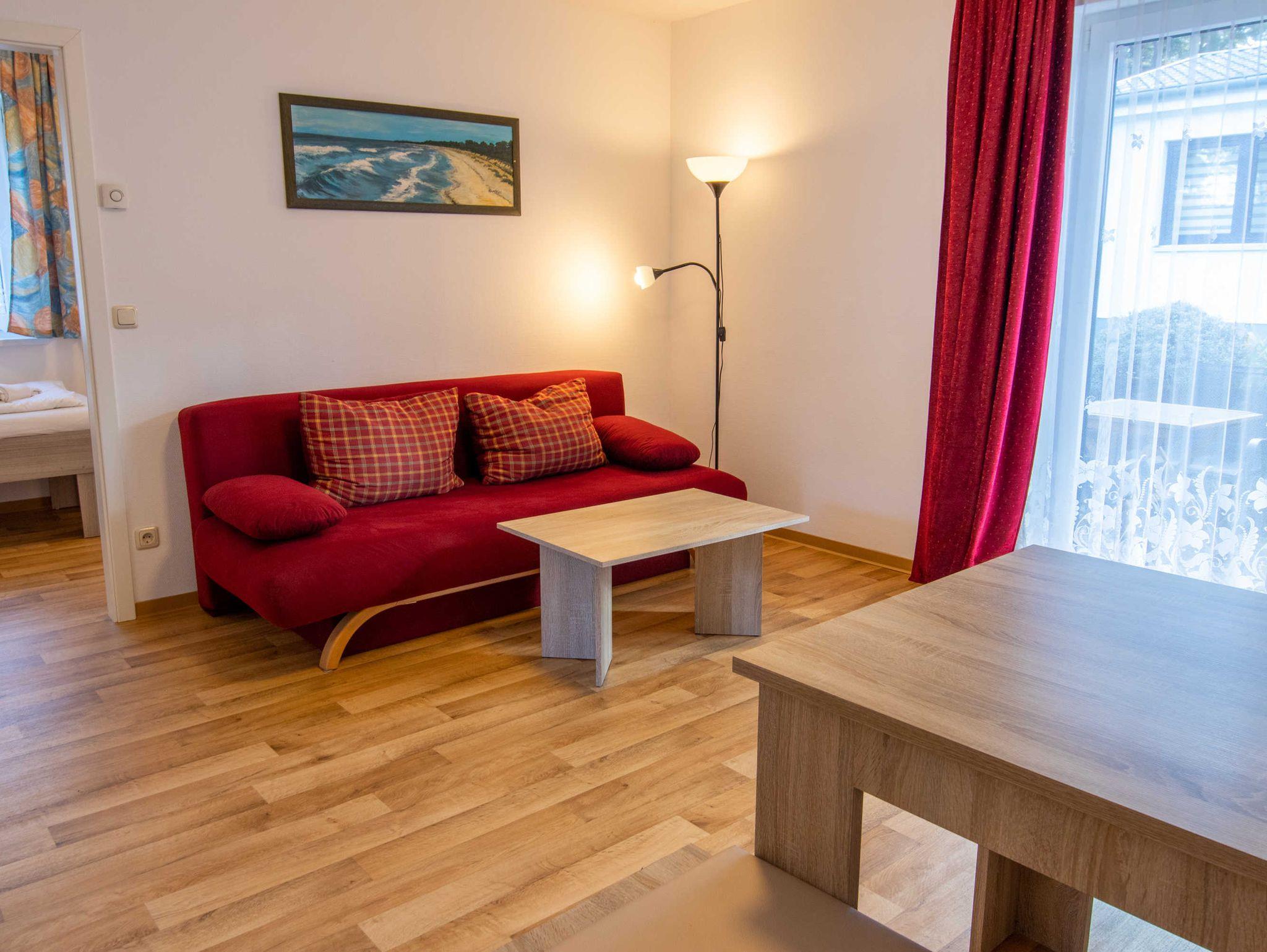 Die ca. 50 m² große Ferienwohnung befindet sich in einem einzeln stehenden Doppelhaus mit Terrasse und Blick zum Wald. Sie verfügt über ein Wohnzimmer mit Miniküche, zwei separaten Schlafzimmern, Flur und Bad.