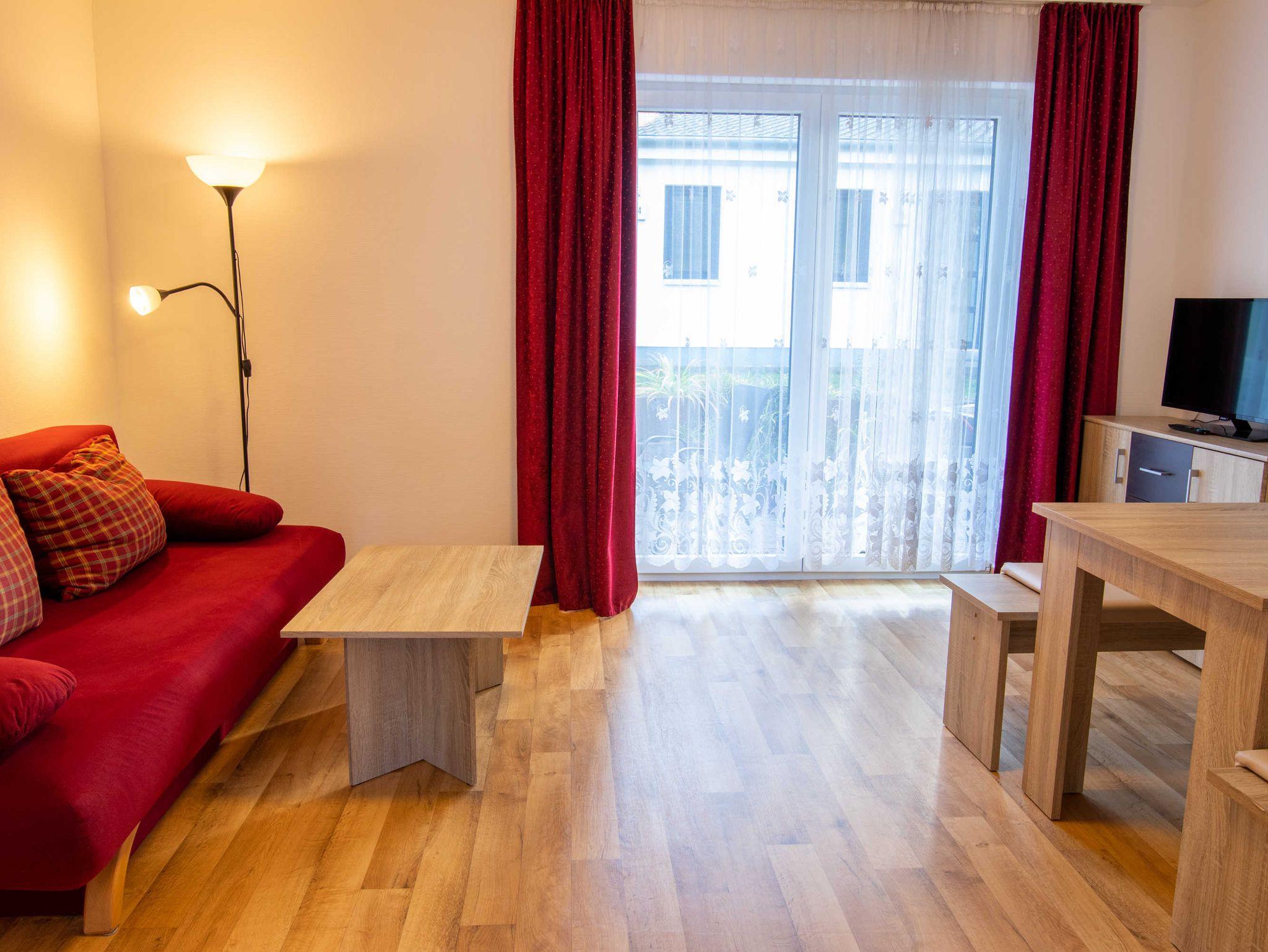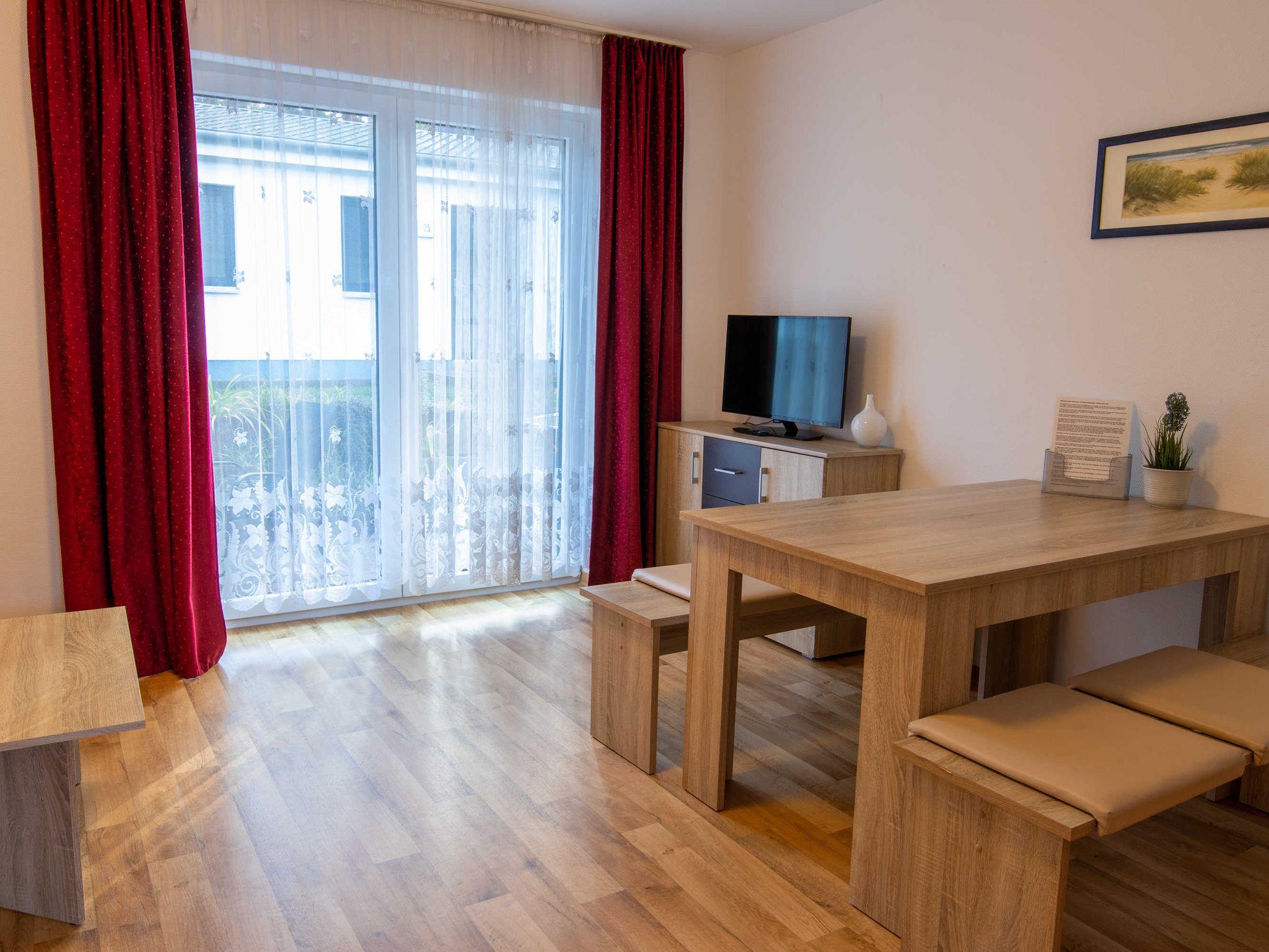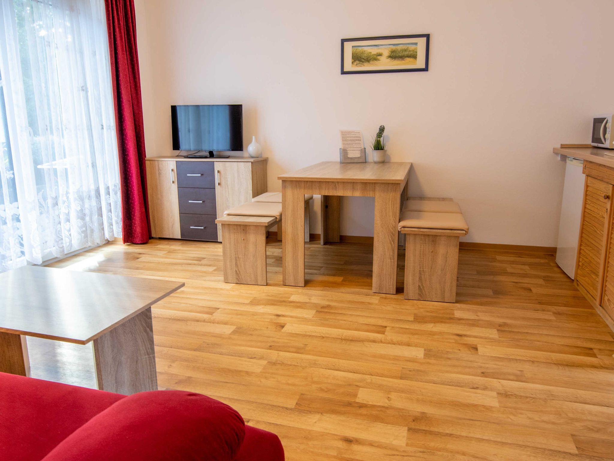 Das Wohnzimmer ist mit einer Schlafcouch (Aufbettung für 2 Personen), TV, einem Esstisch und einer Miniküche mit Kühlschrank und Mikrowelle eingerichtet. Im ersten Schlafzimmer befindet sich ein gemütliches Doppelbett mit Kleiderschrank. Das zweite Schlafzimmer beherbergt zwei Einzelbetten und einen Kleiderschrank. Das freundliche Tageslichtbad hat eine Dusche und ein WC. Zum Entspannen und Sonne tanken lädt die Terrasse ein. Sie ist vom Wohnzimmer aus begehbar.