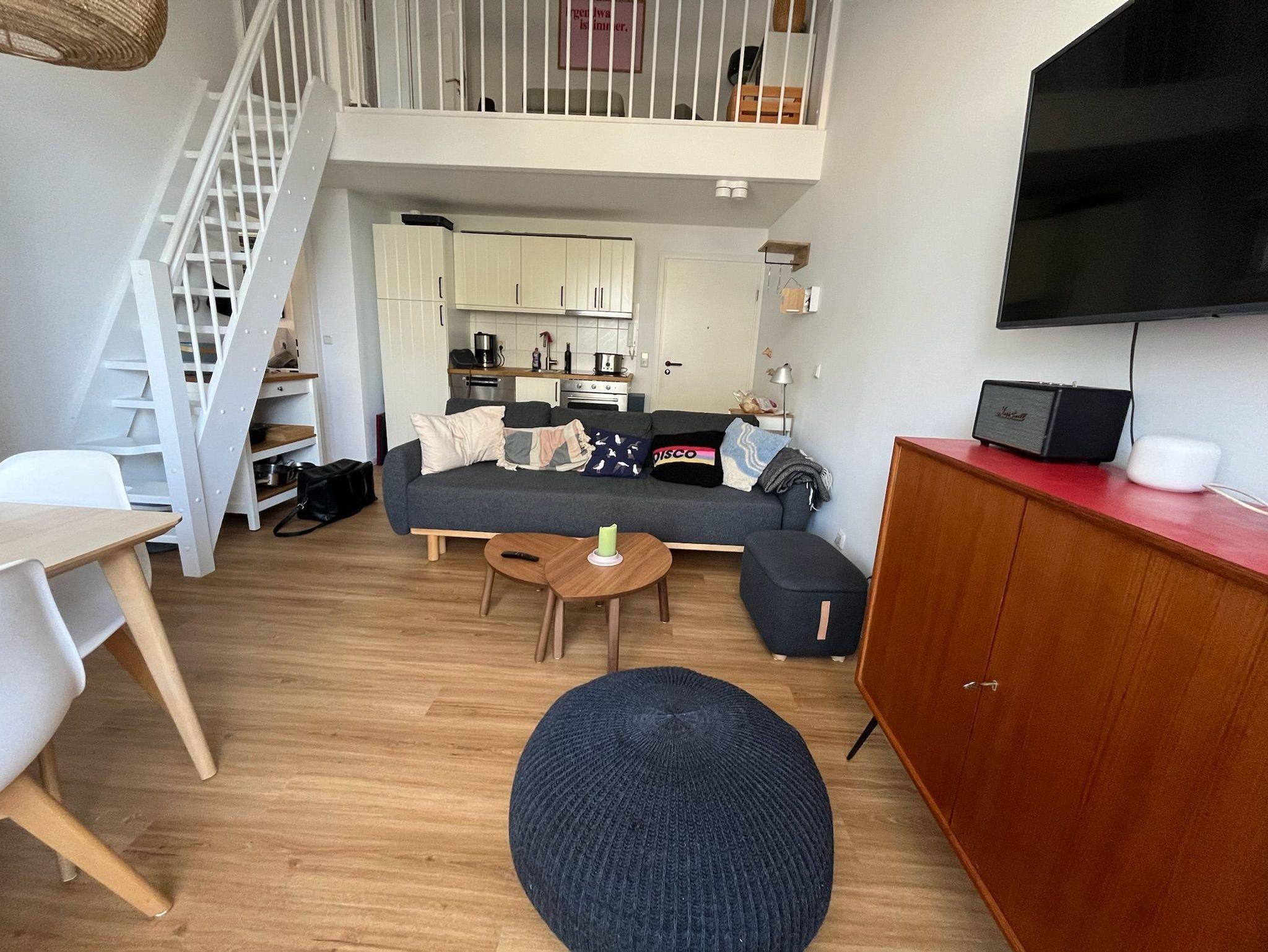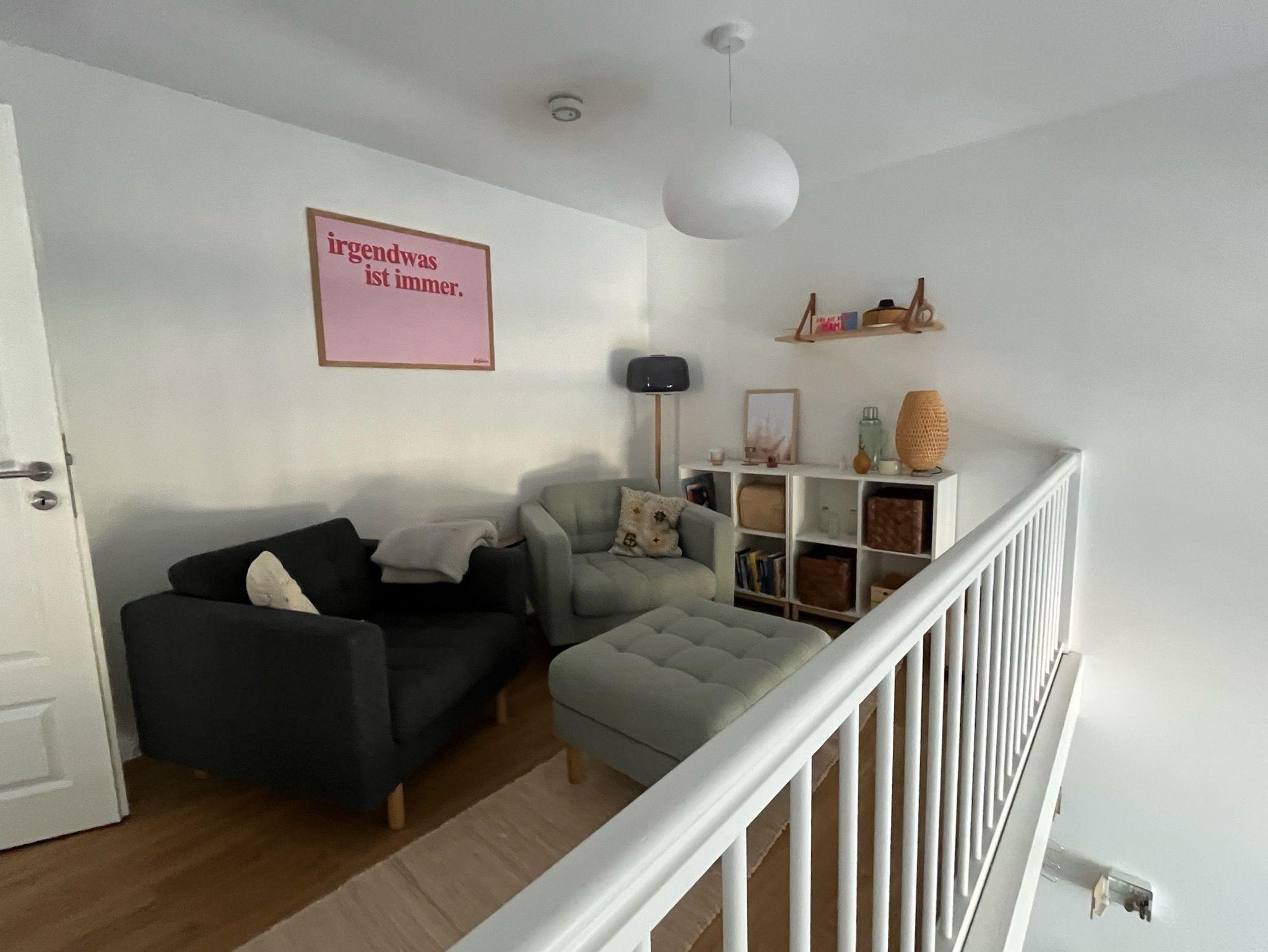 Offene Galerie vom Wohnraum über eine Treppe ins Dachgeschoss (leichte Dachschrägen) mit kleiner Sitzgruppe