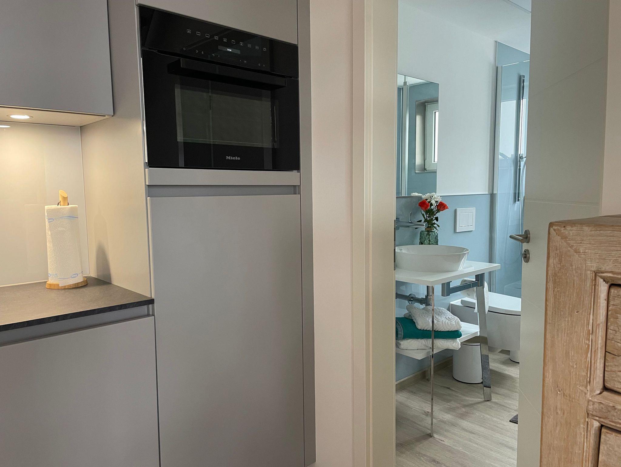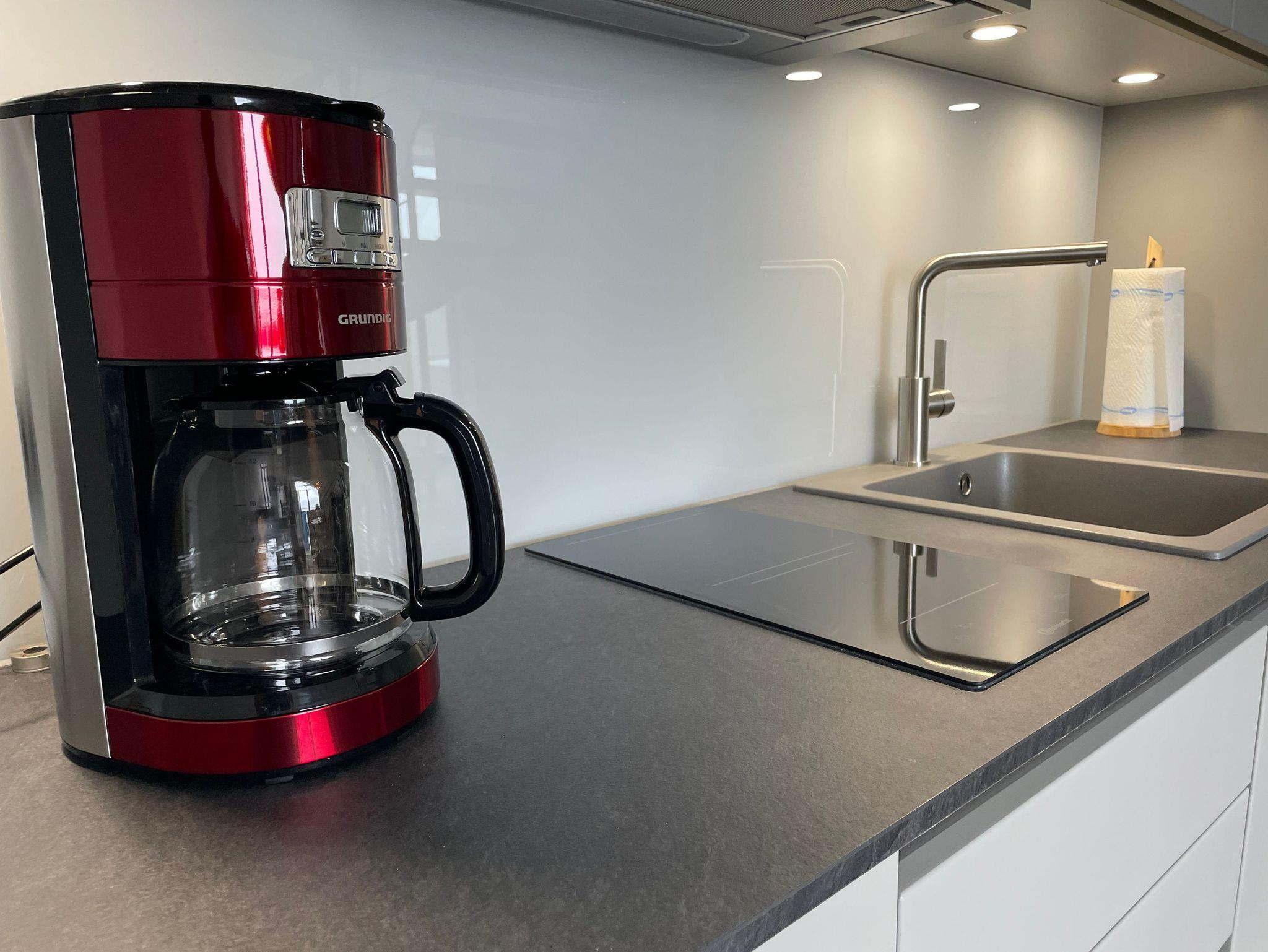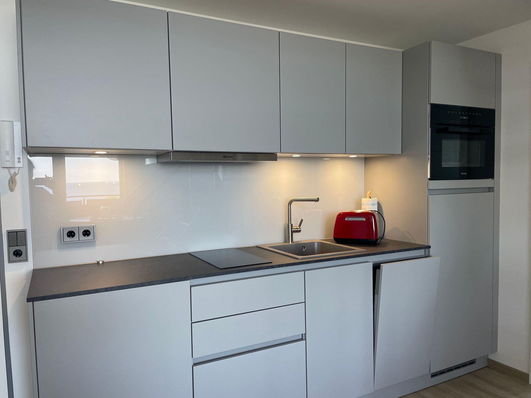 Wohnbereich mit Sofa, LCD Fernseher, voll ausgestattete Küche mit Backofen, Geschirrspüler, Esstisch, Duschbad und Schlafraum mit KING SITZE BETT 2 x 2 m. Feinste Daunenbetten runden Dein Schlaferlebnis ab.