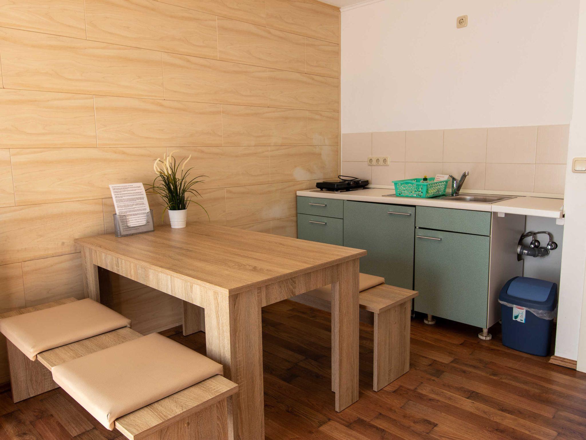 Die ca. 50 m² große Ferienwohnung befindet sich in einem einzeln stehenden Doppelhaus mit Terrasse und Blick zum Wald. Sie verfügt über ein Wohnzimmer mit Miniküche, zwei separaten Schlafzimmern, Flur und Bad.