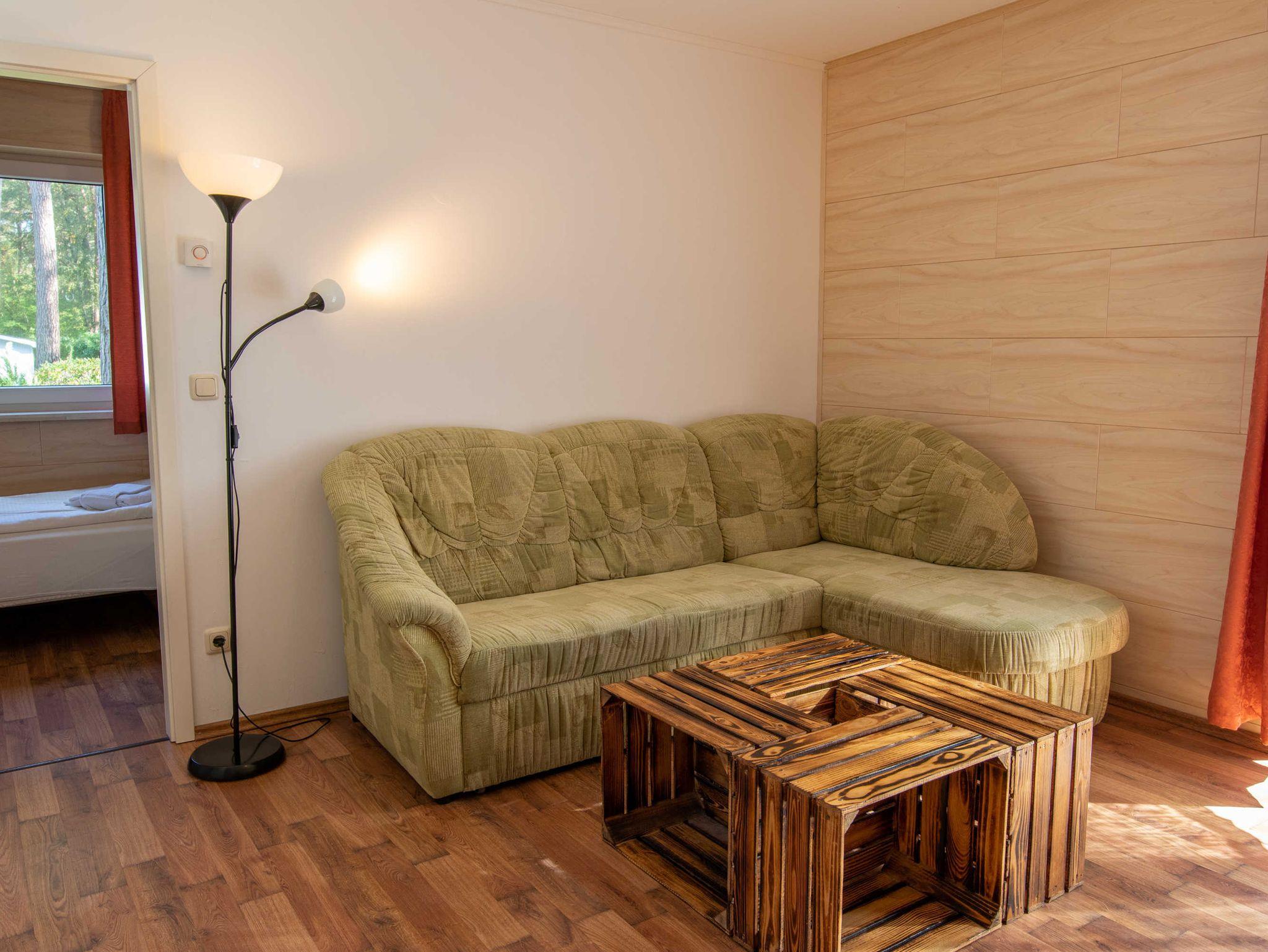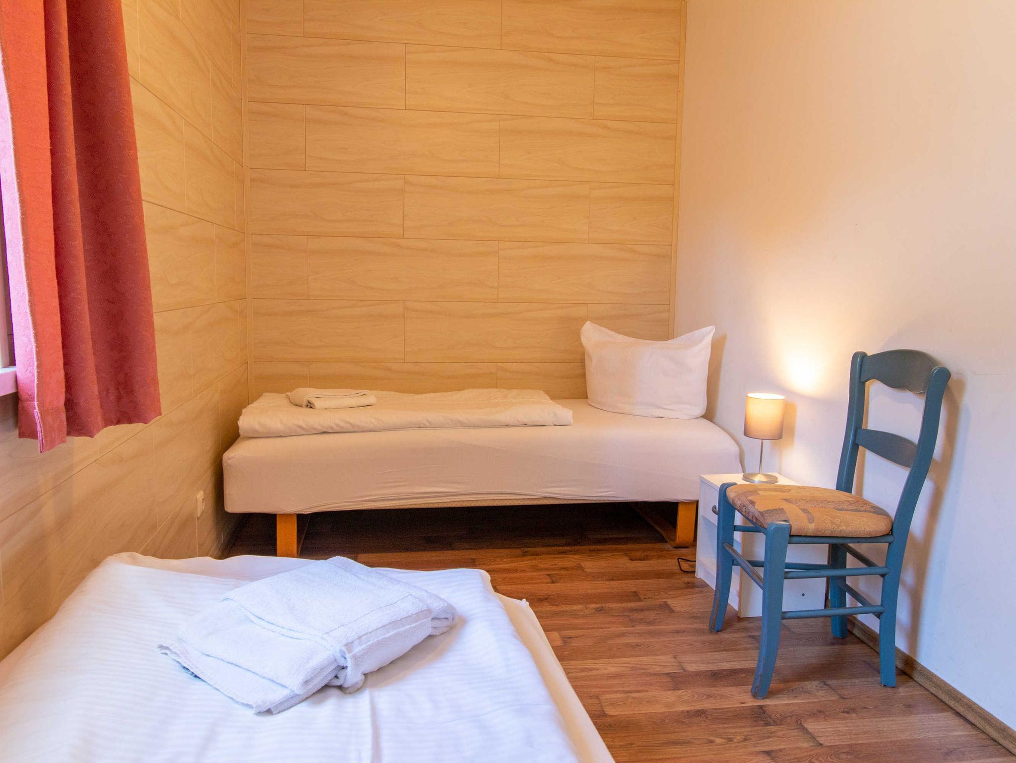 Das Wohnzimmer ist mit einer Schlafcouch (Aufbettung für 2 Personen), TV, einem Esstisch und einer Miniküche mit Kühlschrank und Mikrowelle eingerichtet. Im ersten Schlafzimmer befindet sich ein gemütliches Doppelbett mit Kleiderschrank. Das zweite Schlafzimmer beherbergt zwei Einzelbetten und einen Kleiderschrank. Das freundliche Tageslichtbad hat eine Dusche und ein WC. Zum Entspannen und Sonne tanken lädt die Terrasse ein. Sie ist vom Wohnzimmer aus begehbar.