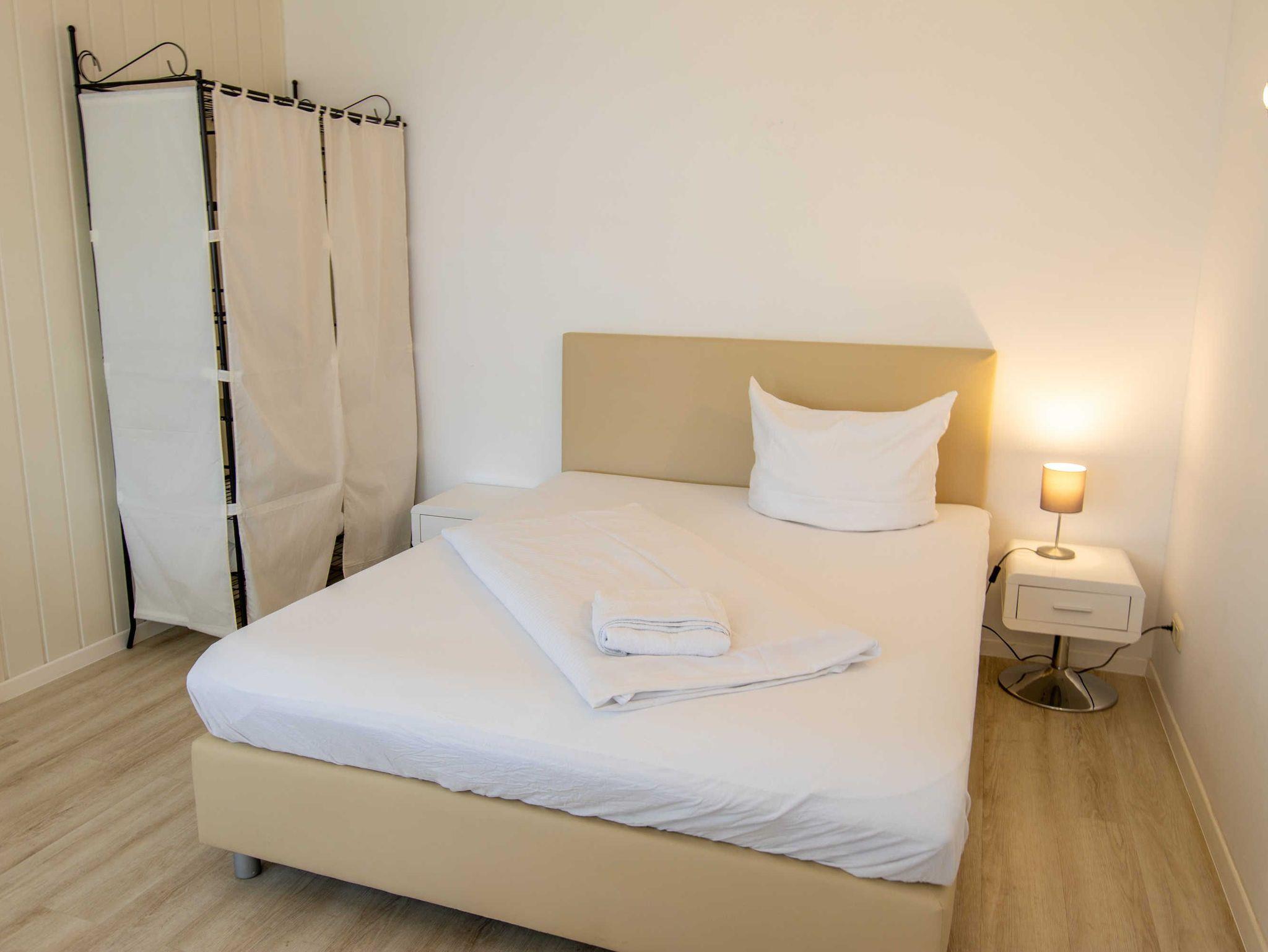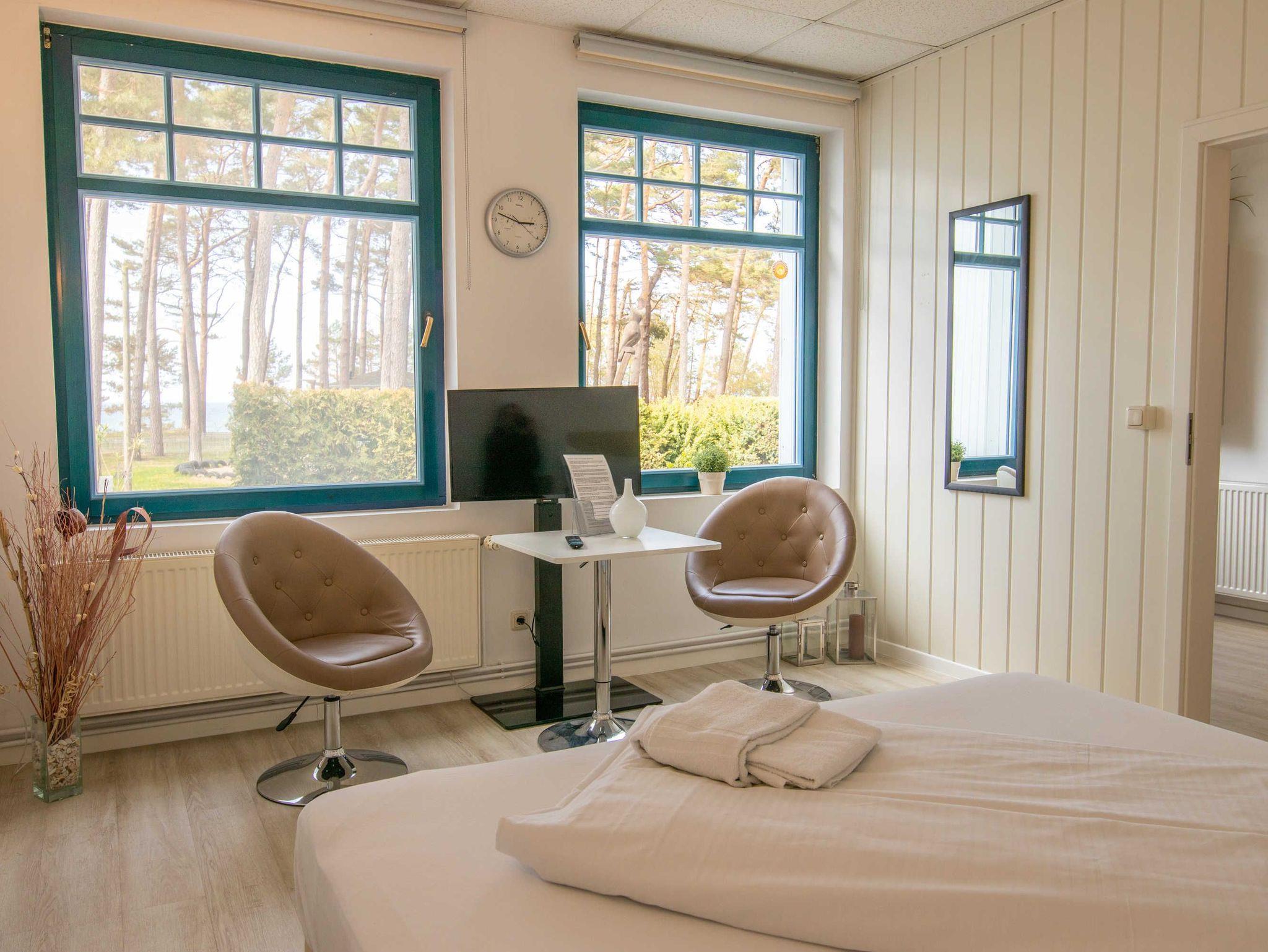 Das ca. 26 m² große Doppelzimmer mit direktem Meerblick befindet sich im Haupthaus der Ferienanlage. Es verfügt über einen kombinierten Wohn- und Schlafraum mit Doppelbett, eine separate Pantryküche mit Kühlschrank sowie ein Bad mit Dusche und WC. Vor der Wohnung befindet sich die möblierte Terrasse. Das Zimmer eignet sich für bis zu 2 Personen. Zusätzlich kann ein Kinderbett für ein Kleinkind (bis 3 Jahre) aufgestellt werden. Kinderbett, Hochstuhl, Wäschepaket sowie ein Parkplatz sind inklusive.