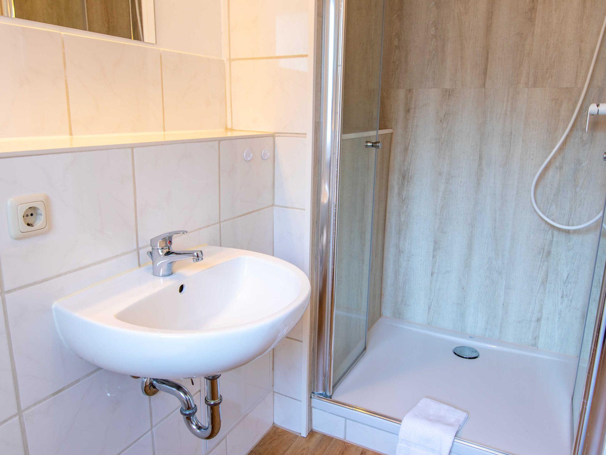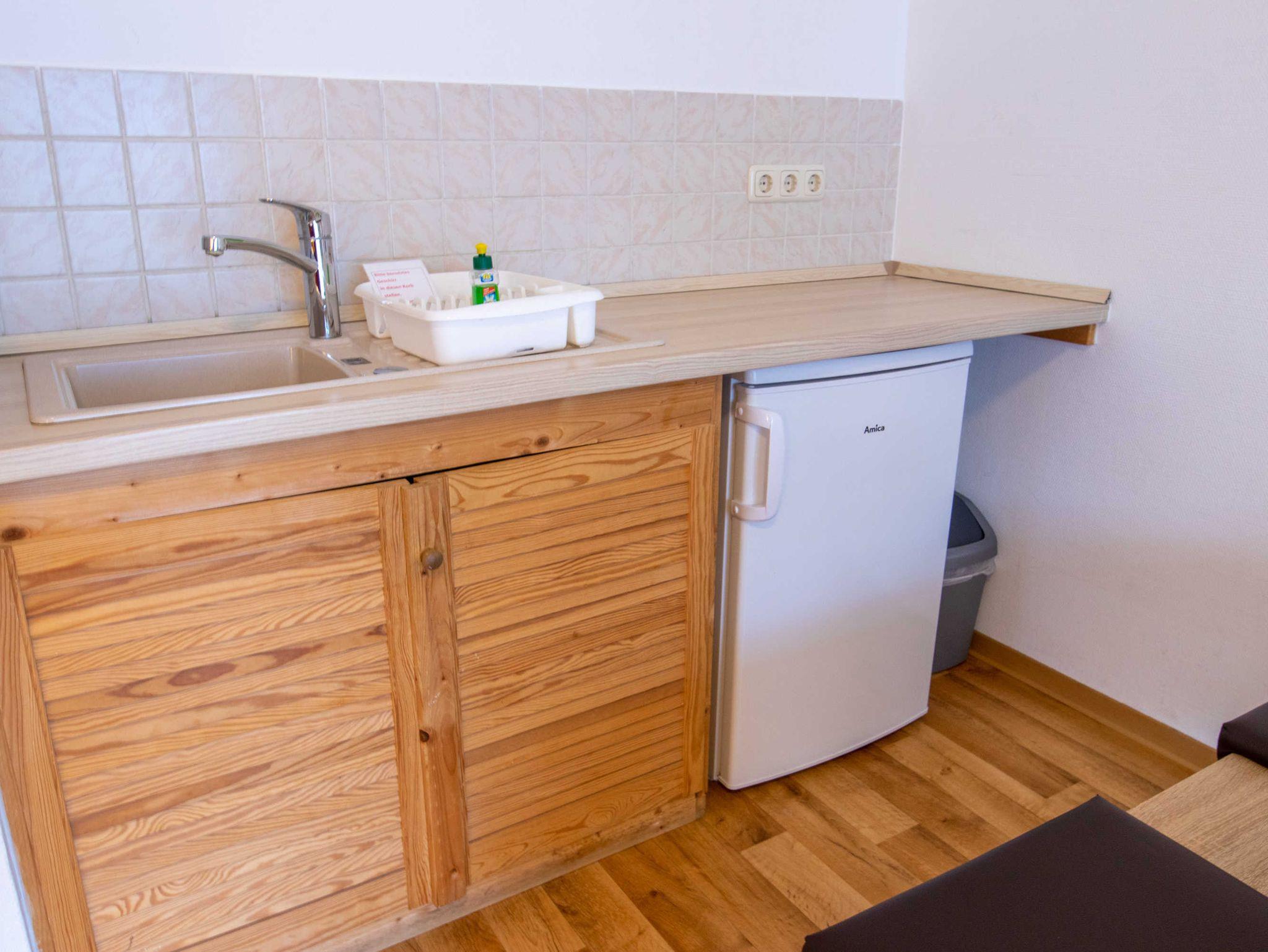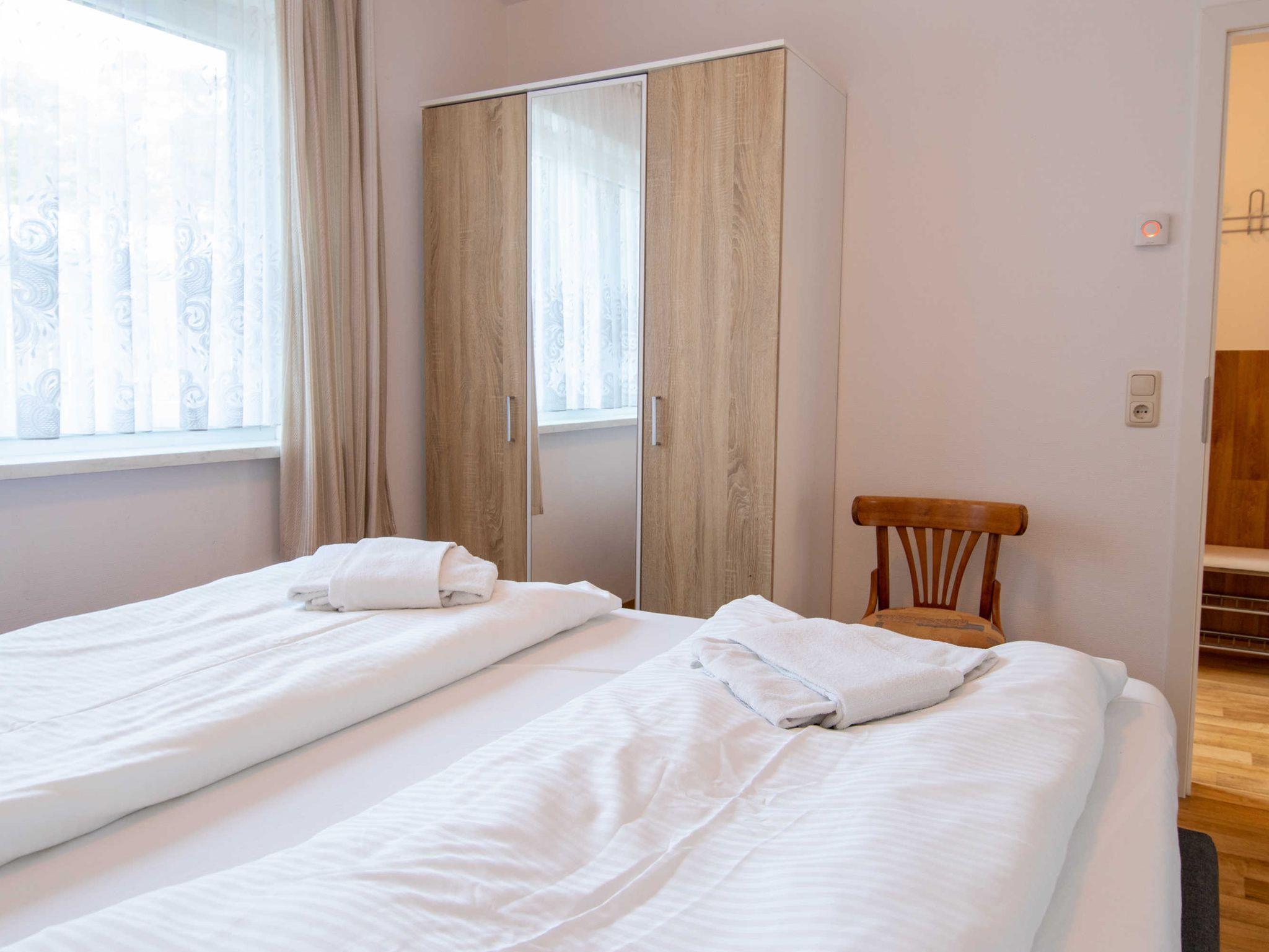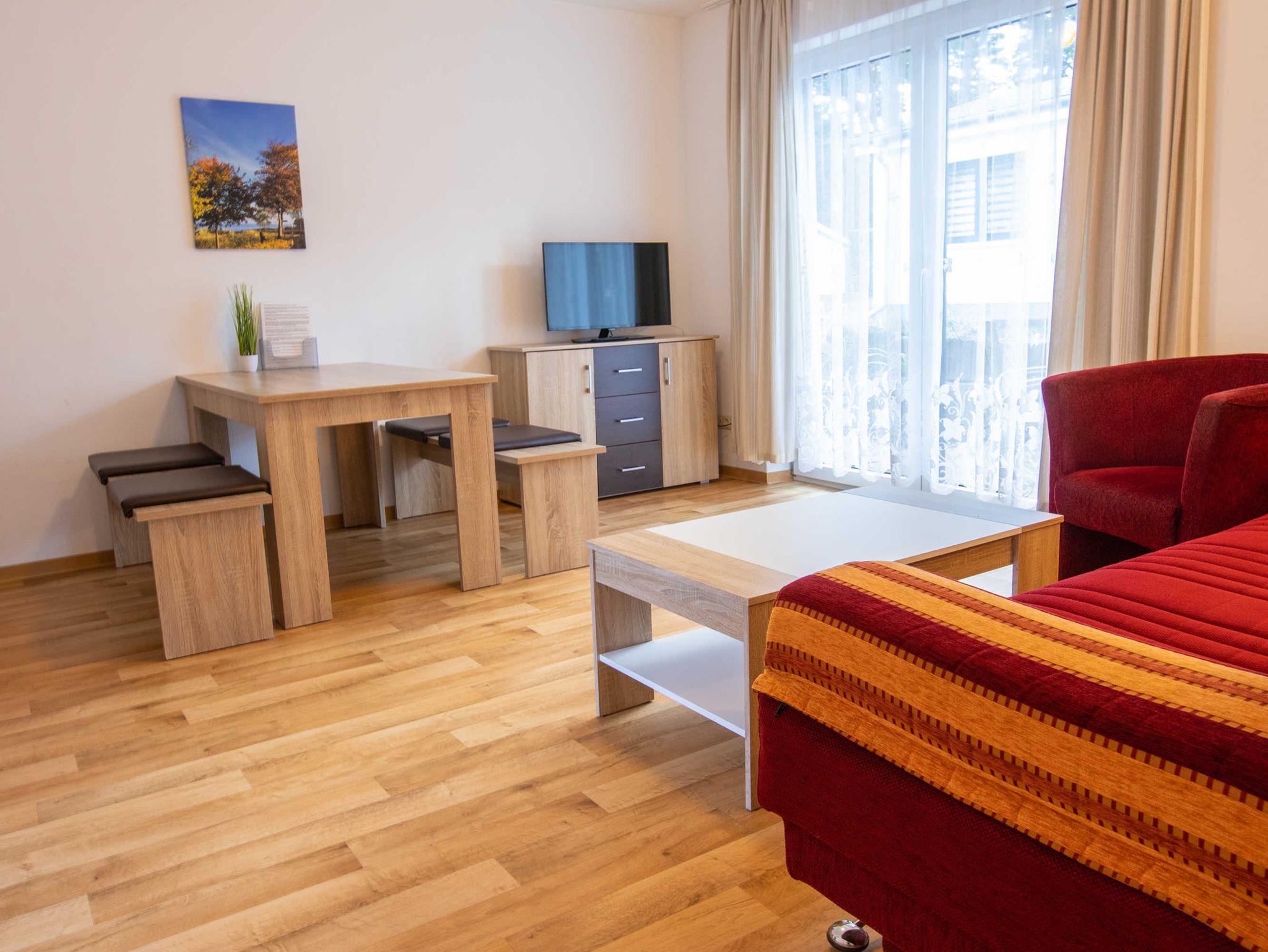 Die ca. 50 m² große Ferienwohnung befindet sich in einem einzeln stehenden Doppelhaus mit Terrasse und Blick zum Wald. Sie verfügt über ein Wohnzimmer mit Miniküche, zwei separaten Schlafzimmern, Flur und Bad.