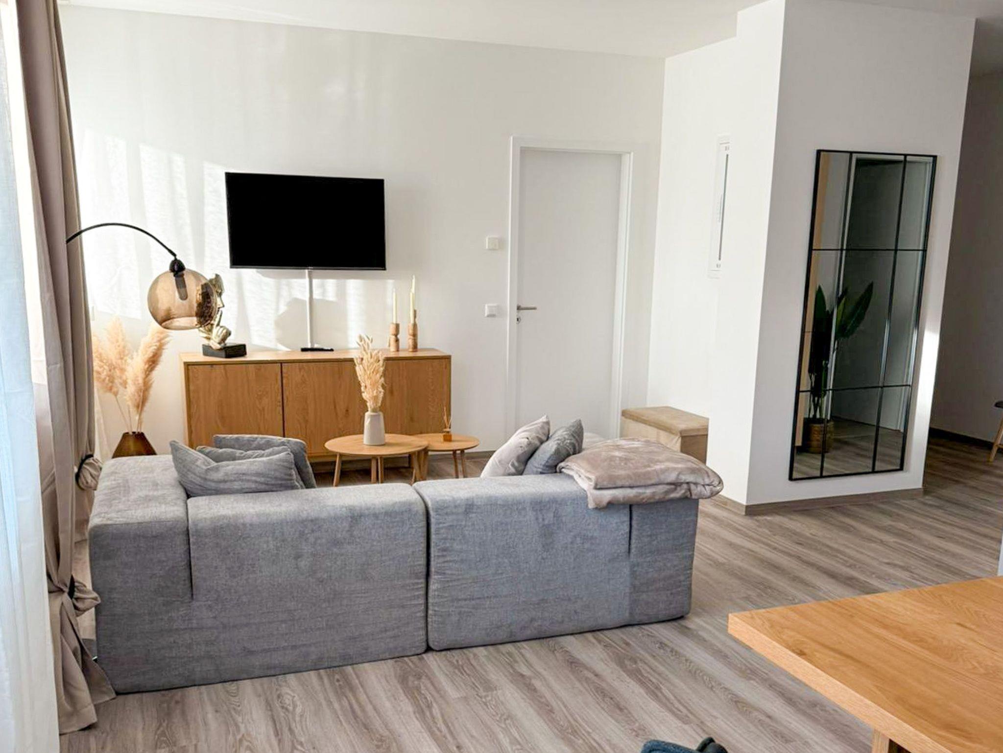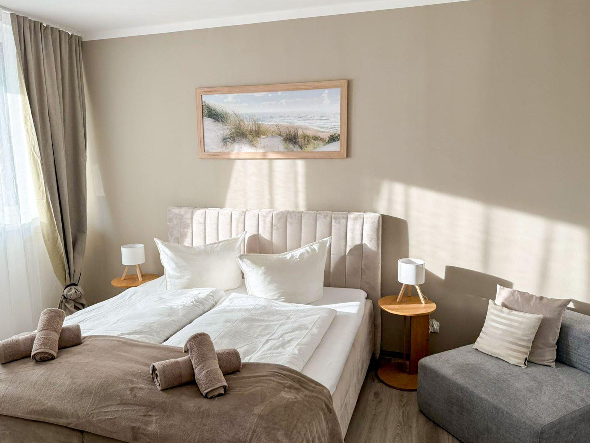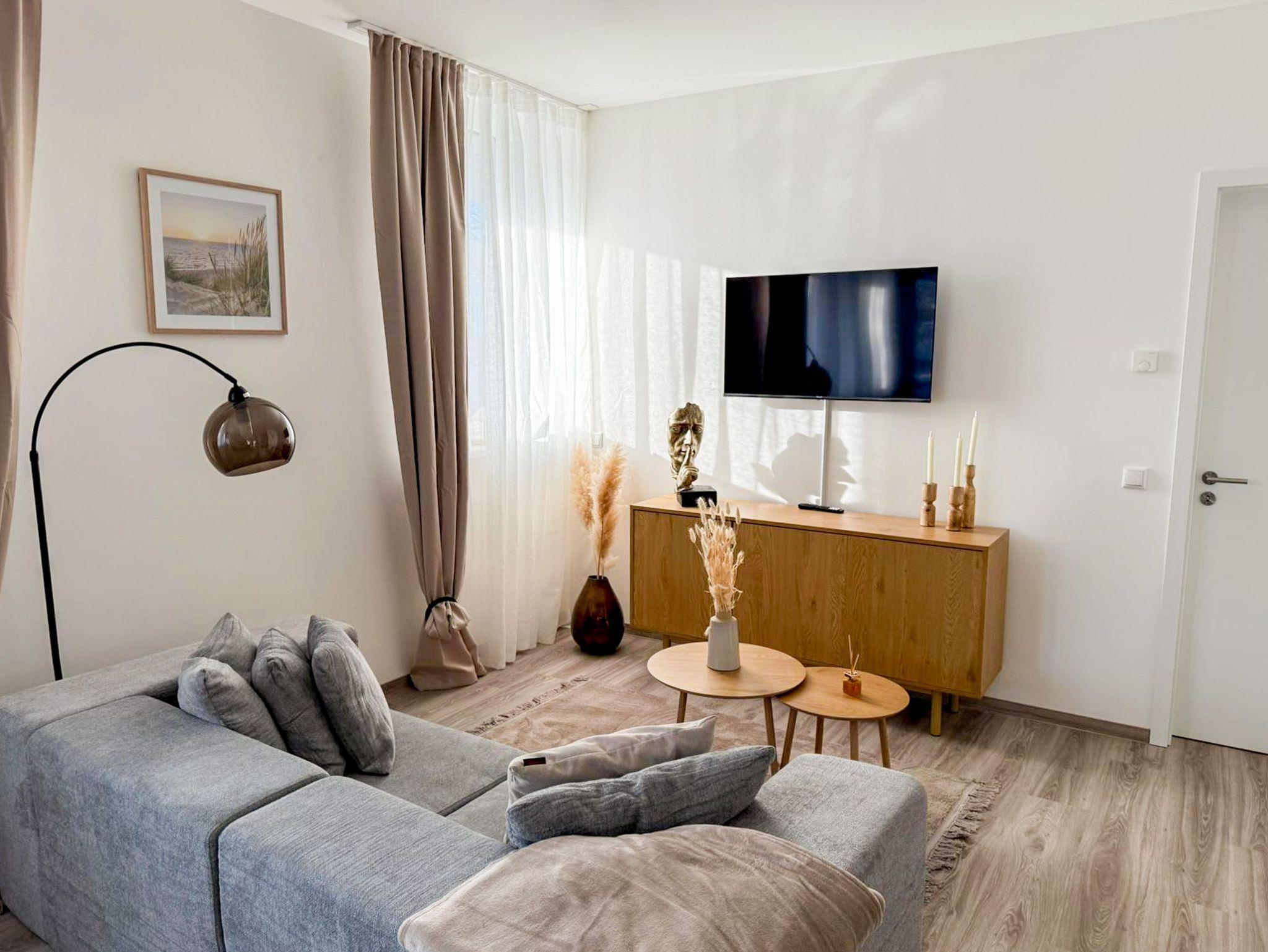 Das Apartment Lubmin ist modern, hell und stilvoll eingerichtet und bietet dir auf 65 m² ein hochwertiges Zuhause auf Zeit. Es befindet sich im Erdgeschoss und ist über einen eigenen, ebenerdigen Eingang unabhängig zugänglich, ideal auch für Gäste, die Wert auf Komfort und kurze Wege legen. Im Schlafzimmer erwartet dich ein großes Doppelbett (180x200) für erholsame Nächte. Zusätzlich steht hier ein Schlafsessel (90x200) zur Verfügung. Eine weitere Aufbettung ist flexibel möglich, entweder im Schlafzimmer oder im Wohnzimmer in Form einer Klappliege (90x200). Damit eignet sich die Wohnung optimal für bis zu vier Personen. Der Wohnbereich ist offen gestaltet und verbindet Wohnen, Essen und Kochen auf angenehme Weise. Ein bequemes Sofa, TV und der Zugang zum Balkon schaffen eine entspannte Atmosphäre. Die offene Küche ist voll ausgestattet mit Kühlschrank, Backofen, Geschirrspüler, Küchenhelfern sowie einer Kapselpad-Kaffeemaschine. Am Esstisch ist ausreichend Platz für gemeinsame Mahlzeiten oder ein entspanntes Arbeiten zwischendurch. Das Bad punktet mit moderner Ausstattung und einer ebenerdigen Dusche, Waschbecken und WC. Die barrierearme Gestaltung sorgt für zusätzlichen Komfort.