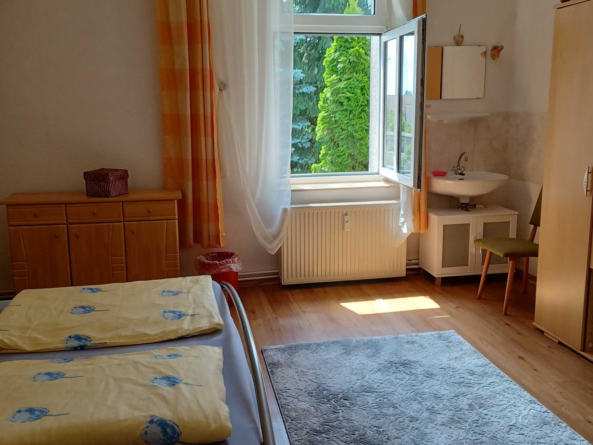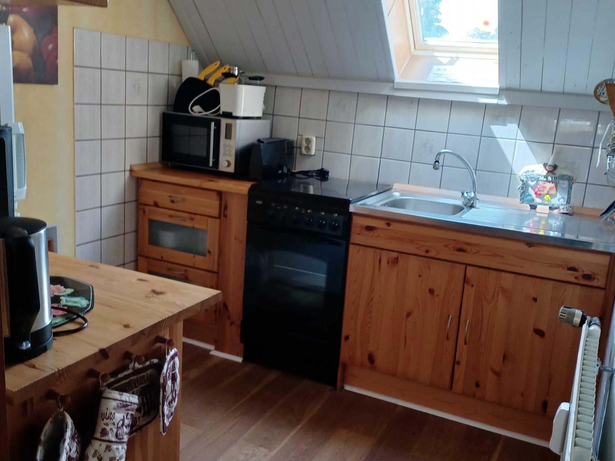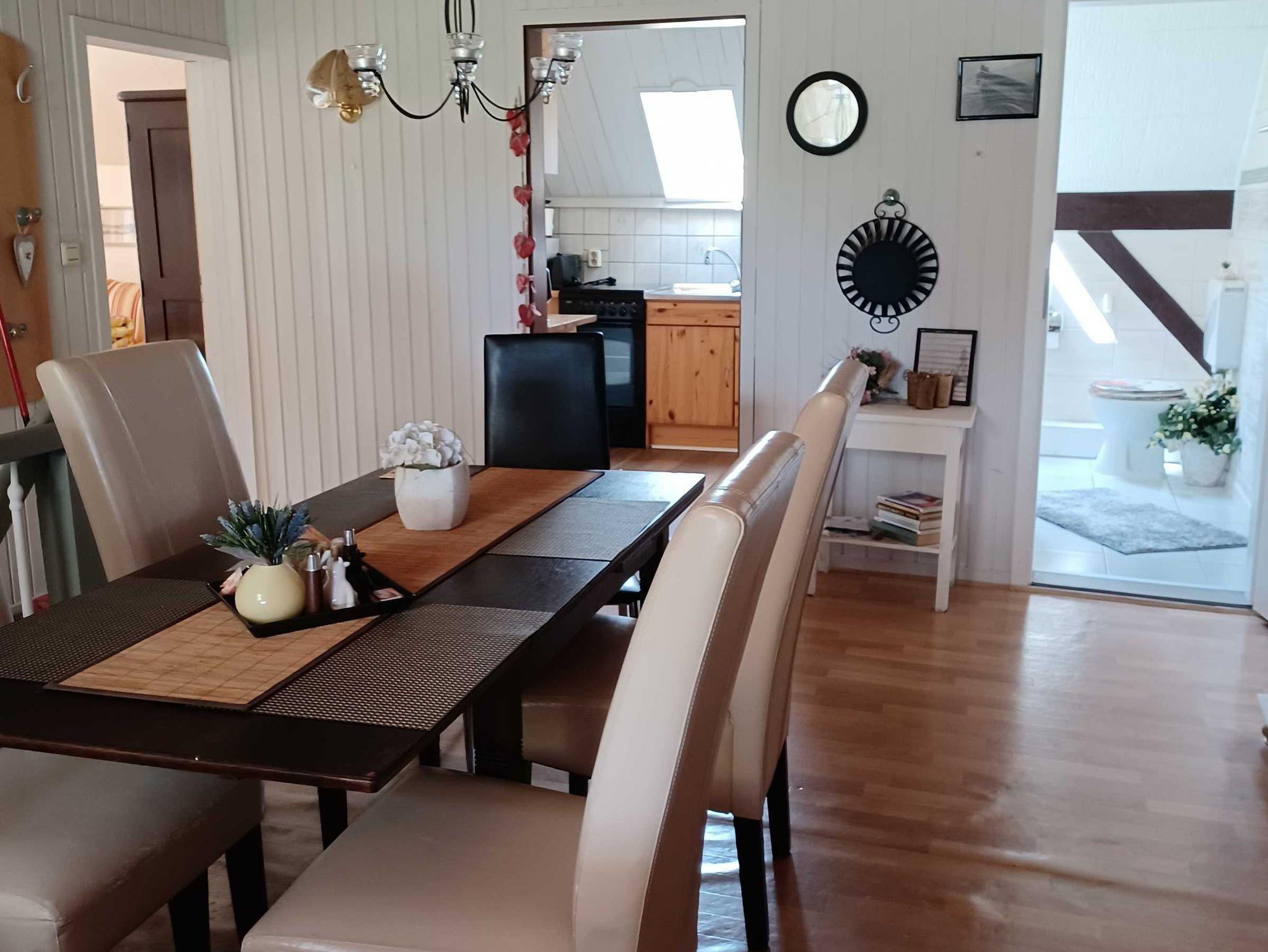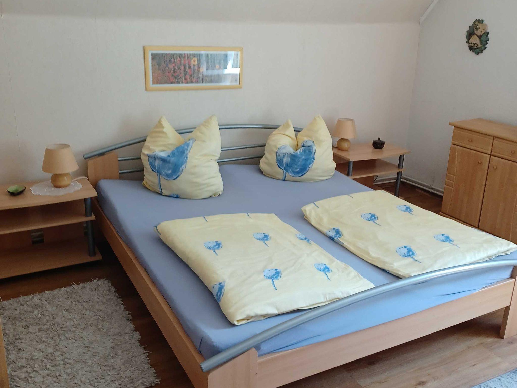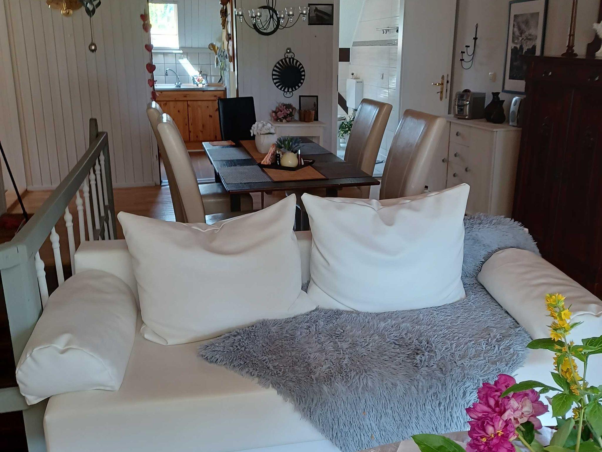 Die Ferienwohnung liegt im Obergeschoss und hat eine Größe von 90 qm und ist für 1-6 Personen geeignet. Die Wohnung ist unterteilt in eine separate Küche, zwei Schlafzimmer für je zwei bis drei Personen und einen Wohnraum. Von der Sitzecke im Wohnzimmer hat man einen Blick über den Garten auf die Müritz