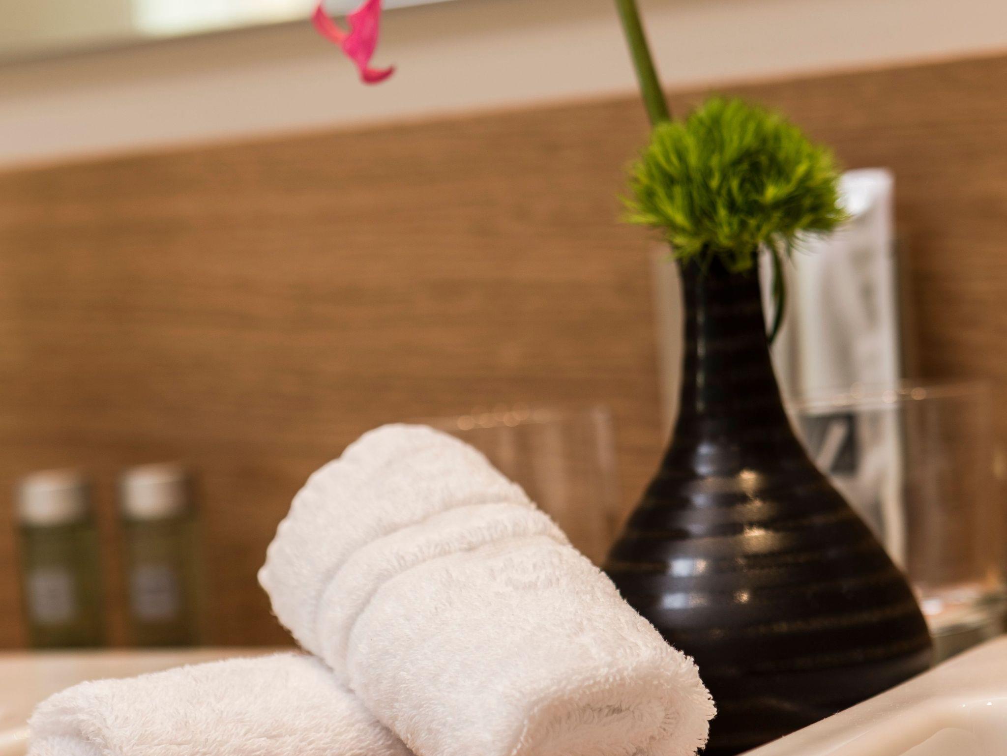 Die hellen und großzügigen Bäder verfügen nicht nur über eine große Dusche mit Regenfunktion. sondern auch über eine Toilette mit Fenster sowie ausreichend Abstellmöglichkeiten um das Waschbecken. Selbstverständlich steht ein Föhn für die Dauer des Aufenthaltes zur Verfügung. Das Angebot wird ergänzt durch eine exklusive Auswahl an französischen Bio Kosmetikprodukten.
