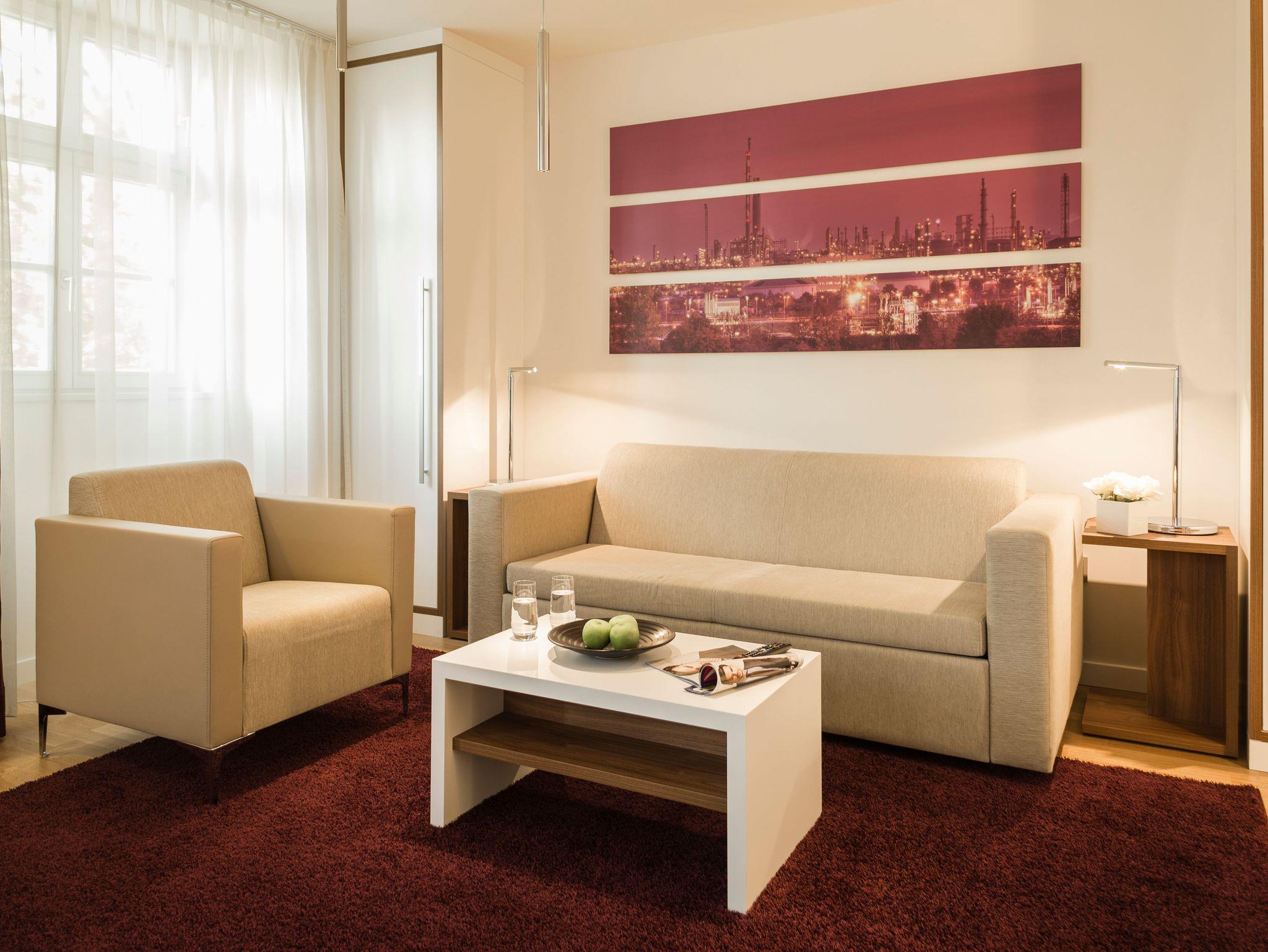 Die Living-Apartments im Herzen von Ludwigshafen in wunderschöner, grüner Umgebung liegen nur einen Steinwurf von der BASF Zentrale entfernt. Im direkt angrenzenden BASF Luxushotel Rene Bohn können Apartmentgäste zum reduzierten Preis von 25 Euro ein Frühstück der Superlative genießen. Auch Gästewäsche kann im Rene Bohn gegen Berechnung abgegeben werden. Die Anbindung an das öffentliche Verkehrsnetz ist hervorragend und Sie erreichen schon nach wenigen Minuten die Metropolen Mannheim oder Heidelberg. Aber auch die wunderschöne Pfalz gilt es zu entdecken. Lassen Sie ihren Wagen auf den Apartmenteigenen Parkplätzen stehen und besuchen eines der zahlreichen Weinfeste. Egal ob Sie für einen Businesstrip die Metropole Ludwigshafen nutzen oder für einen privaten Kurzzeit oder Langzeitaufenthalt - die Living Apartments sind auf alle Fälle die richtige Adresse.