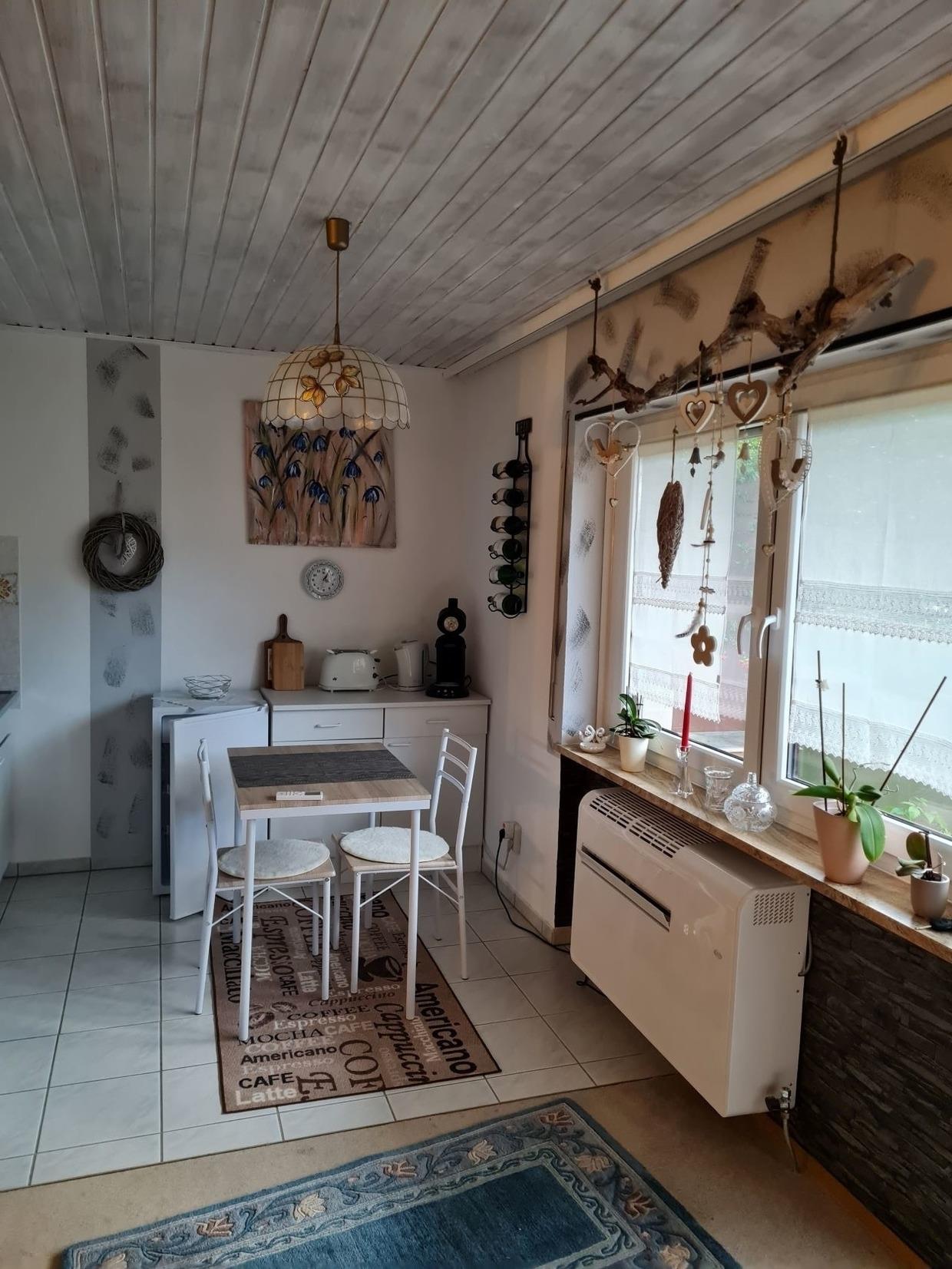 Gemütlich und geschmackvoll zum Wohlfühlen eingerichtete Ein-Zimmer-Ferienwohnung mit Küchenzeile, Essbereich im Erdgeschoss mit großer überdachter Terasse und separatem (verschließbaren ) Zugang von außen zur Terasse.