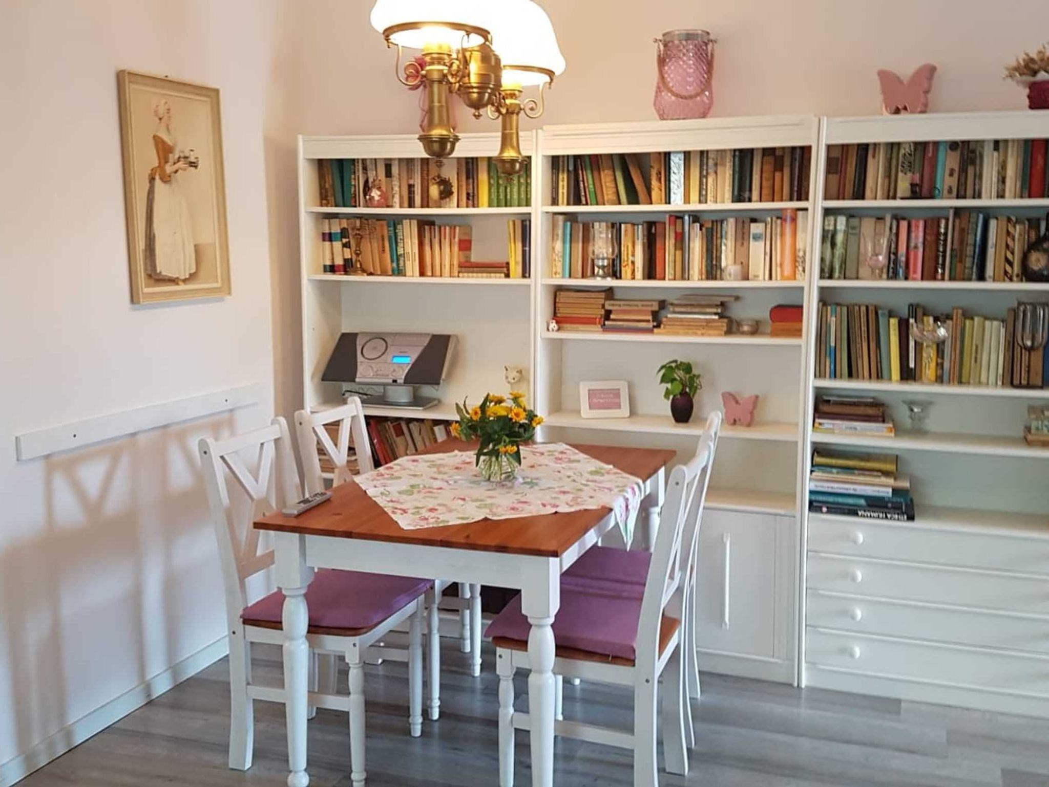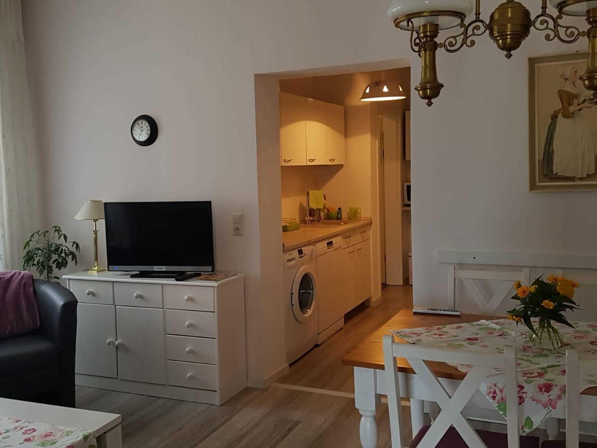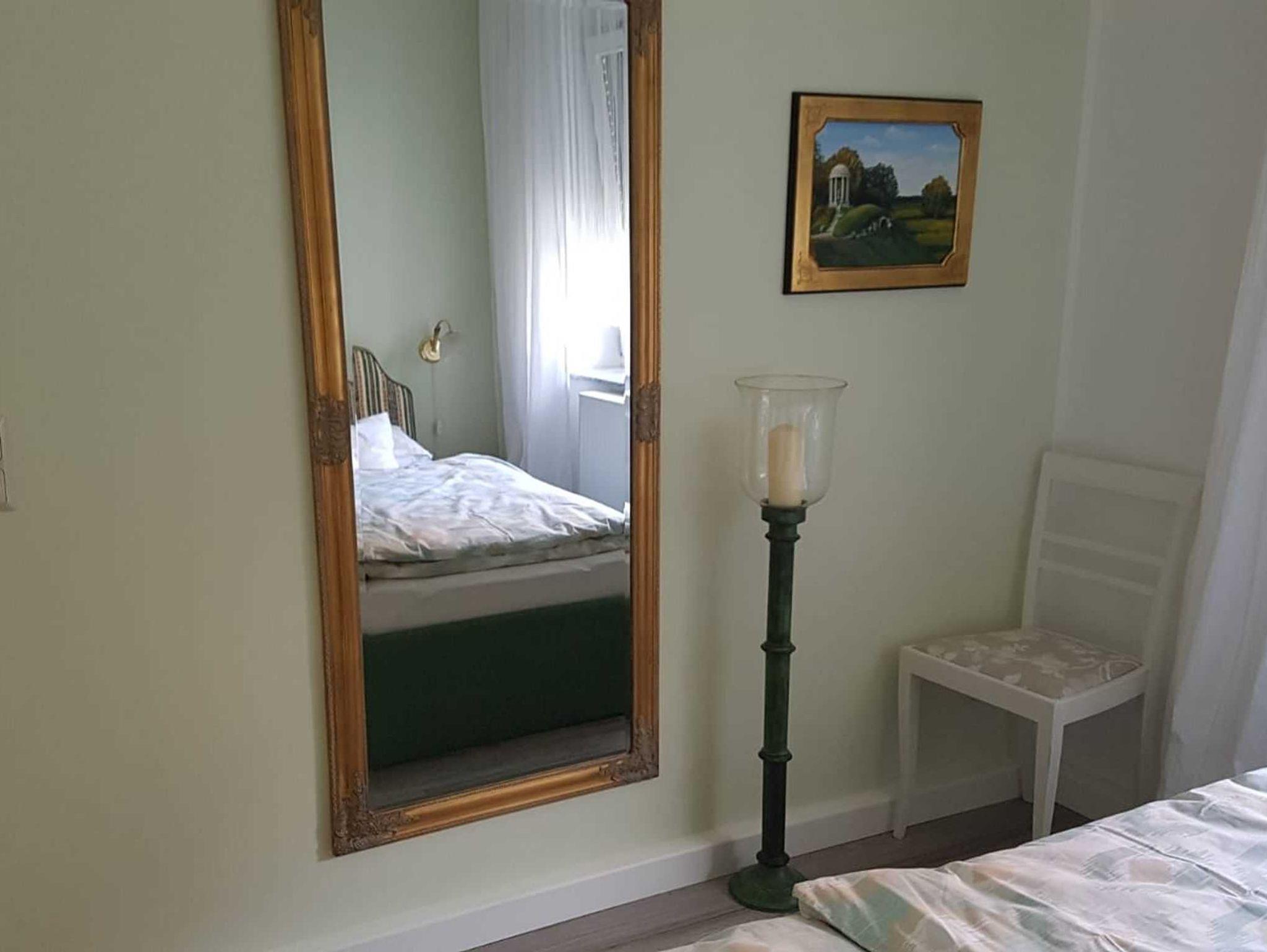 Das Schlafzimmer ist mit einem Doppelbett ausgestattet. Im Wohnzimmer befindet sich eine Schlafcouch für eine Aufbettung für maximal 2 Personen. Eine komplett ausgestattete Küche mit Waschmaschine, Geschirrspüler, Herd, Mikrowelle, Kaffeemaschine und einem Brötchenaufbackofen. Neben der Küche befindet sich eine Kammer, die zum Abstellen der Koffer etc. genutzt werden kann.