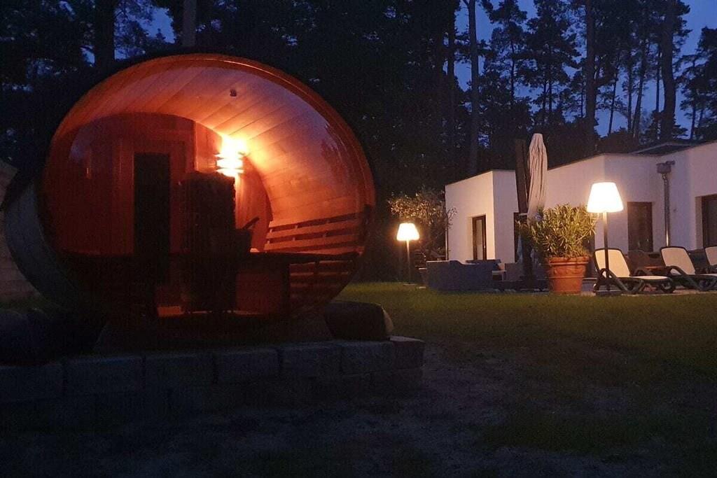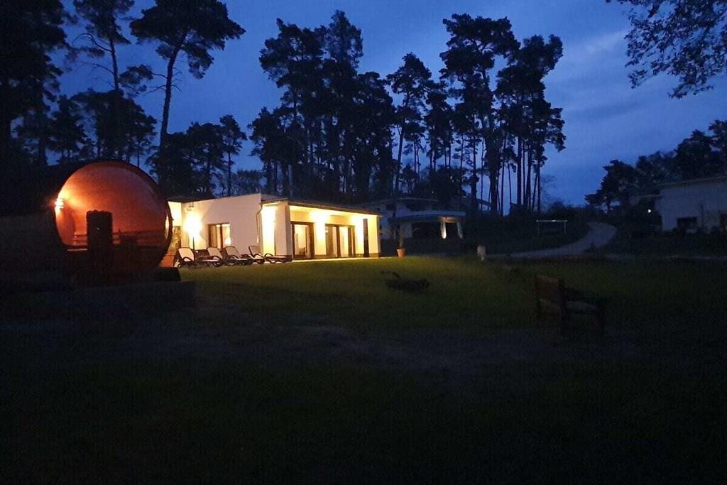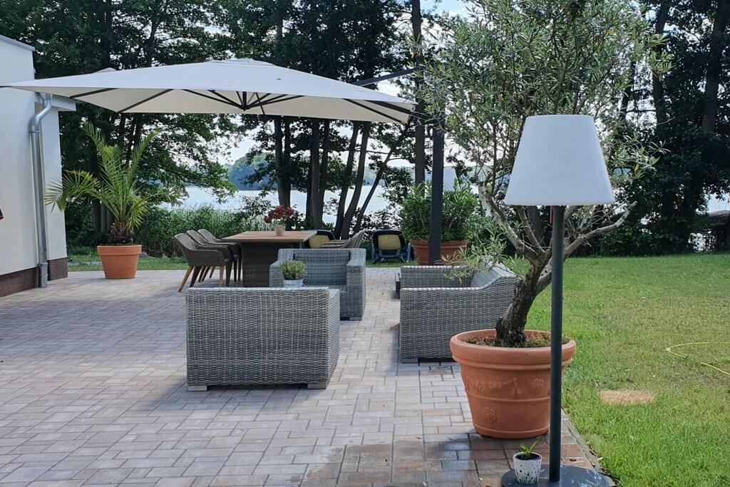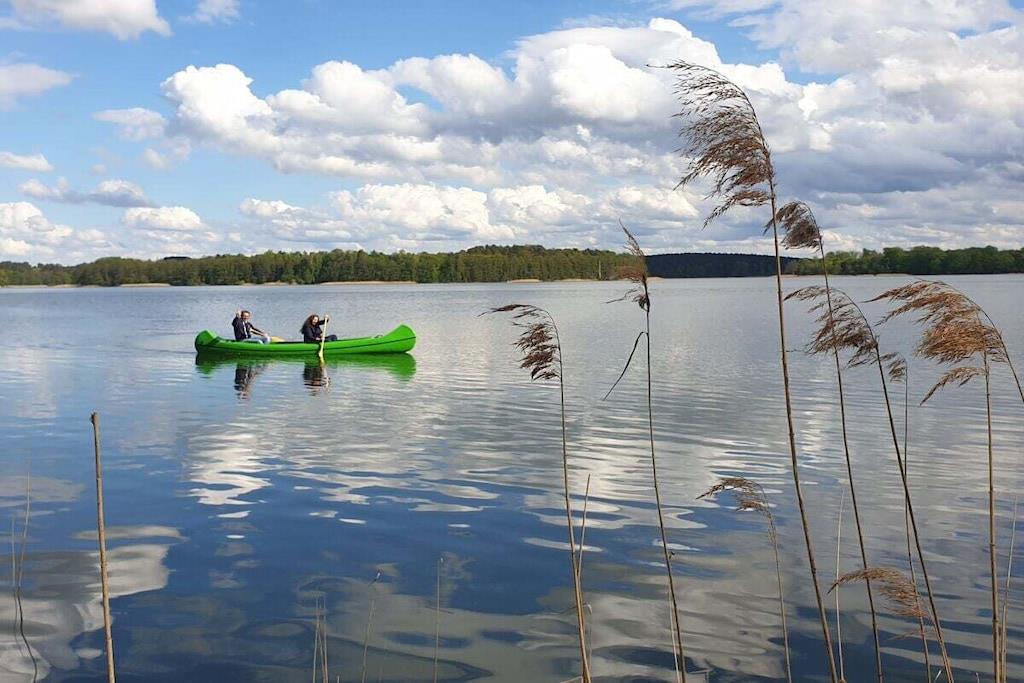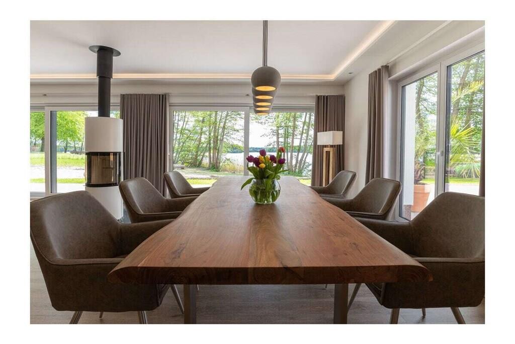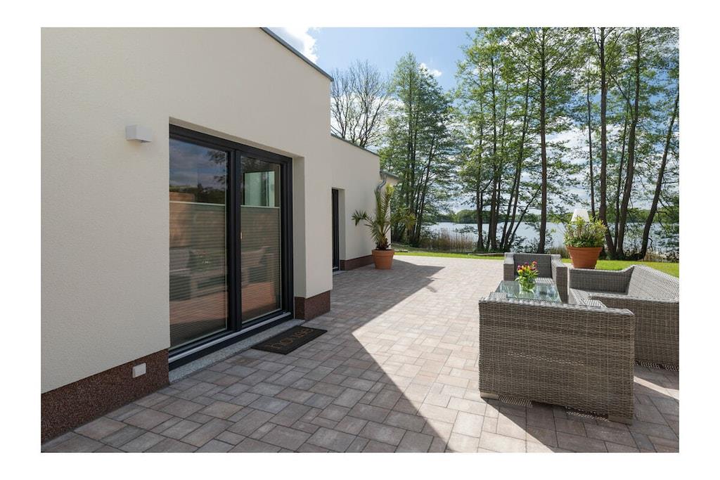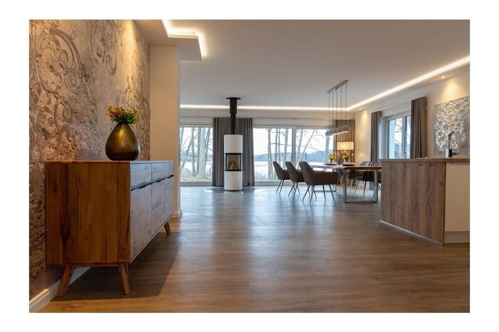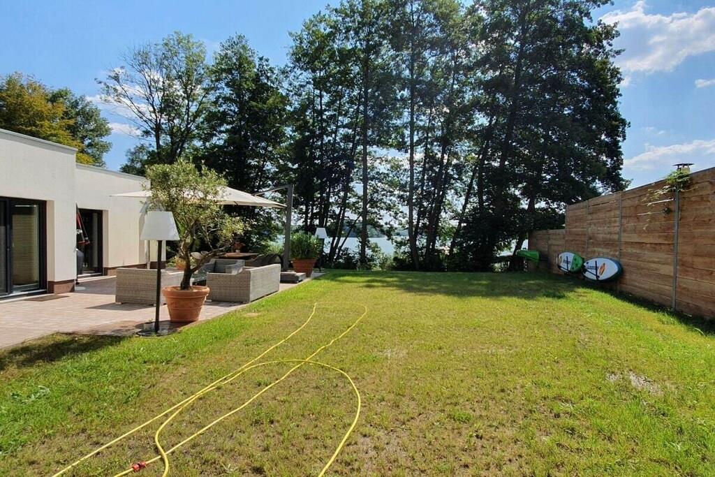 Den komfortabelt møblerede villa – 160 m² direkte ved den store Lychen-sø Stue med fantastisk søudsigt, køkken-alrum og pejs = 60 m² 1 badeværelse med bruser, badekar og toilet 1 badeværelse med bruser og toilet 3 soveværelser med boxmadras, smart-tv og søudsigt Stor, komfortabel terrasse med søudsigt Svømmeområde Udendørs sauna Canadisk kano (til 4 personer), 2 SUP'er, 2 enkeltmandskanoer 11 KW ladestation Villaen ved søen ligger på en 60.000 m² stor grund. Der er allerede bygget ti huse af høj kvalitet på denne grund.