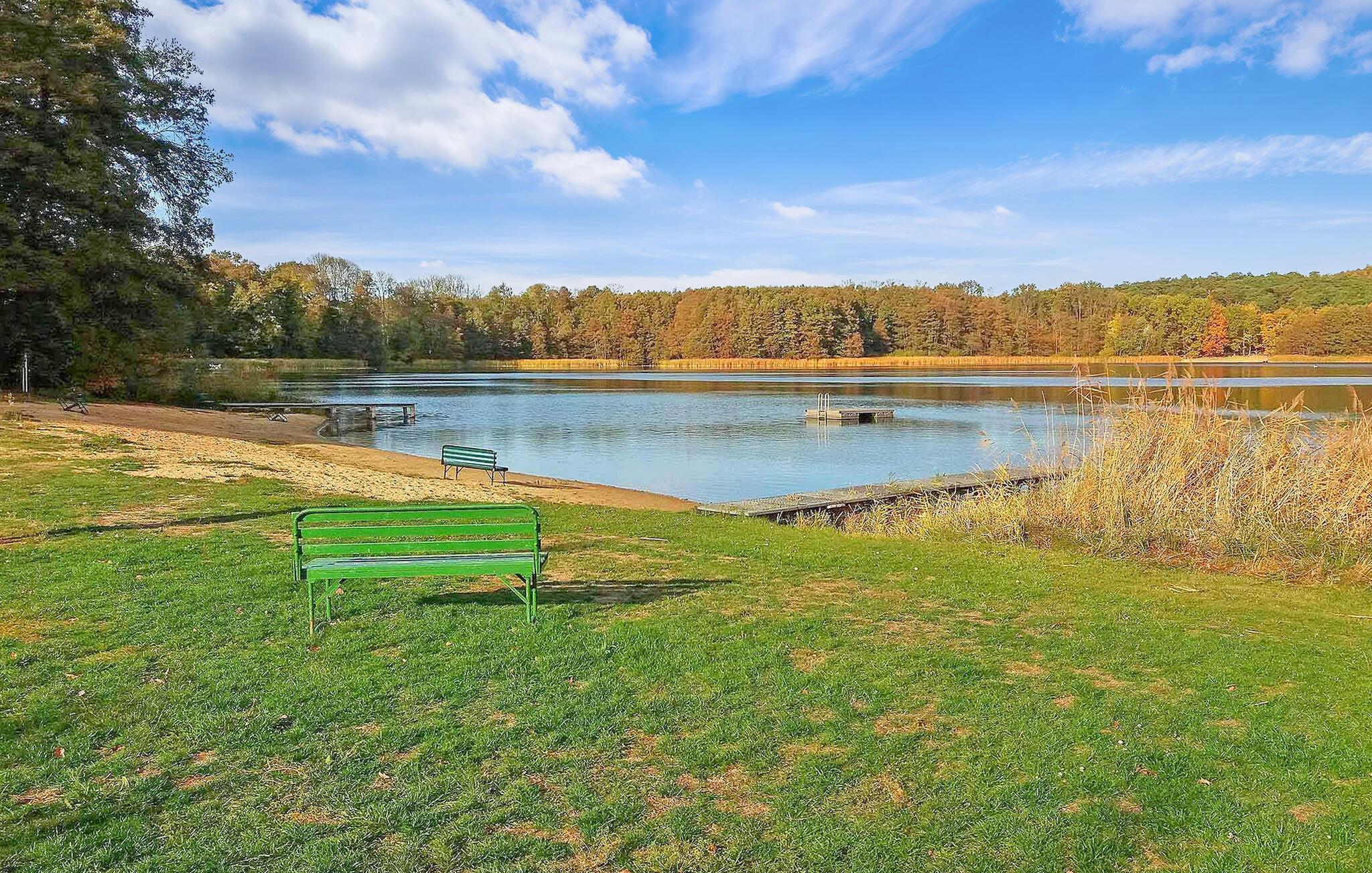 Idyllisk beliggende, midt i skoven og kun 500 m fra Groß Leuthener See, ligger dette hyggelige feriehus til tre personer på en ca. 450 kvadratmeter stor, lukket fritidsejendom. Robådudlejning, fisketegnssalg og friske rundstykker er i gåafstand, øvrige butikker er ca.11 km væk.Rygerhuset, som er ca.35 kvm stort, har opholdsstue (polstret opholdsområde, pejs) , fladskærms-tv, radio/CD og DAV-afspiller), to soveværelser (1 x dobbeltseng, 1 x enkeltseng), minikøkken (elkomfur, køleskab med fryser mulighed, mikroovn med ovn), badeværelse med brus/toilet og en overdækket, møbleret terrasse. Huset er udstyret med insektbeskyttelse på vinduerne og elvarme. Der er desuden muret udendørs pejs med grill, siddepladser, liggestole, parkeringsplads og cykelkælder til rådighed på ejendommen.Den samlede pris inkluderer slutrengøring, sengetøj, brænde samt vand- og energiforbrug. Du skal selv medbringe håndklæder. Et kæledyr er tilladt i denne ejendom. Flere dyr kræver ejerens samtykke før reservation. Groß Leuthen, idyllisk beliggende ved søen af samme navn, er et distrikt i kommunen Märkische Heide, som ligger øst for Unterspreewald, i udkanten af UNESCO Spreewald Biosphere Reserve. Langt væk fra turistcentre er dette det rigtige feriested for at opdage regionens unikke natur til fods, på cykel eller på vandet. Groß Leuthener See er ideel til svømning, fiskeri eller sejlsport (fisketilladelser og bådudlejning fra den lokale fisker).Cyklister kan udforske området, for eksempel på “Gurkenradweg” Udforsk.Der er en familieslagterbutik i byen, rundstykker er tilgængelige på den nærliggende campingplads. Yderligere indkøbsmuligheder og seværdigheder finder du i Neu Lübbenau (ca. 11 km) eller i Lübben (ca. 20 km) Den kendte Tropeø kan nås i bil på cirka 30 minutter.