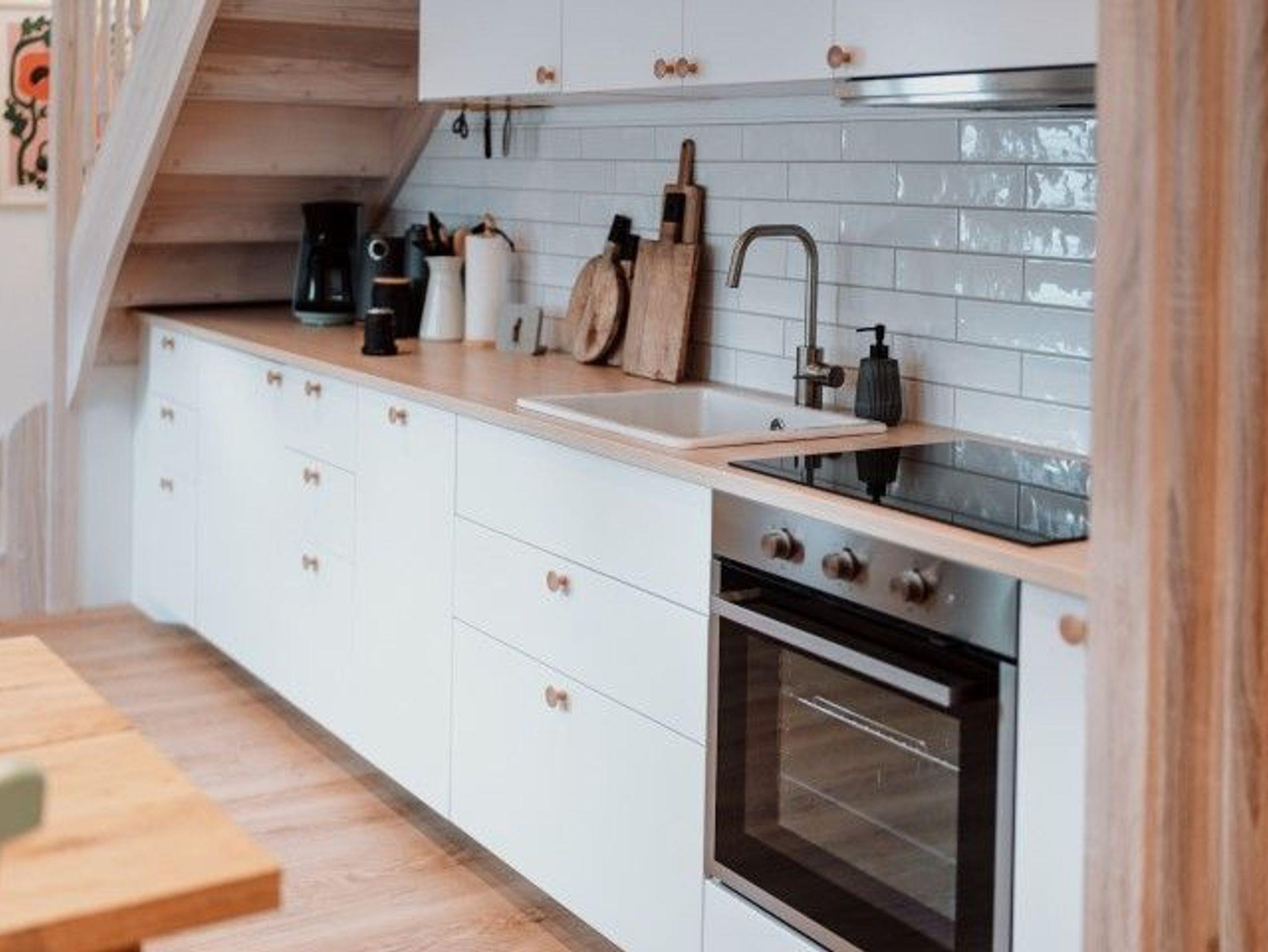 In der offenen Wohn-Küche kann auf einem 4-Feld Indusktionsherd gekocht werden. Spülmaschine, Kühlschrank mit kleinem Gefrierfach sind ebenfalls vorhanden.