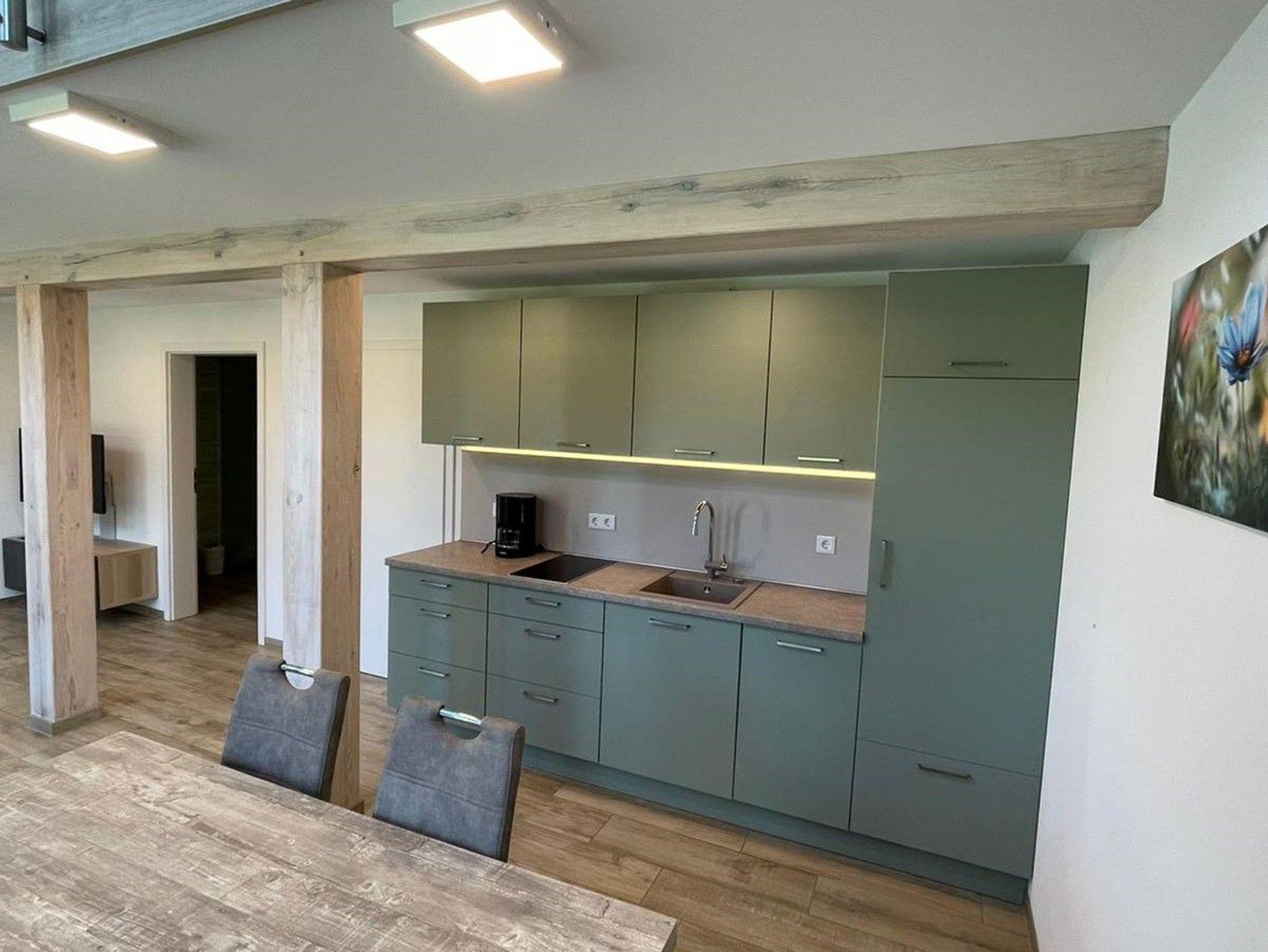 * Küchenzeile mit 165 Liter Kühlschrank und Gefrierfach, 2-Platten Induktionsfeld, Geschirrspülmaschine usw.