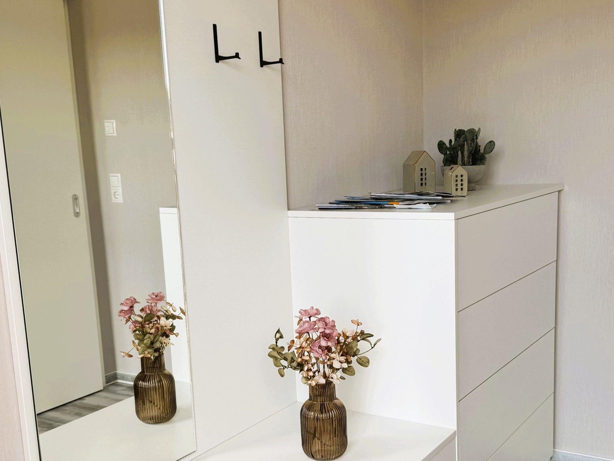 Treten Sie ein in Ihr modernes, komplett schwellenfreies Ferienhaus, das Sie mit seinem großzügigen Flur herzlich empfängt. Der offene Raum führt Sie direkt in die elegante Wohnküche, die mit allen technischen Annehmlichkeiten und modernen Details ausgestattet ist. Hier finden Sie alles, was Sie für einen komfortablen Aufenthalt benötigen.