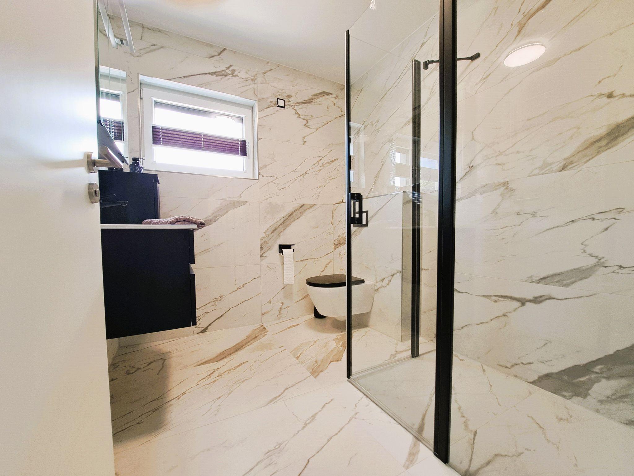Das Tageslichtbadezimmer empfängt sie mit einer großen, ebenerdigen Dusche, einem modernen Waschtisch und einem WC.