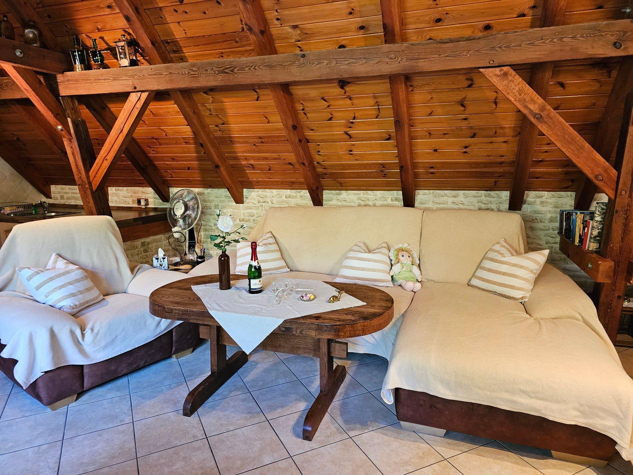 Die Wohnung erstreckt sich über 2 Etagen. Im Erdgeschoss befindet sich das mediterran gestaltete Bad, sowie das beheizte zum Entspannen einladende hauseigene Schwimmbad, welches Sie alleine nutzen! Über die Treppe erreichen Sie das ausgebaute Dachgeschoss mit offener Küche und offenem Wohn-/Schlafbereich im rustikal und liebevoll eingerichtetem Stil. Der Garten bietet Fläche zum gemeinsamen Beisammensein und lädt zu gemütlichen Grillabenden ein.