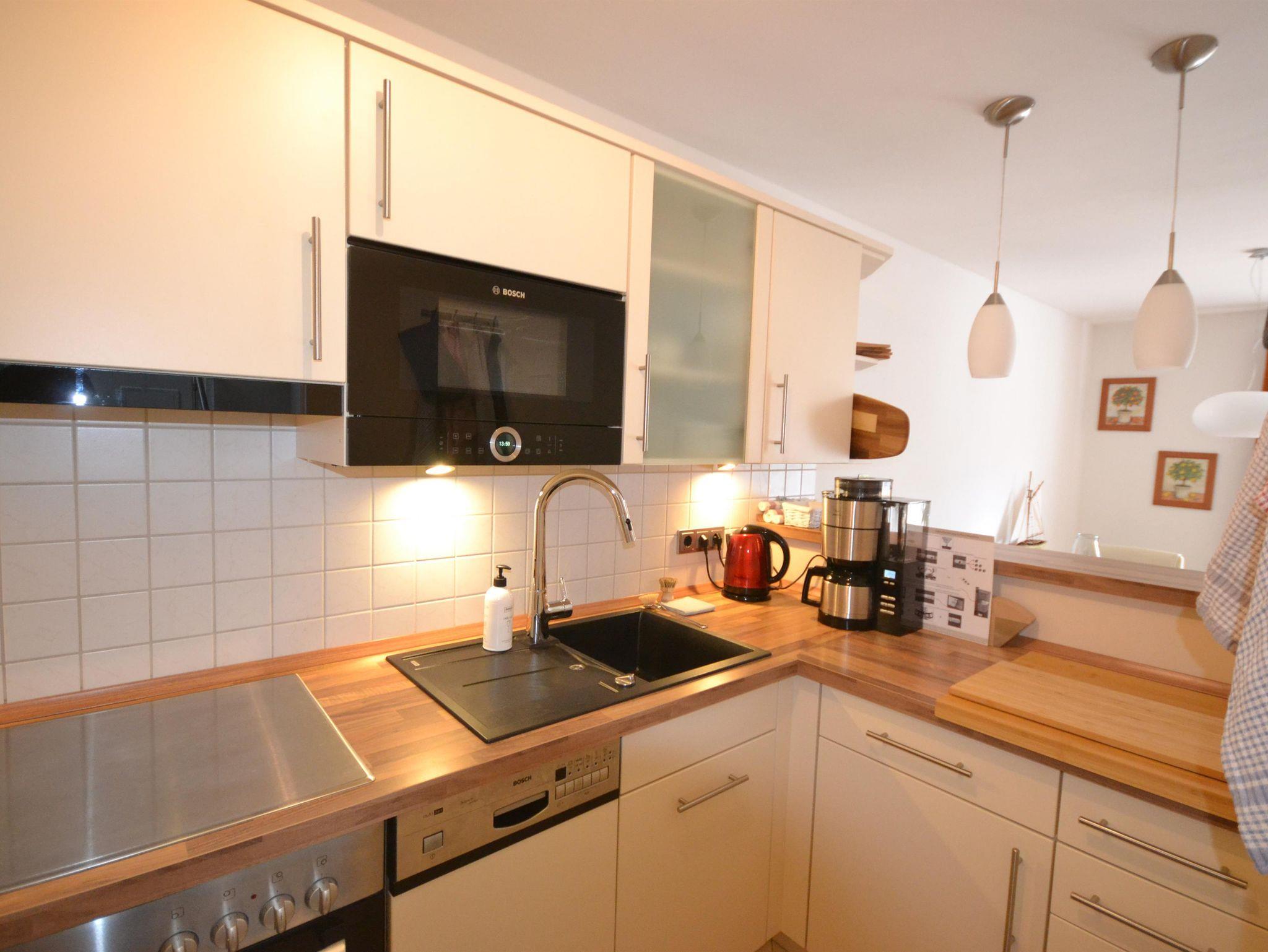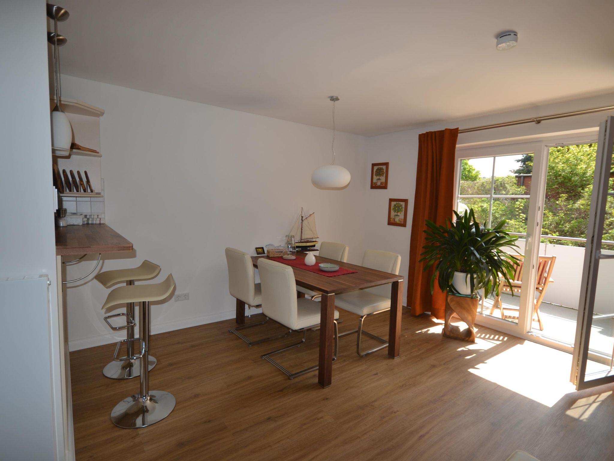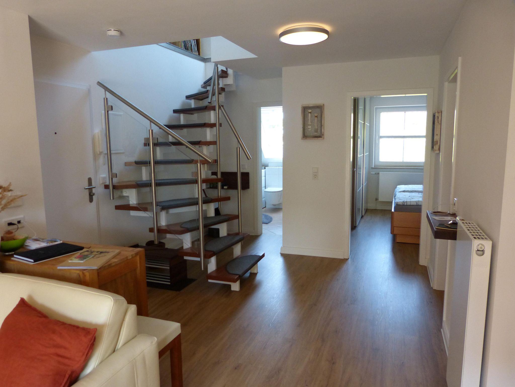 Die Ferienwohnung verfügt über ein großzügiges Wohnzimmer mit integrierter Küche, die mit einem Tresen vom Wohnbereich abgetrennt ist. Ein Schlafzimmer mit einem Doppelbett und das Badezimmer befinden sich auf der gleichen Etage, ein weiteres Schlafzimmer befindet sich im oberen Wohnbereich. Die Ferienwohnung mit großem Balkon ist komfortabel ausgestattet, sie verfügt über alle Annehmlichkeiten, die Sie in Ihrem Urlaub zur Erholung brauchen. Wir freuen uns auf Sie!