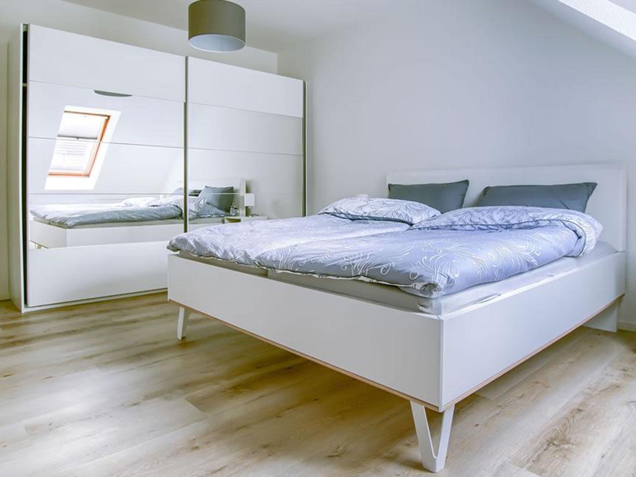 Das Schlafzimmer mit dem großen und gemütlichen Doppelbett sorgt für erholsamen Schlaf nach einem erlebnisreichen Urlaubstag. Der Kleiderschrank bietet genügend Platz für Ihre Urlaubsgarderobe.
