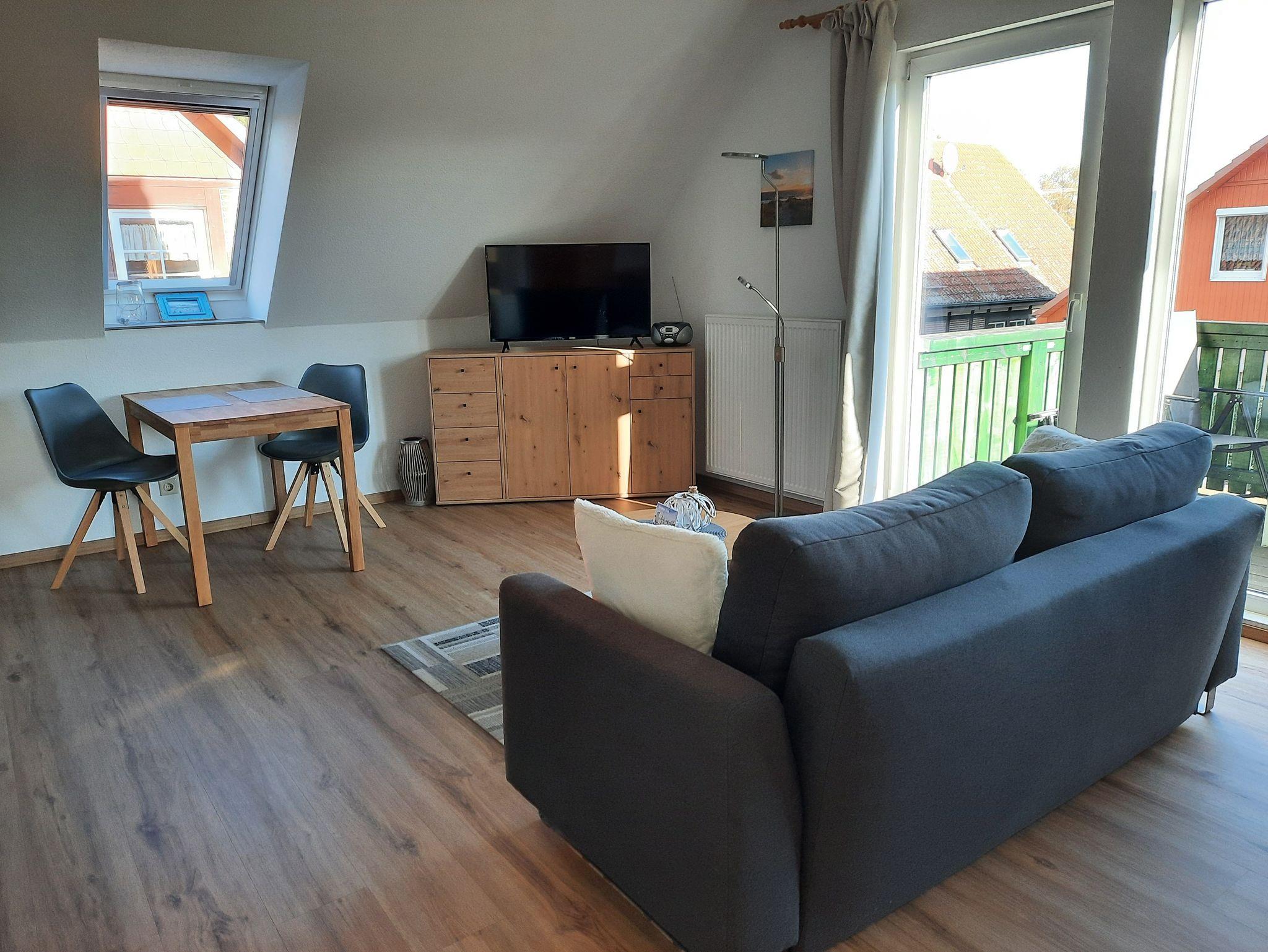 Die ca. 35qm große Ferienwohnung verfügt über einen kombinierten Wohn-Schlafraum mit einer gemütlichen Couchecke mit Flat-TV und Esstisch sowie der angrenzenden, offenen Küche mit Backofen, Cerankochfeld, Kühlschrank mit Gefrierfach, Geschirrspüler, Kaffeemaschine, Wasserkocher und Toaster. Das Doppelbett befindet sich optisch abgeteilt in der Nische.Das Badezimmer verfügt über eine Dusche, Waschbecken, WC und einen Haartrockner. W-LAN steht Ihnen kostenfrei zur Verfügung.