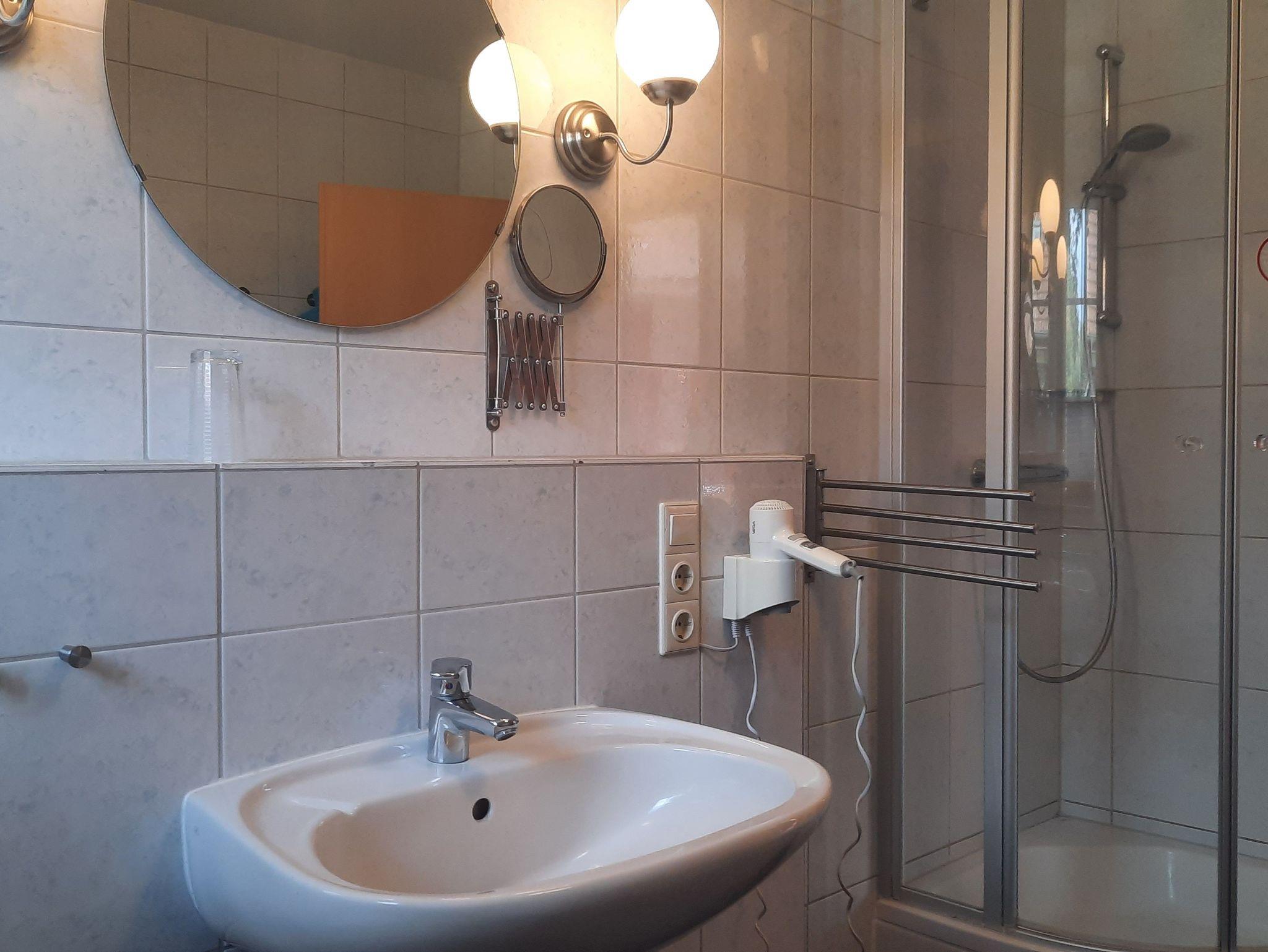 Das Tageslicht-Badezimmer verfügt sowohl über eine Dusche als auch eine Badewanne sowie aschbecken,Spiegel, WC, Ablagefläche und Haartrockner.