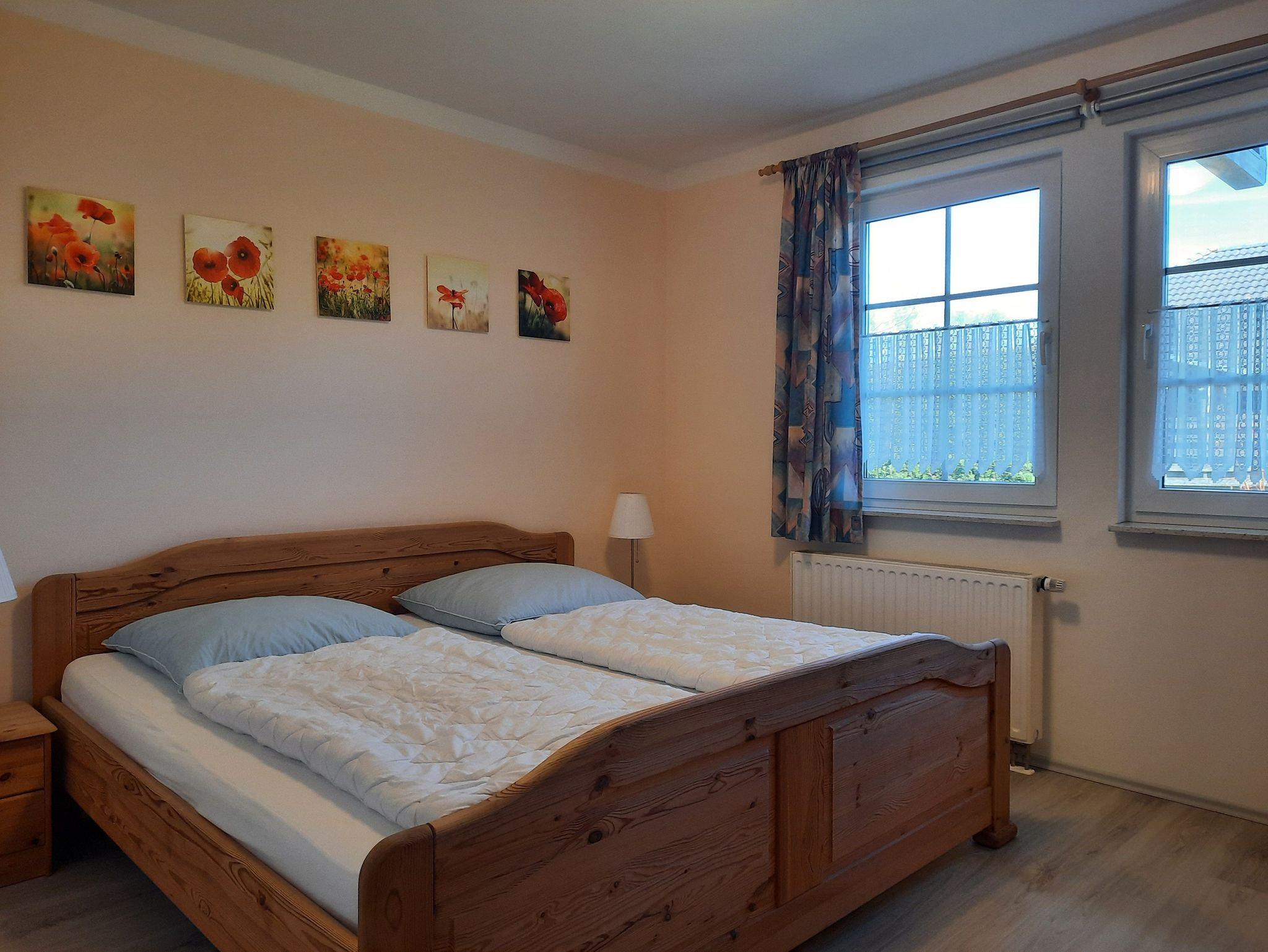 Erdgeschosswohnung: 64 m², 2 Schlafzimmer, WohnnEssbereich, Küche, Bad (Dusche + Badewanne), Terrasse + Garten mit Grill, WLAN, Parkplatz am Haus, 2 Hunde willkommen