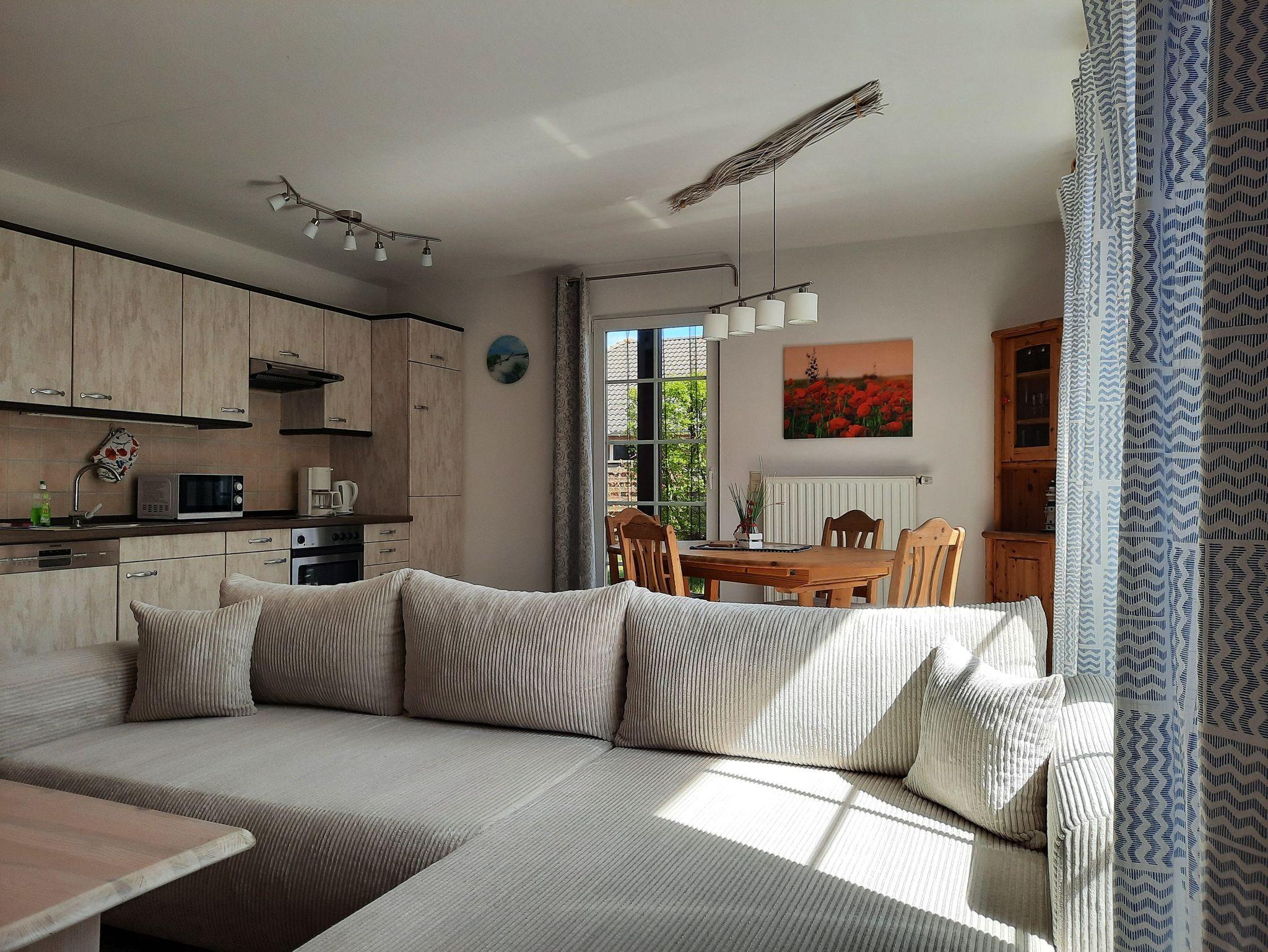 Der Wohn- und Essbereich ist gemütlich mit zwei Sofas, Couchtisch und Kommode eingerichtet. Flachbild-TV, Stereoanlage, CD-Player und WLAN bieten Ihnen Unterhaltungsmöglichkeiten. Der Essbereich lädt zu gemeinsamen Mahlzeiten und Spieleabenden ein. Von hier aus geht es auf die überdachte, möblierte Terrasse. Im eigenen umzäunten Garten steht ein Grill zur Verfügung.
