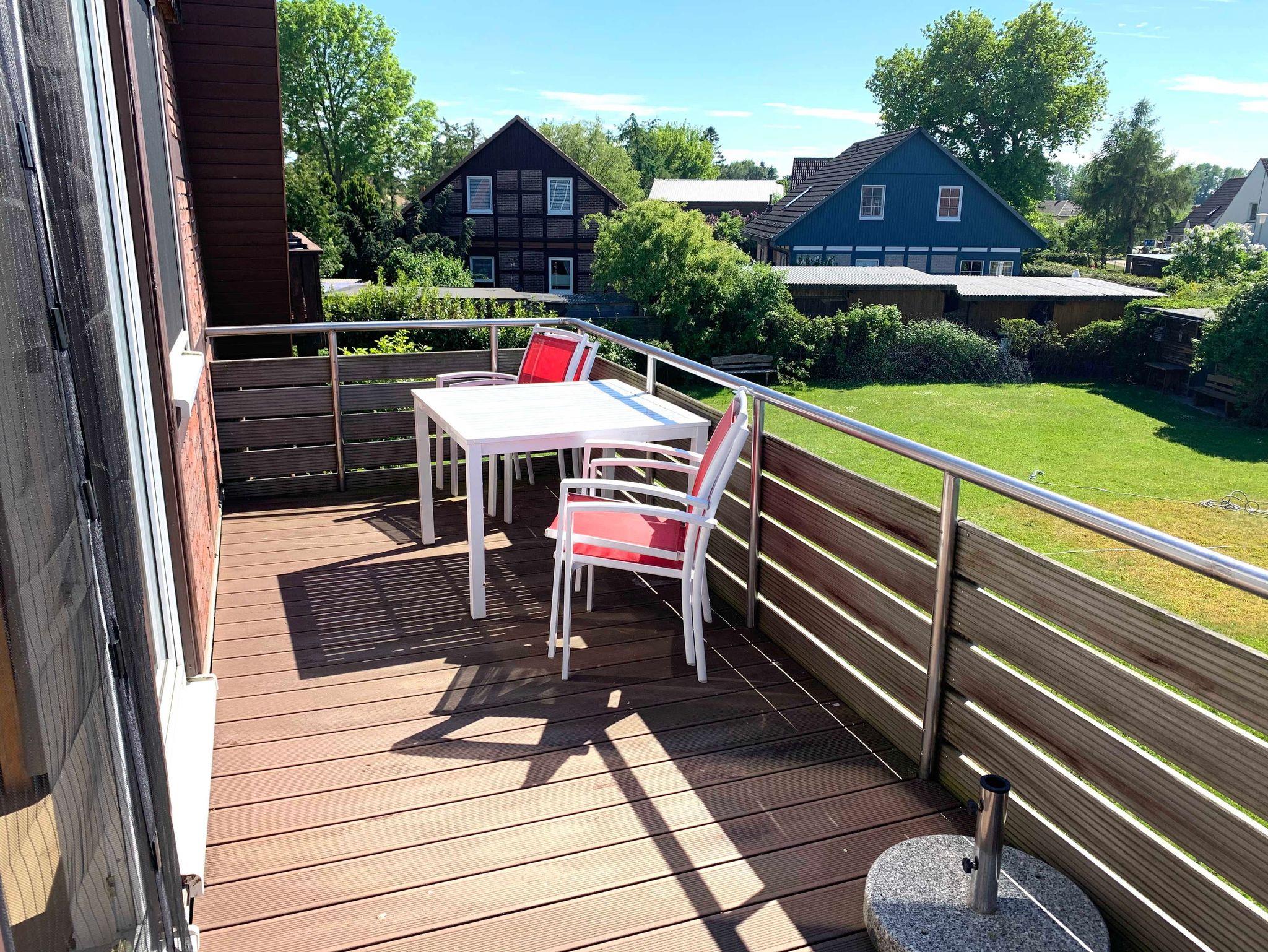 Zudem verfügt die Ferienwohnung über einen 16 qm großen Balkon mit geräumiger Sitzgruppe und Sonnenschirm.
