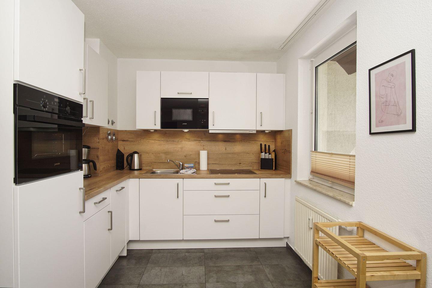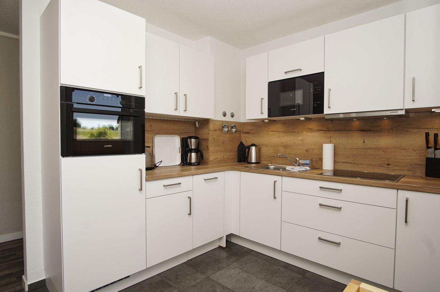 KÜCHE // Küchenzeile, 4-Platten Herd, Spülmaschine, Kühlschrank mit Gefrierfach, Mikrowelle, Backofen, Toaster, Wasserkocher, Kaffeemaschine, reichlich Besteck, Geschirr und Küchenutensilien ++