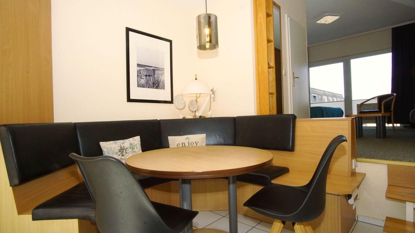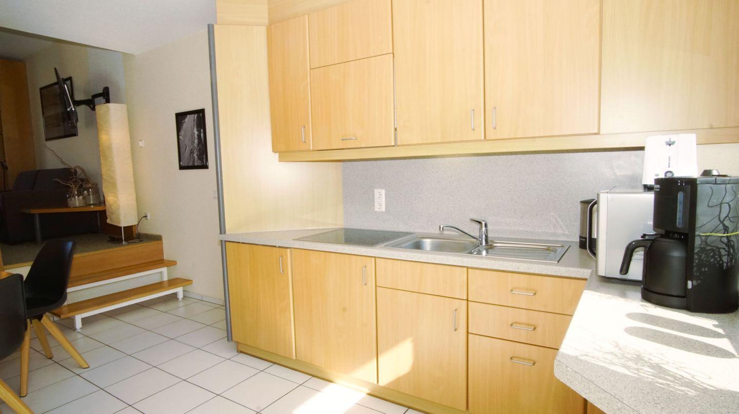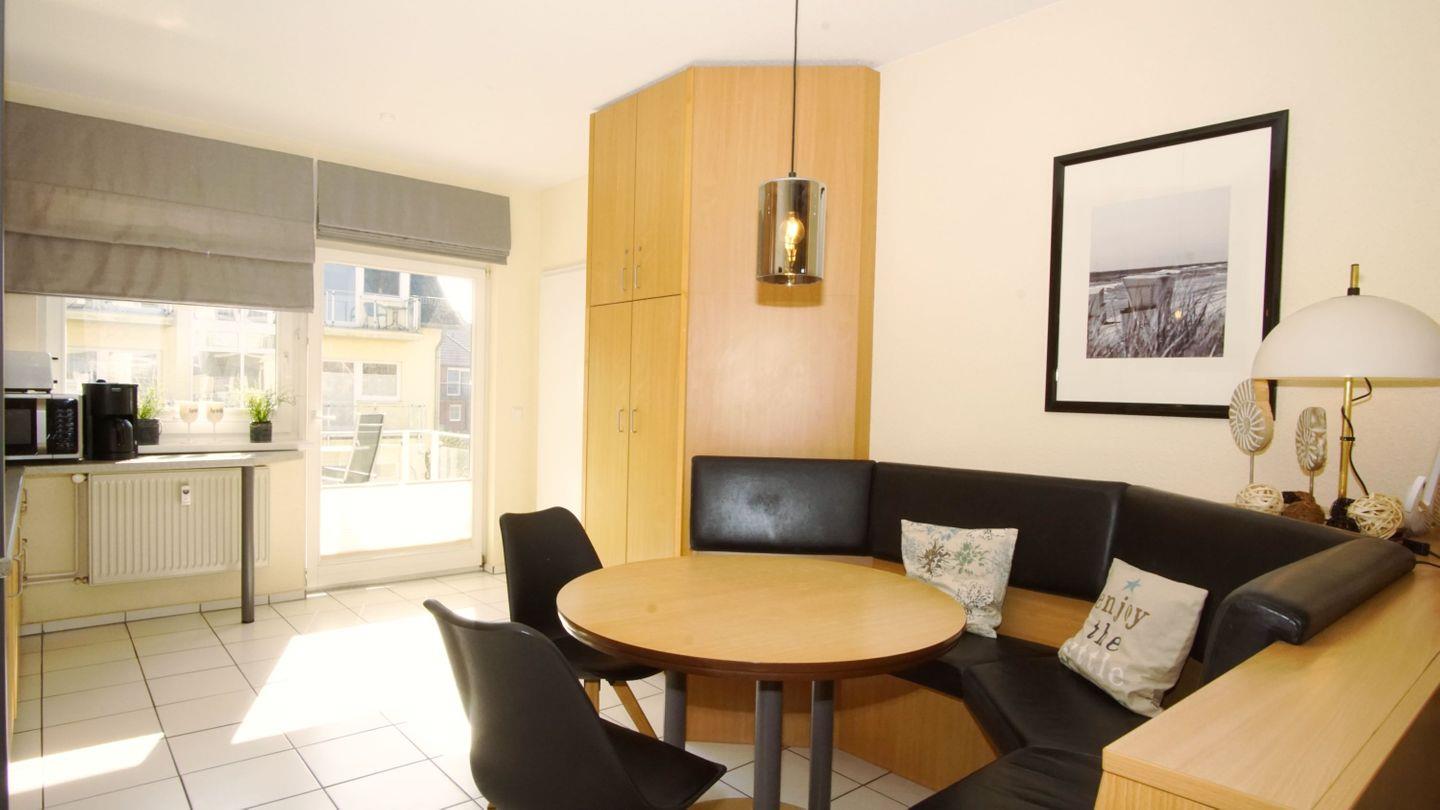 KÜCHE // offene Küche mit Essbereich, 4-Feld Induktionsherd, Kühlschrank mit Gefrierfach, Toaster, Wasserkocher, Kaffeemaschine, Mikrowelle mit Heißluftbackofen- und Grillfunktion, reichlich Geschirr und Küchenutensilien, Zugang zum Balkon ++