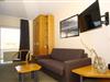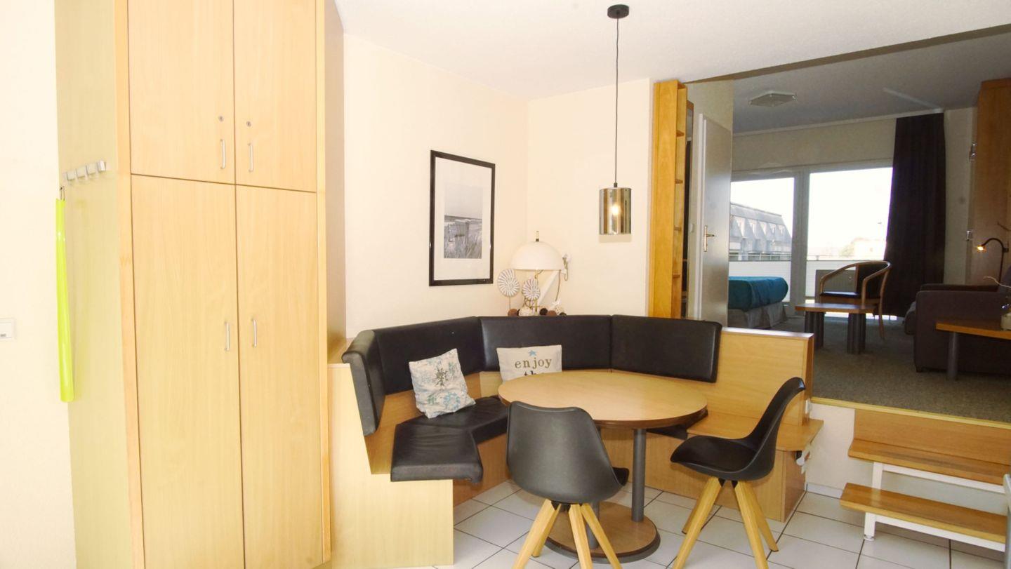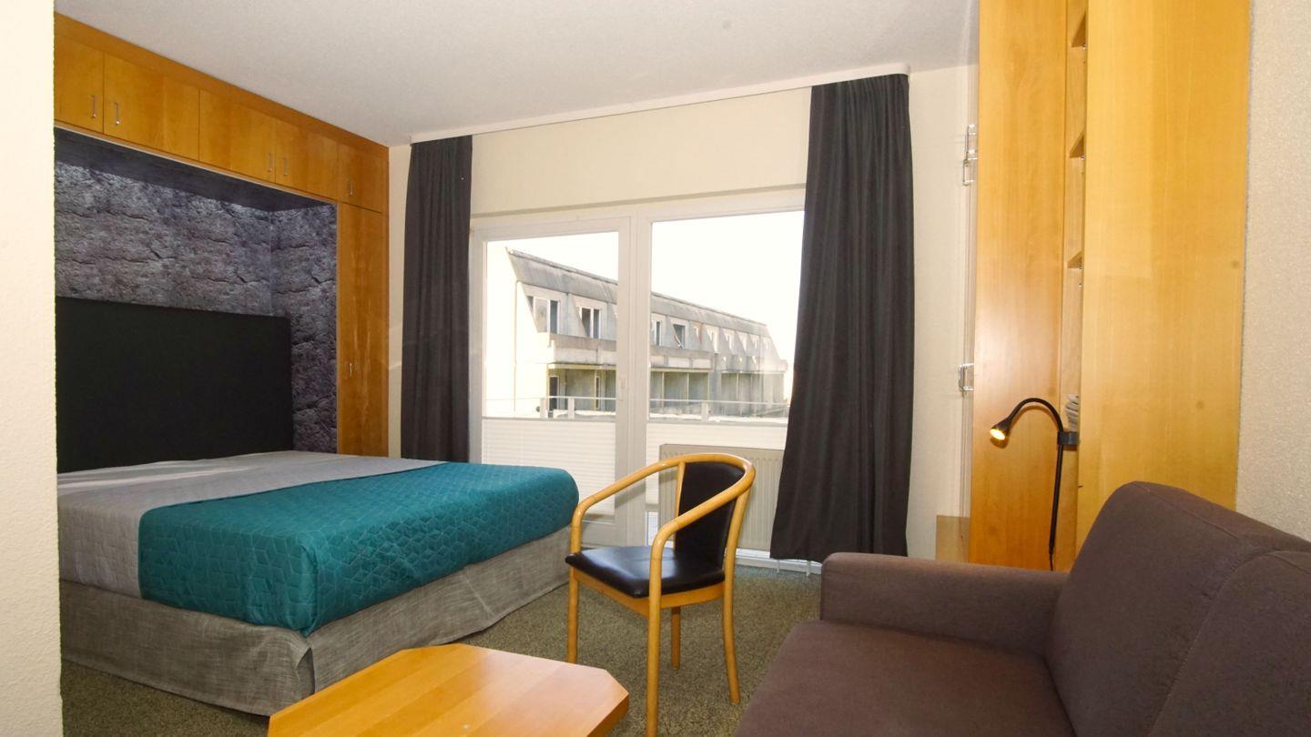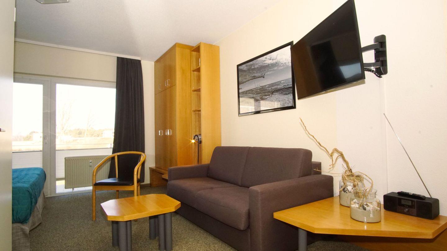 WOHNEN+SCHLAFEN // Wohnraum mit Schlafcouch, Kabel-TV, Radio, Zugang zum Balkon & mit bequemem Doppelbett, Kleiderschrank++