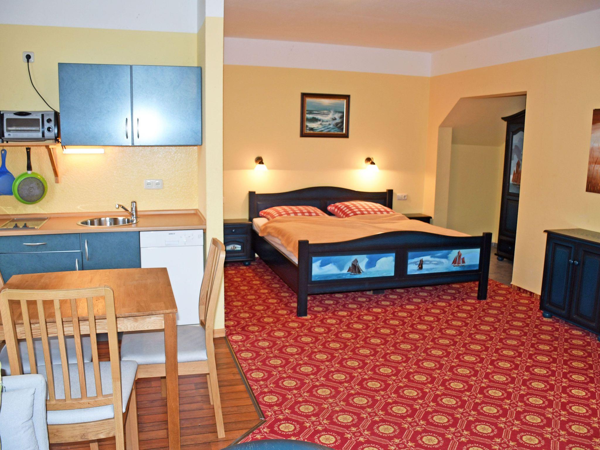 Dieses Ferienappartement verfügt über einen separaten Eingang und liegt im Erdgeschoss. Sie ist ca. 35 qm groß, bietet Platz für maximal 3 Erwachsene und wurde modern eingerichtet. Das 1-Raum-Appartement ist unterteilt in Schlaf,- Wohn- und Küchenbereich.