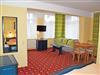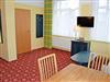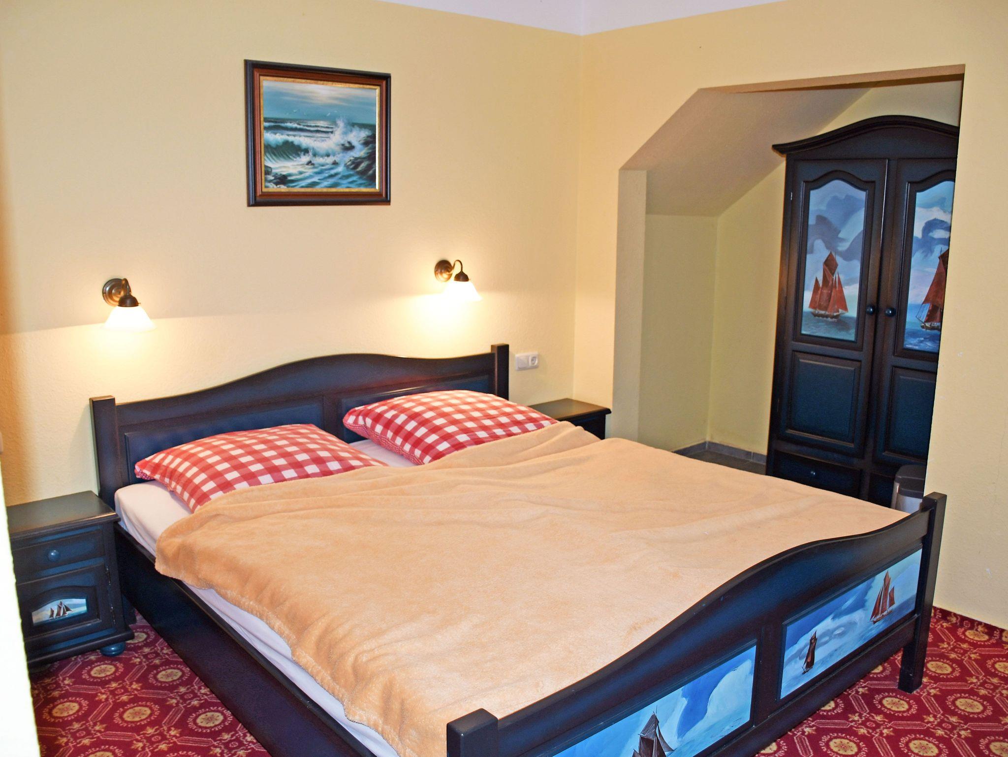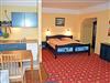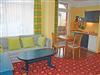 Im kombinierten Wohn-/Schlafraum befinden sich ein bequemes Doppelbett mit Nachttischen und Leselampen sowie ein Kleiderschrank, eine Schlafcouch mit Tisch und ein TV-Gerät. Hier steht auch ein Esstisch mit Stühlen.