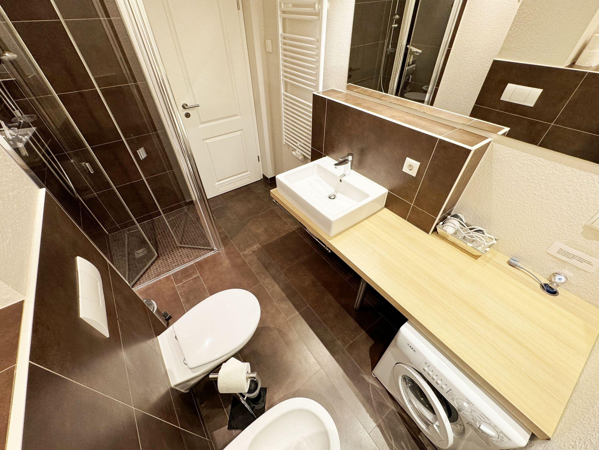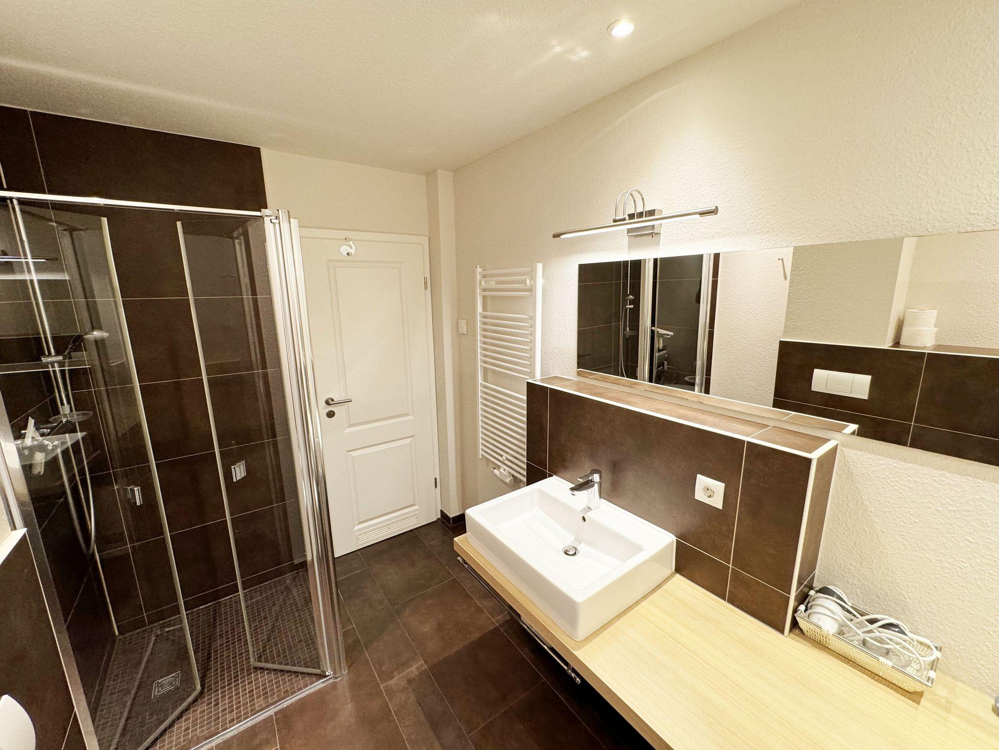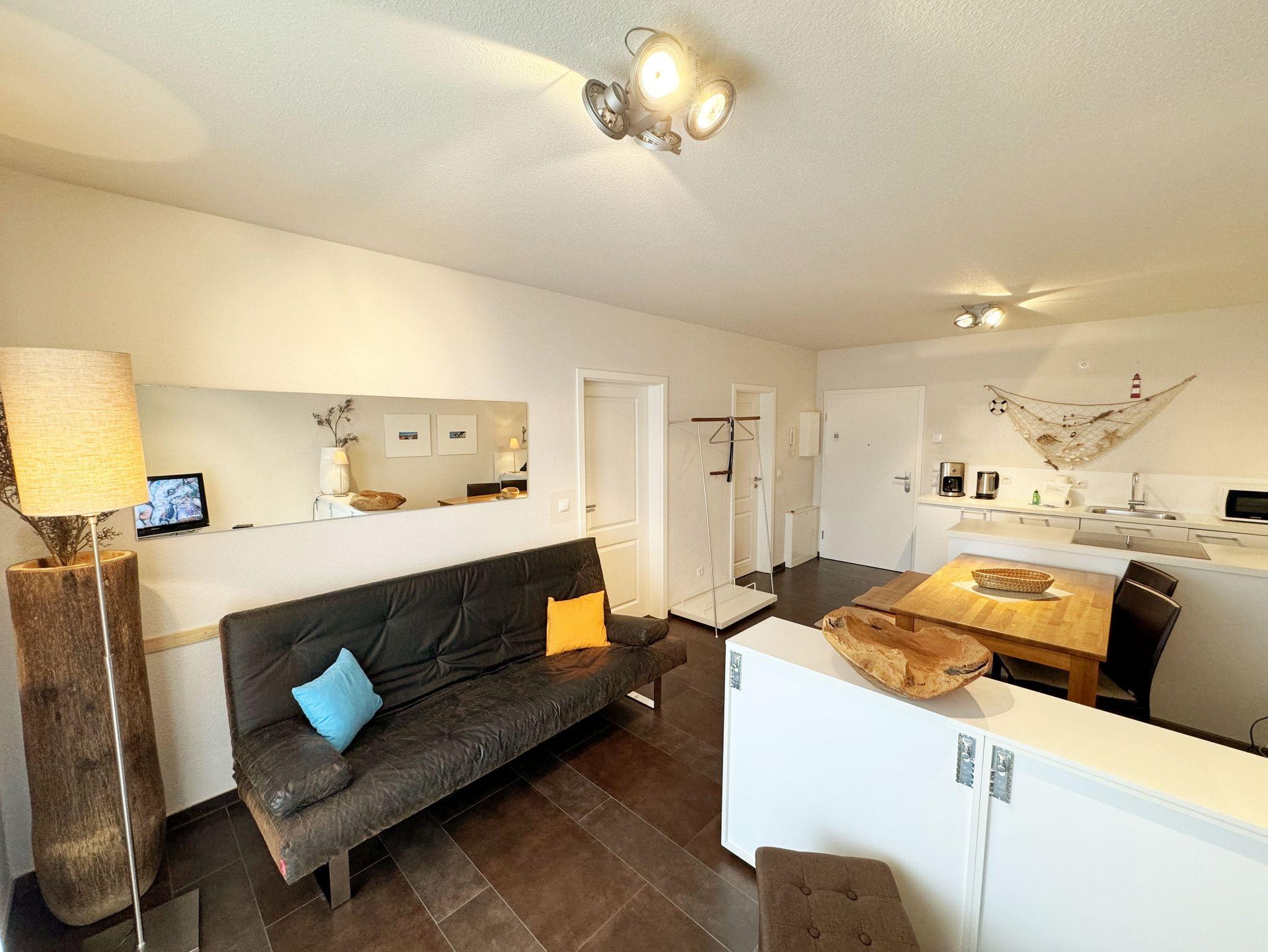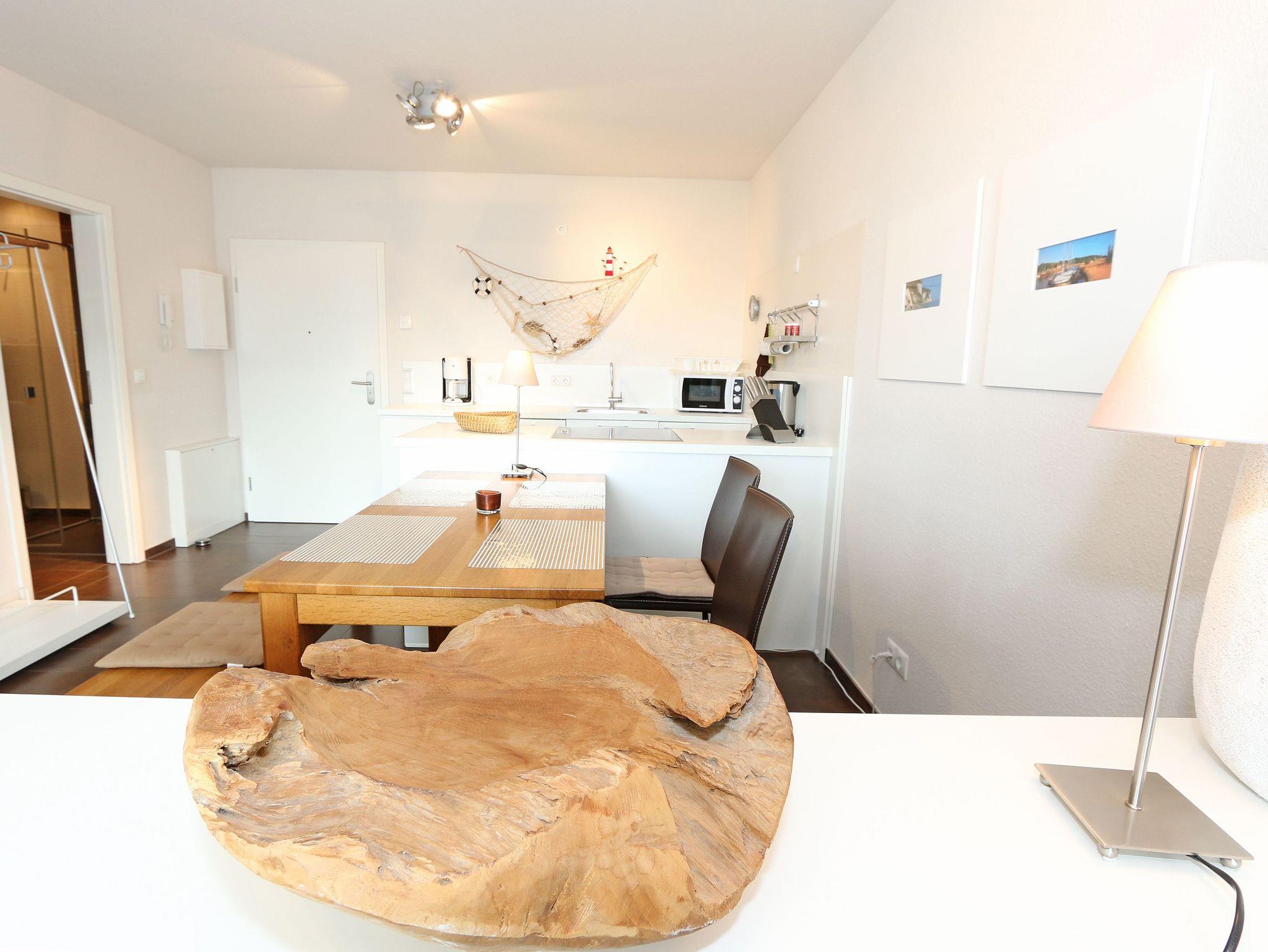 Die hochwertige 2-Zimmer Nichtraucherwohnung ?Düne 9 befindet sich im 1. OG und verfügt über eine Wohnfläche von ca. 50 qm. Ideal ist die Wohnung für 3 Erwachsene geeignet. Der zu der Wohnung gehörende überdachte und bestuhlte Balkon mit Sonnenschirm hat eine sonnige Süd/West Ausrichtung mit transparenter Balkonabtrennung und lädt zum Verweilen ein. Das großzügige Wohnzimmer ist mit einem Essbereich (Esstisch 1,40m x 75 cm, 2 Lederstühlen und Holzbank), einer Leselampe, einer geschmackvollen weißen Wohnzimmereinrichtung und einem Relaxsofa (kann zu einer Schlaffunktion für die 3. Person ausgeklappt werden, 1,40m x 2,00m) ausgestattet. Der angrenzende Küchenbereich umfasst ein 4-Zonen Ceranfeld, Backofen, Kühlschrank, Geschirrspüler, Mikrowelle, Wasserkocher, Mixer, Toaster, Kaffeemaschine, Eierkocher und diverse Küchenutensilien. Abgerundet wird der Wohnbereich von einem LCD-Flachbildschirm (32 Zoll / Full HD), kleine Hi-Fi Compactanlage mit CD und USB und einen DVD/Blu-Ray-Player. Auch im Urlaub brauchen Sie auf einen Internetanschluss (WLAN) nicht verzichten. Dieser ist für Sie inklusive. Das Schlafzimmer ist mit einem Doppelbett (1,80m x 2,00m) und Nachttischkonsolen ausgestattet. Das offene Schranksystem und der zusätzliche Spiegelschrank bieten genügend Stauraum für Ihre Kleidung. Der Wohn- und Schlafbereich sind mit elektrischen Außenjalousien und Insektenschutzgittern versehen und bieten daher einen ungestörten Schlaf. Das hochwertige Bad ist mit einer flachen Glasdusche, WC, Bidet, Waschmaschine (AEG Lavamat), Waschtisch, Spiegelbeleuchtung, Fön, Kosmetikspiegel und Handtuchheizung ausgestattet. In allen Räumen sorgt eine Fußbodenheizung für angenehme Wärme. Die Wohnung ist für Haustiere nicht erlaubt! Ein eigener PKW-Stellplatz Nr.09 befindet sich auf dem Grundstück, mitgebrachte oder gemietete Fahrräder können im wohnungseigenen Abstellraum untergestellt werden. Die Erstausstattung eines Wäschepaketes (komplette Bettwäsche, 1 Duschhandtuch, 2 kleine Handtücher) können Sie bis 14 Tage vor Anreise gegen einen Aufpreis dazu buchen oder durch eigene ergänzen. Ab 2 gebuchten Paketen erhalten Sie einmalig 1 Geschirrhandtuch und 1 Duschvorleger hinzu.