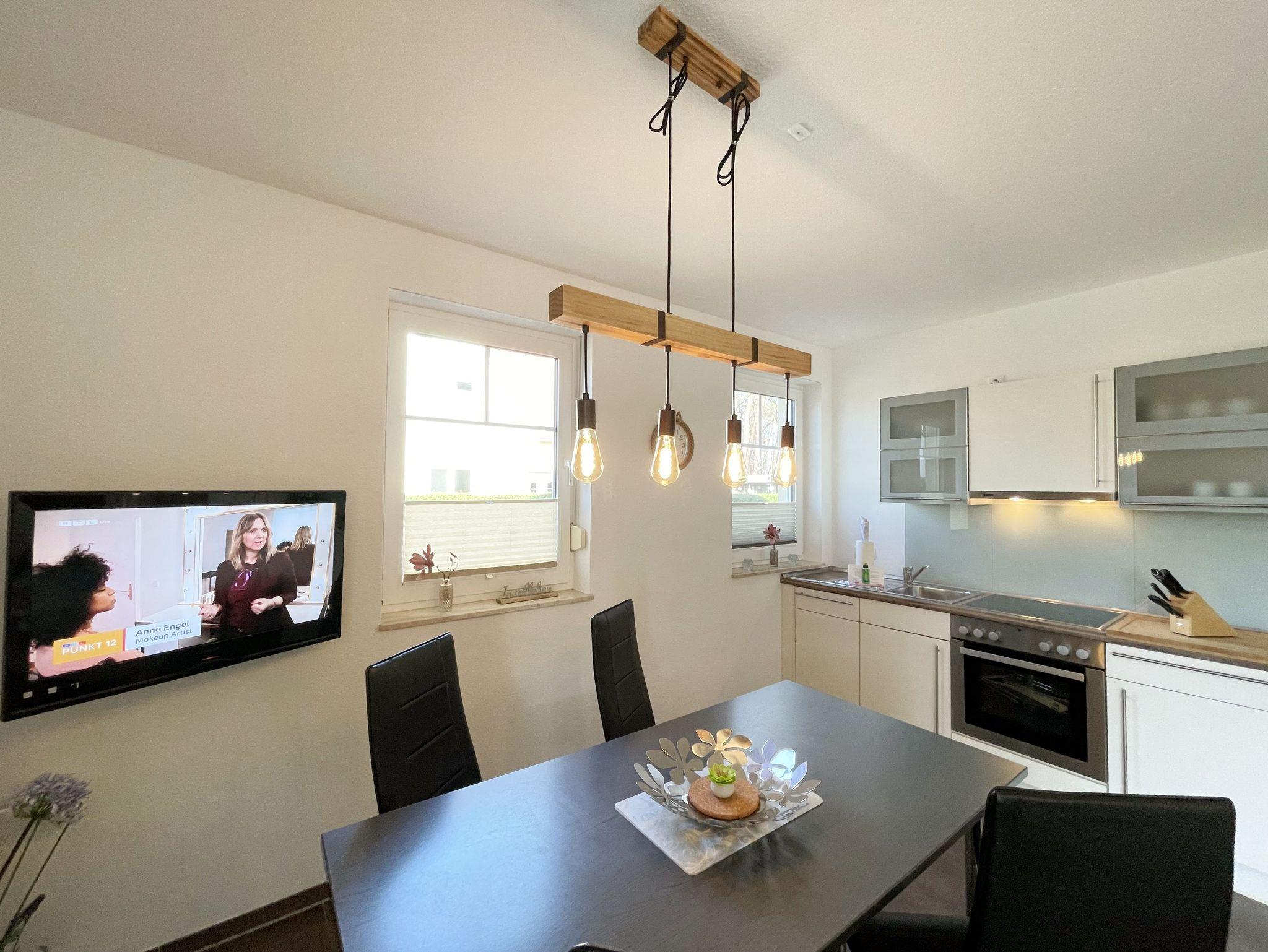 Die Nichtraucherferienwohnung Nr. 05 LEON befindet sich im Erdgeschoss des Hauses und verfügt über eine Wohnfläche von ca. 54 qm. Die Ferienwohnung ist für 2 bis max. 4 Personen ausgelegt. Im kombinierten Wohn- und Essbereich befindet sich eine integrierte Küchenzeile. Die komplett ausgestattete Küchenzeile verfügt über ein Cerankochfeld, Backofen, Dunstabzugshaube, Kühlschrank mit Gefrierfach, Spülmaschine, Kaffeemaschine, Mikrowelle, Wasserkocher, Toaster und weitere diverse Küchenutensilien. Der Esstisch mit Bestuhlung ist für 4 Personen geeignet. Das im Wohnbereich vorhandene Schlafcouch verfügt über eine Ausziehfunktion und kann von 2 Personen gut genutzt werden (1,48m x 1,95m). Ein kleiner Couchtisch, eine Mini-Stereoanlage mit DAB-Radio, USB-Anschluss, Bluetooth und ein Flachbildfernseher runden den Wohnbereich ab. Von hier aus gelangen Sie auf die nach Süd/West ausgerichtete Terrasse mit Tisch und 4 Stühlen. Die Terrassenfenster haben Außenjalousien. Auch im Urlaub brauchen Sie auf einen Internetanschluss (WLAN) nicht verzichten. Dieser ist für Sie inklusive. Das im Schlafbereich vorhandene Doppelbett hat eine Größe von 1,80 m x 2,00 m mit H2/H3 Matratzen sowie verstellbare Lattenroste. Außerdem verfügt das Zimmer über Nachttischkonsolen und einen Kleiderschrank, zur Unterbringung der Kleidung. Das komfortable Bad rundet mit einem WC, Waschtisch, Fön, Dusche und Handtuchwärmeheizkörper die Wohnung komplett ab. In allen Räumen sorgt eine Fußbodenheizung für angenehme Wärme. Die bestuhlte Terrasse erreichen Sie vom Wohnbereich, welche zusätzlich mit einem Sonnenschirm ausgestattet ist. Insektenschutzgitter sind vorhanden. Ein eigener PKW-Stellplatz (Nr.05) befindet sich auf dem Grundstück. Mitgebrachte oder gemietete Fahrräder können im wohnungseigenen Abstellraum untergestellt werden. Haustiere sind nicht erlaubt. Die Erstausstattung eines Wäschepaketes (komplette Bettwäsche, 1 Duschhandtuch, 2 kleine Handtücher) können Sie bis 14 Tage vor Anreise gegen einen Aufpreis dazu buchen oder durch eigene ergänzen. Ab 2 gebuchten Paketen erhalten Sie einmalig 1 Geschirrhandtuch und 1 Duschvorleger dazu.