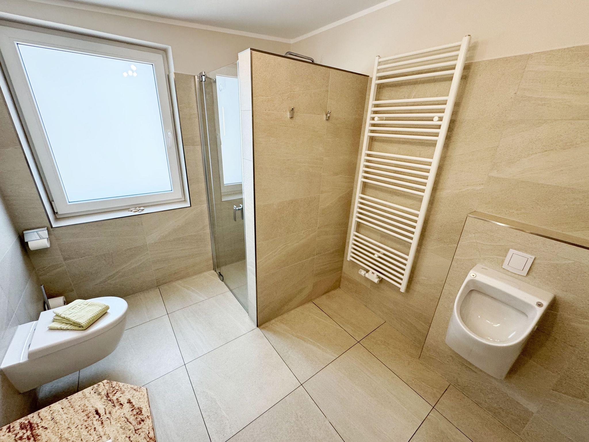 Die Ferienwohnung (Nichtraucher) Nr. 1, ca. 97 m², befindet sich im Erdgeschoss eines 6 Familienhauses auf 4.500 m² großem Grundstück in Einzellage ohne Publikums- und PKW-Verkehr. Die Wohnung ist nach Süden ausgerichtet und verfügt über zwei Badezimmer, zwei verdunkelbare Schlafzimmer, einen ca. 36 m² großen Wohn- und Essbereich sowie einer nicht einsehbaren ca. 25 m² Südterrasse. Es stehen 5 Betten (2 Doppelbetten - (Größe 1,80 m x 2,00 m) und 1 Einzelbett 0,90m x 2,00m) sowie eine Schlafcouch (1,30m 2,00m) zur Verfügung. Die Matratzen der Doppelbetten haben die Härtegrade 2 und 3. Das ausziehbare Schlafsofa verfügt über eine hochwertige Kaltschaummatratze. Die Wohnung kann mit bis zu 6 Personen belegt werden. Vom Wohnbereich und der Terrasse eröffnet sich ein weiter Blick über die unmittelbar vor dem Haus gelegene Ostsee. Die einzigen Geräusche sind der Wind und das Rauschen des Meeres. Die Wohnung erfüllt in ihrer Ausstattung höchste Ansprüche. Erlesene Baumaterialien und Einrichtungsgegenstände vermitteln ein Gefühl des Genießens von Luxus. Nur beispielhaft sei erwähnt, dass das Badezimmer mit Granitwaschtisch, Fön, Fußbodenheizung und Handtuchheizkörper eingerichtet ist. In dem Flur-, Wohn- und Schlafraum sind hochwertige italienische Lake-Stone-Fliesen verlegt worden. Die Ausstattung besteht aus handgearbeiteten Massivholzmöbeln und komfortablen Betten. Die moderne, helle Küche beinhaltet einen Backofen und Ceran-Kochfeld, geräumigen Kühlschrank mit Gefrierfach und Geschirrspülmaschine. Die Küchenausstattung enthält an Kleinelektrogeräten Toaster, Kaffeemaschine, Wasser- und Eierkocher sowie Handmixer. Der Essbereich ist möbliert mit einem massiven Tisch aus geölter Wildeiche und Lederschwingstühlen in der Farbe mocca. Flachbildfernseher, Internetanschluss WLAN, sowie Mini-Stereo Anlage mit USB sind vorhanden. Eine original finnische Sauna mit moderner Dusche und Ruheliegen steht allen Gästen gegen Gebühr zur Verfügung. Die Terrasse ist mit komfortablen Möbeln für ein Genießen von Sonne, der nahen See und einem gemütlichen Beisammensein ausgerichtet. Die Parkplätze und ein überdachter Fahrradunterstand stehen kostenlos zur Verfügung. Ein ca. 3.000 m² großes Rasengrundstück, am Haus und an der Ostseeküste gelegen, steht zur Freizeitgestaltung mit Grillplatz zur Verfügung. Für unsere kleinen Gäste steht 1x Kinderreisebett (ohne Zusatzmatratze, ohne Bettinlett) und 1 Hochstuhl inklusive bereit. 1 Haustier ist gegen eine Gebühr ein gern gesehener Gast. Die Erstausstattung eines Wäschepaketes (komplette Bettwäsche, 1 Duschhandtuch, 2 kleine Handtücher, 2 Geschirrhandtücher) können Sie bis 14 Tage vor Anreise gegen einen Aufpreis dazu buchen oder durch eigene ergänzen.