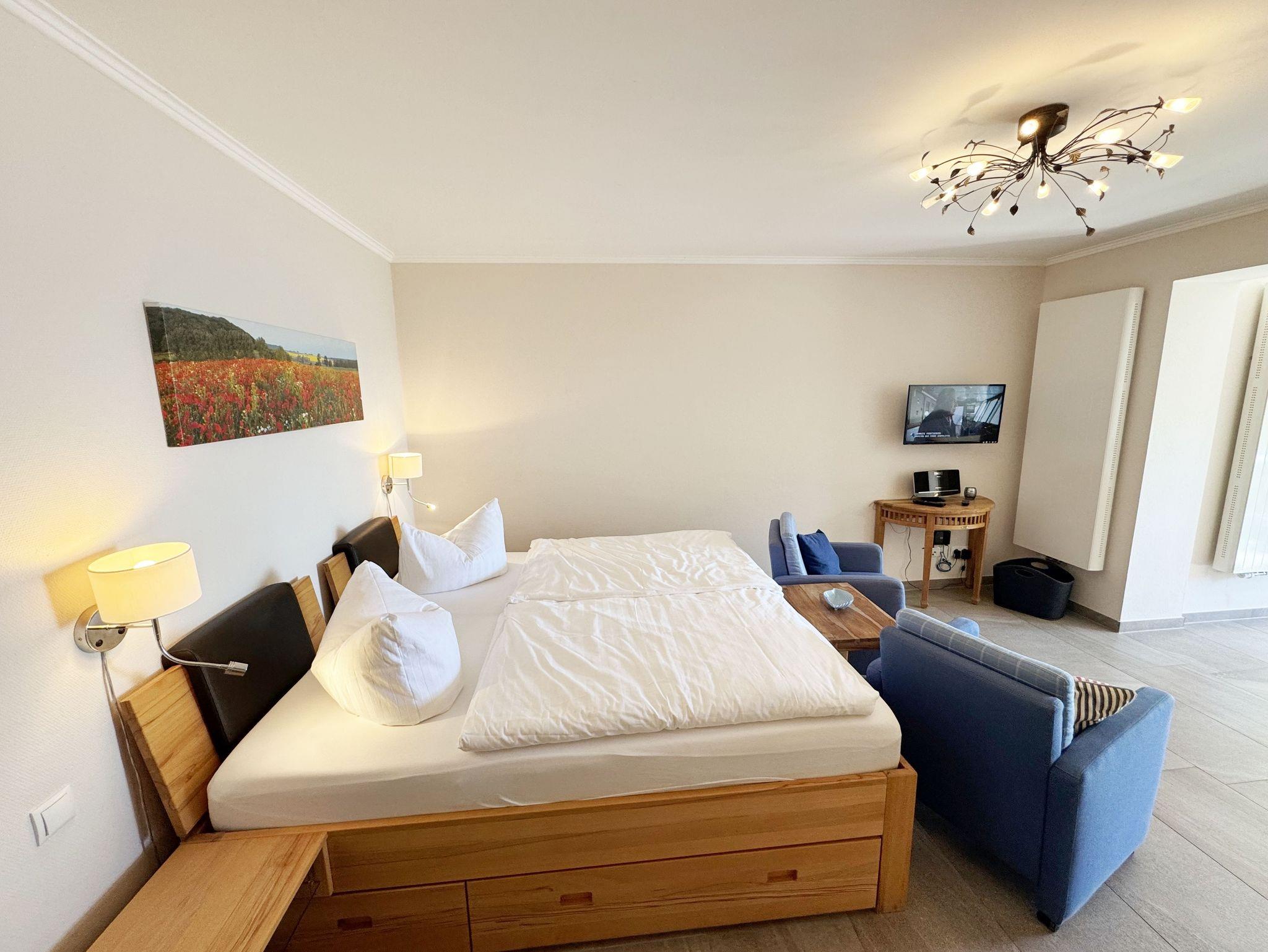 Die Ferienwohnung (Nichtraucher) Nr. 2, ca. 35 m², für bis zu 2 Personen, befindet sich im Erdgeschoss eines 6 Familienhauses auf dem 4.500 m² großen Grundstück in Einzellage ohne Publikums- und PKW-Verkehr. Die Wohnung ist nach Süden ausgerichtet und verfügt über ein Badezimmer und über einen kombinierten, verdunkelbaren Wohn-/Schlafbereich sowie über eine nicht einsehbare ca. 12 m² große Südterrasse. Von hier eröffnet sich ein grandioser Panoramablick über die unmittelbar vor dem Haus liegende Ostsee. Die einzigen Geräusche sind der Wind und das Rauschen des Meeres. Direkt vor den ebenerdigen großen Fenstern befindet sich der gemütliche, sonnige Essbereich. Das komfortable Doppelbett (Größe 1,80 m x 2,00 m) aus geölter, massiver Kernbuche ist ausgestattet mit Druckentlastenden, atmungsaktiven und körperunterstützenden Geltex Kaltschaummatratzen. Die Matratze des Doppelbettes hat die Härtegrade 2 und 3. Von hieraus genießen Sie sogar schon beim Aufwachen den faszinierenden Meerblick- das ist Urlaub pur. Die Wohnung erfüllt ihrer Ausstattung höchste Ansprüche. Erlesene Baumaterialien und Einrichtungsgegenstände vermitteln ein Gefühl des Genießens von Luxus. Nur beispielhaft sei erwähnt, dass das Badezimmer mit Granitwaschtisch, Fön, Fußbodenheizung und Handtuchheizkörper eingerichtet ist. In dem Flur und dem Wohn/Schlafraum sind hochwertige italienische Lake-Stone-Fliesen verlegt worden. Die moderne Küche beinhaltet ein Ceran-Kochfeld, Kühlschrank mit Gefrierfach, Geschirrspülmaschine und Mikrowelle. Die Küchenausstattung enthält an Kleinelektrogeräten Toaster, Kaffeemaschine, Wasser- und Eierkocher sowie Handmixer. Der Essbereich ist möbliert mit einem massiven Tisch aus geölter Wildeiche und Lederschwingstühlen in der Farbe mocca. Flachbildfernseher, Internetanschluss WLAN sowie Mini-Stereo Anlage mit USB sind vorhanden. Eine original finnische Sauna mit moderner Dusche und Ruheliegen steht allen Gästen gegen Gebühr zur Verfügung. Die Terrasse ist mit komfortablen Möbeln für ein Genießen von Sonne, der nahen See und einem gemütlichen Beisammensein ausgerichtet. Die Parkplätze und ein überdachter Fahrradunterstand stehen kostenlos zur Verfügung. Ein ca. 3.000 m² großes Rasengrundstück, am Haus und an der Ostseeküste gelegen, steht zur Freizeitgestaltung mit Grillplatz zur Verfügung. 1 Haustier ist gegen eine Gebühr ein gern gesehener Gast. Die Erstausstattung eines Wäschepaketes (komplette Bettwäsche, 1 Duschhandtuch, 2 kleine Handtücher, 2 Geschirrhandtücher) können Sie bis 14 Tage vor Anreise gegen einen Aufpreis dazu buchen oder durch eigene ergänzen.