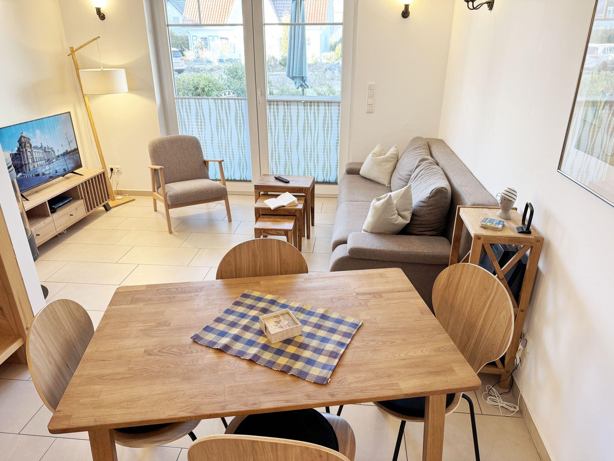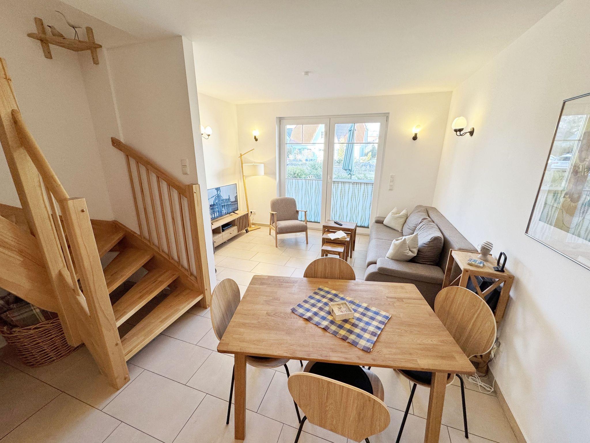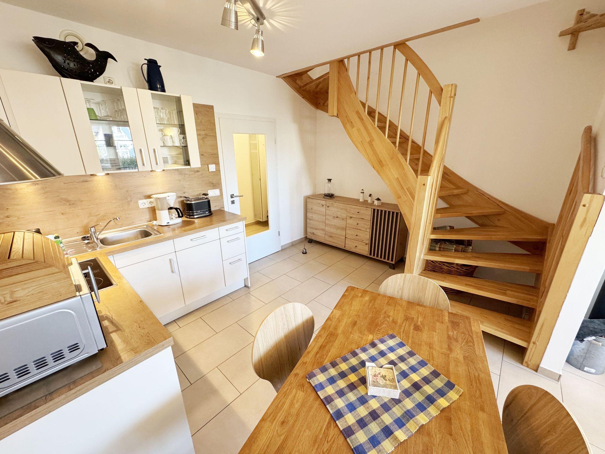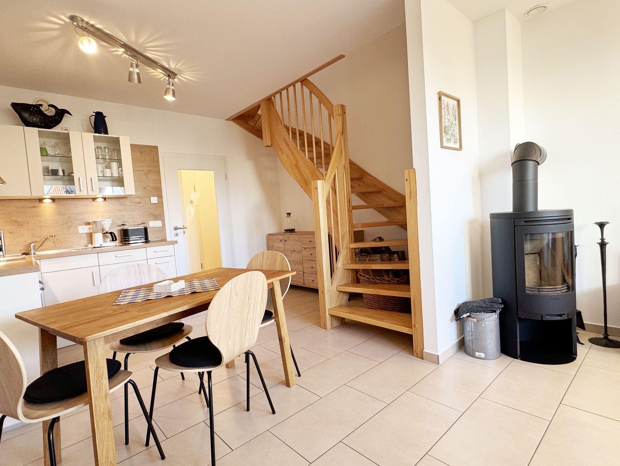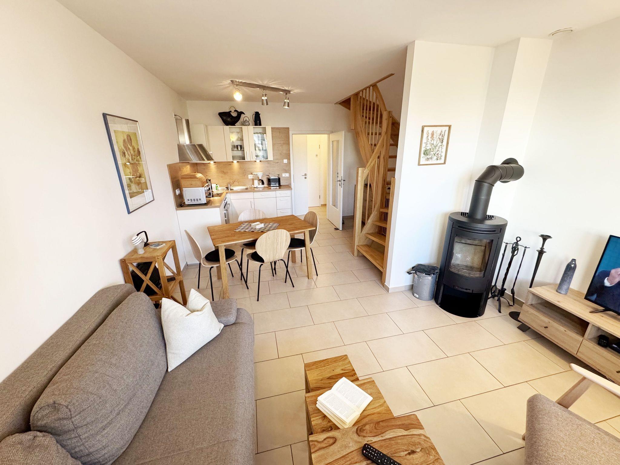 Im Haus „Möwe“ befindet sich die helle und gemütliche Zweizimmerwohnung (Nichtraucher) im Erdgeschoss und ist vom Privatparkplatz bequem zu erreichen. Die Maisonette Wohnung Nr. 02 verfügt auf 56 qm über allen Komfort, den man von zuhause gewöhnt ist und ist für 2 bis 4 Personen ausgerichtet. Von einem kleinen Flur mit Garderobe gelangt man in den hellen unteren Bereich der Wohnung. Sogleich fällt der Blick auf die geräumige Terrasse (westliche Ausrichtung), die mit einer Sitzgruppe + Sonnenliege für vier Personen und einem Sonnenschirm zum ruhigen Verweilen einlädt. Die gesamte untere Etage ist gefliest und mit einer Fußbodenheizung ausgestattet. Der untere Wohnbereich verfügt über eine bequeme Couch (1,50m x 2,00m), die auch als zusätzliche Schlafgelegenheit genutzt werden kann. Ein bequemer Sessel mit Leselampe vervollständigt das Ensemble. Kleine Beistelltische bieten immer eine Ablage, sodass man bei einem Kaffee oder einem Glas Wein eine entspannte Unterhaltung führen kann. Für die kälteren Tage ist ein Kaminofen vorhanden, der durch ein Sichtfeld das Kaminfeuer betrachten lässt. Je nach Bedarf kann man eine Stereoanlage nutzen, die neben Radio und CD-Laufwerk auch die Möglichkeit bietet, die eigene Musik vom iPod oder einem USB-Stick abzuspielen. Mit dem TV-Flat Screen mit DVD-Player kann man ruhig mal einen kleinen Filmabend gestalten. Um die Sache abzurunden, befindet sich in der Holzkommode eine reichhaltige DVD-Sammlung mit bekannten Filmen, die für Jung und Alt sicherlich etwas zu bieten hat. Auch im Urlaub brauchen Sie auf einen Internetanschluss (WLAN) nicht verzichten. Dieser ist für Sie inklusive. Die Küchenzeile lässt keine Wünsche offen. Neben einem Kühlschrank mit Gefrierfach und einem Kochherd mit Ceranfeld und Backofen sind alle Dinge vorhanden (Kaffeemaschine, Wasserkocher, Toaster, Mikrowelle) die man zur Zubereitung eines leckeren Mahls nach dem Strandaufenthalt benötigt. Damit man sich nicht dem Leid des Abwaschens im Urlaub hingeben muss, kann man den eingebauten Geschirrspüler nutzen, der für einen die Arbeit leise und unaufdringlich erledigt. Der Essbereich ist mit einem Tisch ausgestattet, an dem bis zu vier Personen Platz finden. Über eine Holztreppe gelangt man in die erste Etage. Dort befindet sich das innenliegende Bad mit Dusche und WC, Spiegelschrank und Fön. Um auf den Balkon zu kommen, durchschreitet man das Schlafzimmer. Der Raum ist wie das gesamte Stockwerk mit einem hellen Holzfußboden ausgelegt und eine Fußbodenheizung sorgt zu jeder Jahreszeit für ein angenehmes Klima. Für die persönlichen Sachen steht ein Kleiderschrank zur Verfügung. Jeweils an den Seiten des großen Doppelbettes (einzelne Matratzen á 0,90 m) für zwei Personen befinden sich Nachttischkonsolen mit Nachttischlampen. Sollten Sie ihre Urlaubslektüre vergessen haben, sind einige Angebote in der Wohnung zu finden. Durch die elektrischen Rollos, die sich im unteren und im oberen Stockwerk befinden, genügt ein Knopfdruck, um eine ungestörte Nacht zu verbringen, bzw. am Morgen die Sonne ins Zimmer zu lassen. Fahrräder kann man in einem abschließbaren Schuppen Nr.02, der sich in unmittelbarer Nähe des Hauses befindet, unterstellen. Ein PKW-Stellplatz Nr. 02 befindet sich direkt am Haus. Gegen eine Gebühr haben wir keine Probleme mit 1 Haustier, wenn dies gut erzogen ist! Die Erstausstattung eines Wäschepaketes (komplette Bettwäsche, 1 Duschhandtuch, 2 kleine Handtücher) können Sie bis 14 Tage vor Anreise gegen einen Aufpreis dazu buchen oder durch eigene ergänzen. Ab 2 gebuchten Paketen erhalten Sie einmalig 1 Geschirrhandtuch und 1 Duschvorleger hinzu.